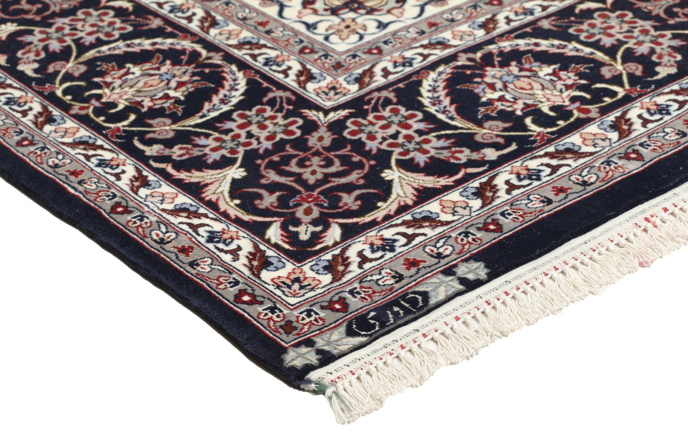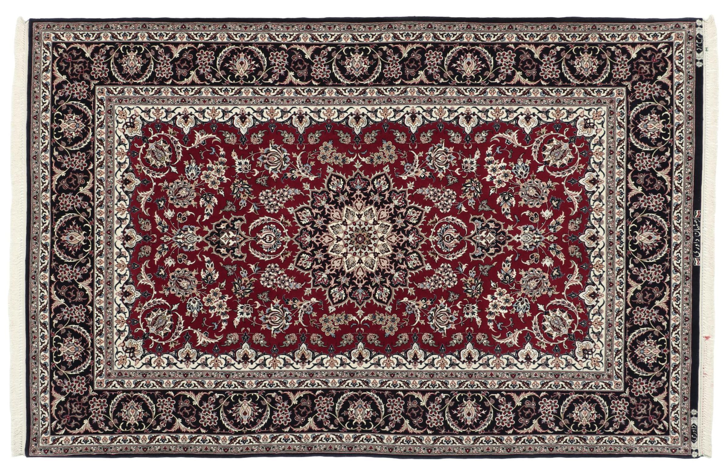 Esta alfombra de Ispahán está hecha con el arte del anudado más tradicional y elevado. Está magistralmente elaborada y decorada con fascinantes ornamentos. La alfombra persa fue anudada a mano en Isfahan, probablemente la ciudad más bella de Irán, a partir de los hilos más finos. Las alfombras de Isfahán se encuentran entre las persas más valiosas y pueden ser una verdadera inversión.