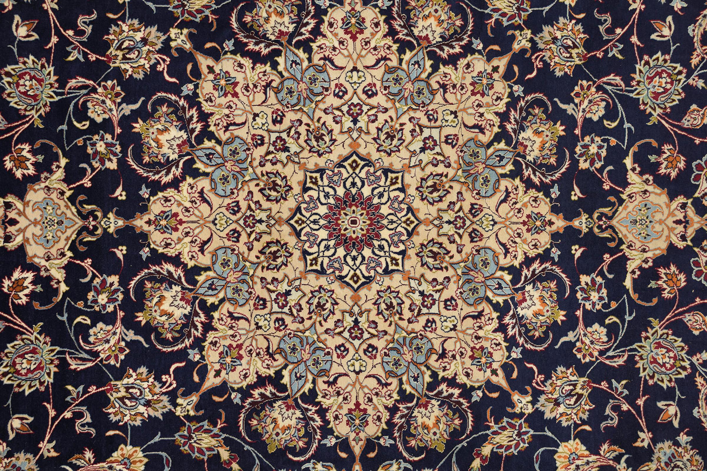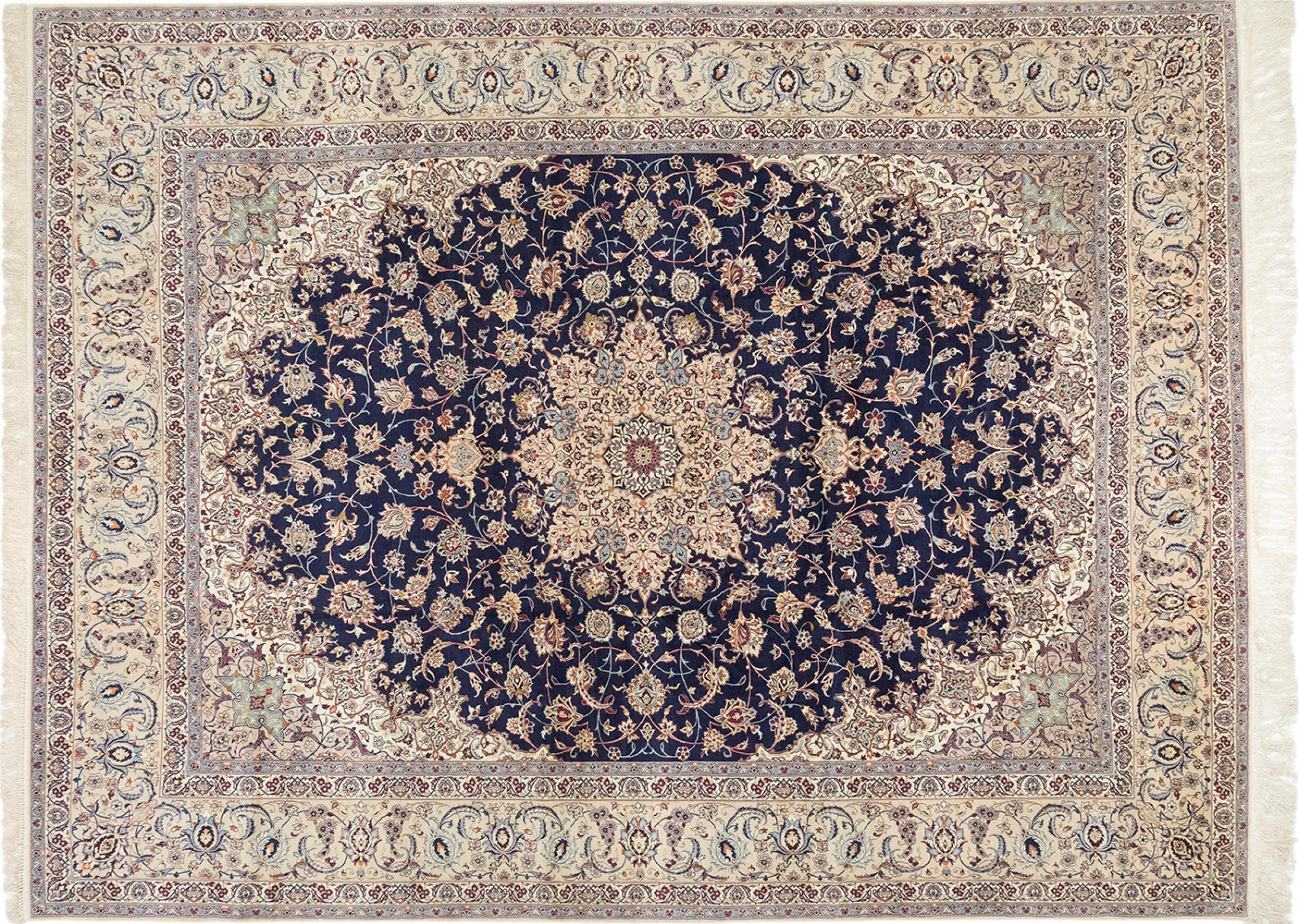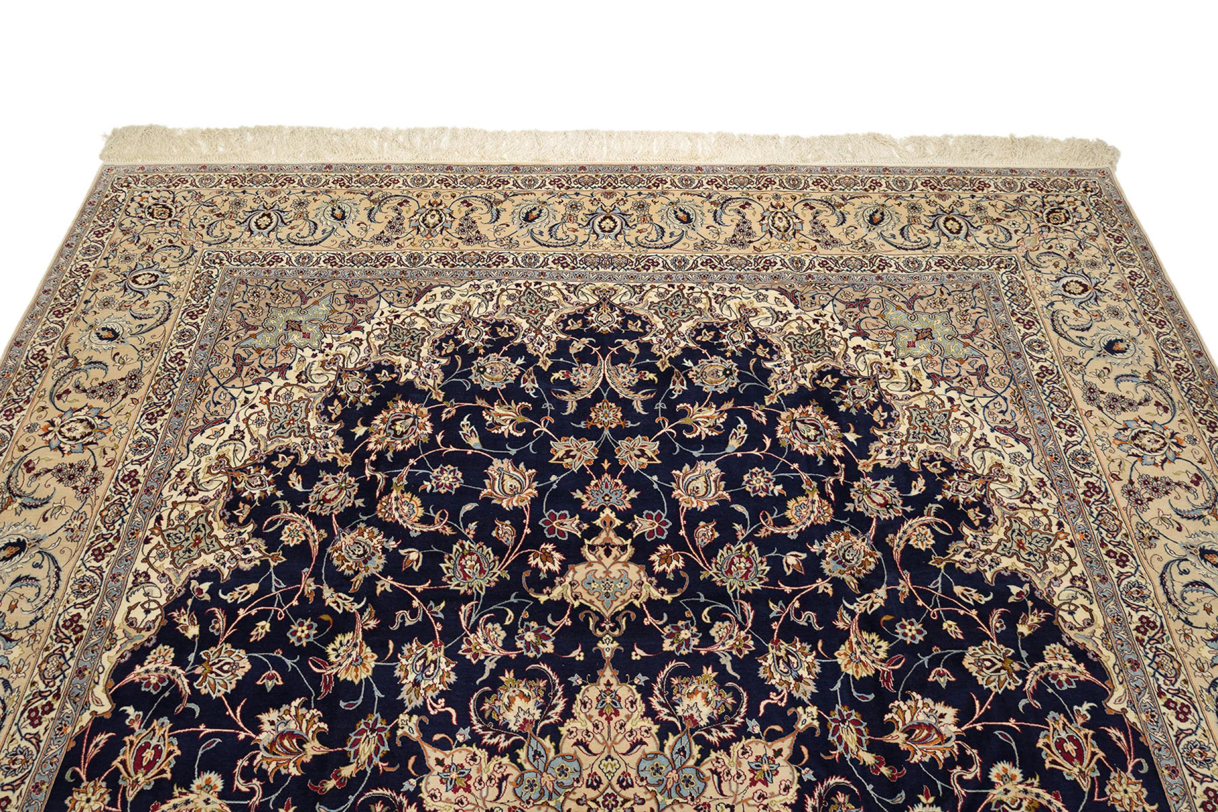 Esta alfombra de Ispahán está hecha con el arte del anudado más tradicional y elevado. Está magistralmente elaborada y decorada con fascinantes ornamentos. La alfombra persa fue anudada a mano en Isfahan, probablemente la ciudad más bella de Irán, a partir de los hilos más finos. Las alfombras de Isfahán se encuentran entre las persas más valiosas y pueden ser una verdadera inversión.