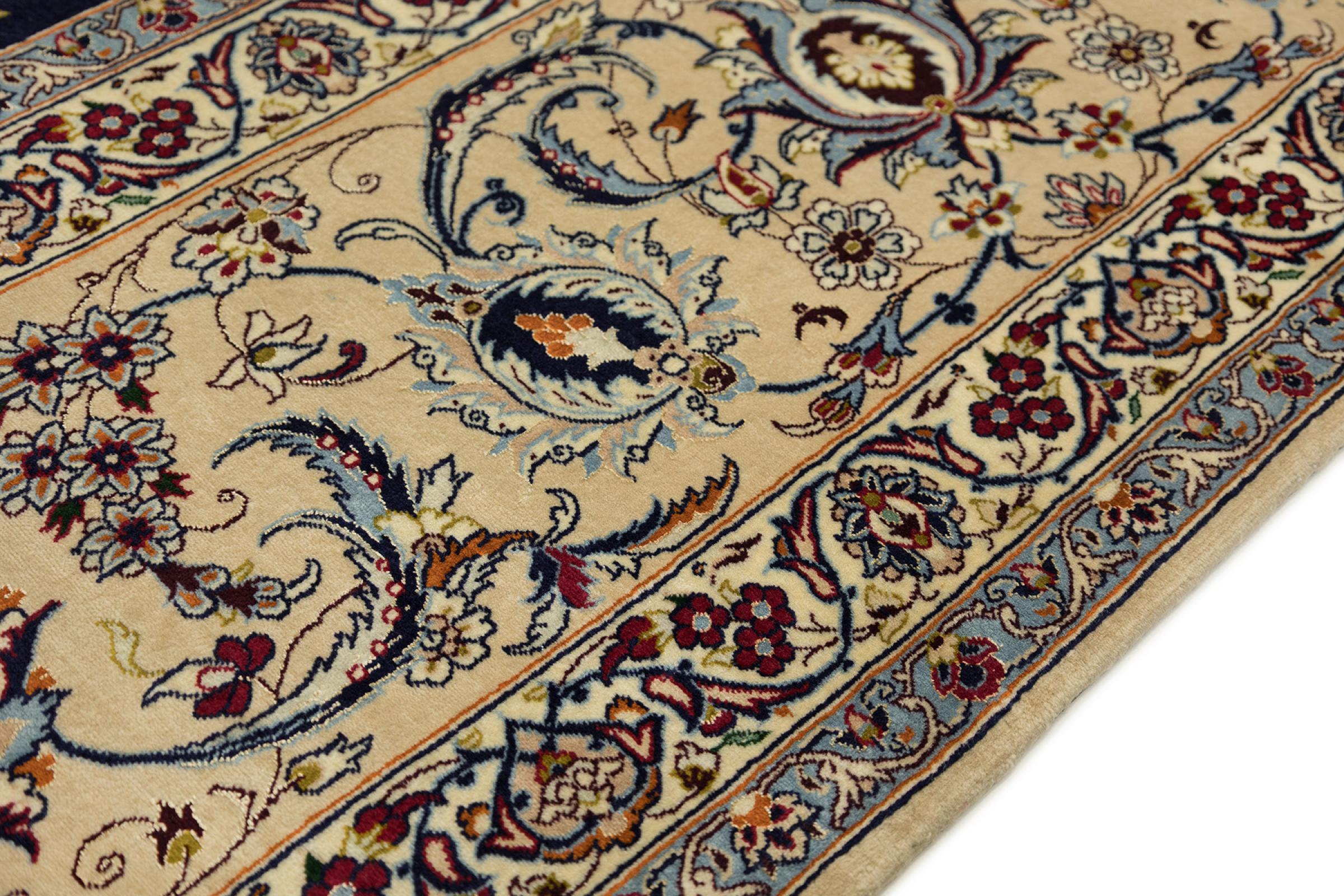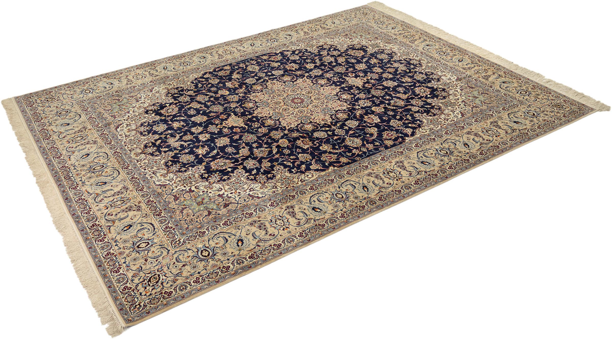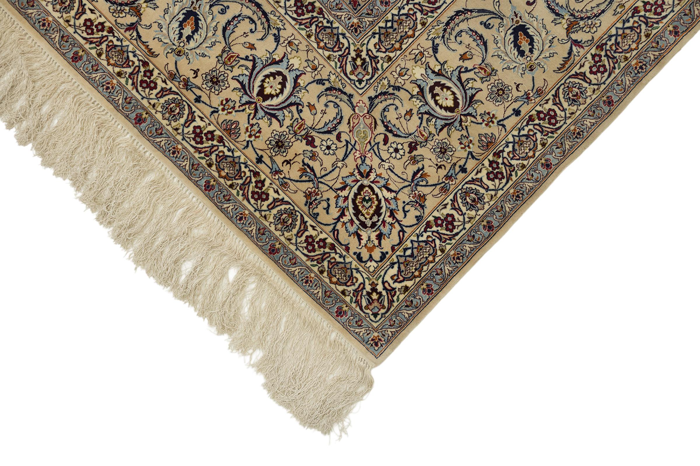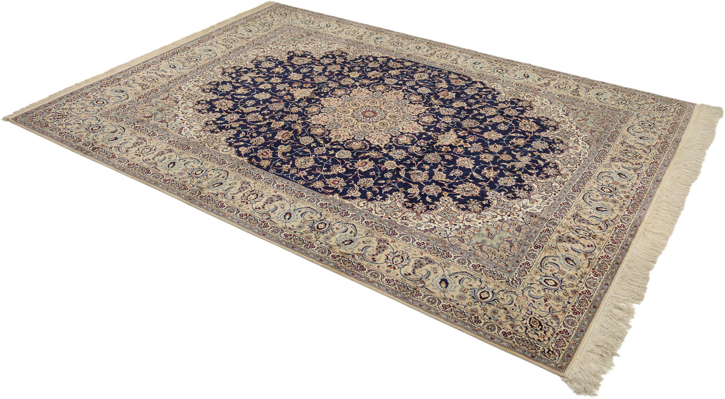 Esta alfombra de Ispahán está hecha con el arte del anudado más tradicional y elevado. Está magistralmente elaborada y decorada con fascinantes ornamentos. La alfombra persa fue anudada a mano en Isfahan, probablemente la ciudad más bella de Irán, a partir de los hilos más finos. Las alfombras de Isfahán se encuentran entre las persas más valiosas y pueden ser una verdadera inversión.