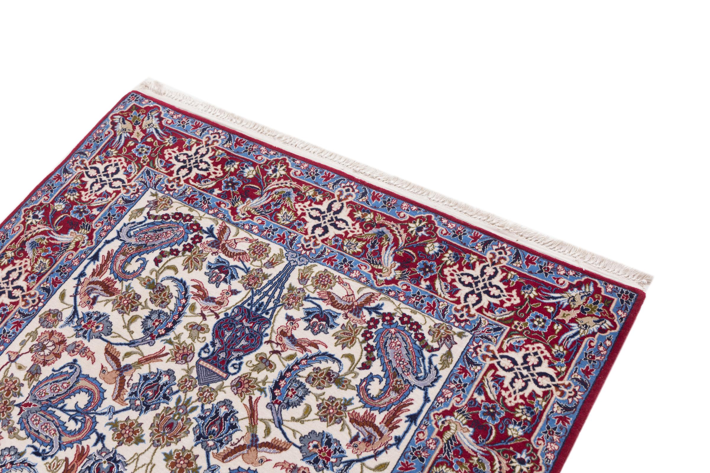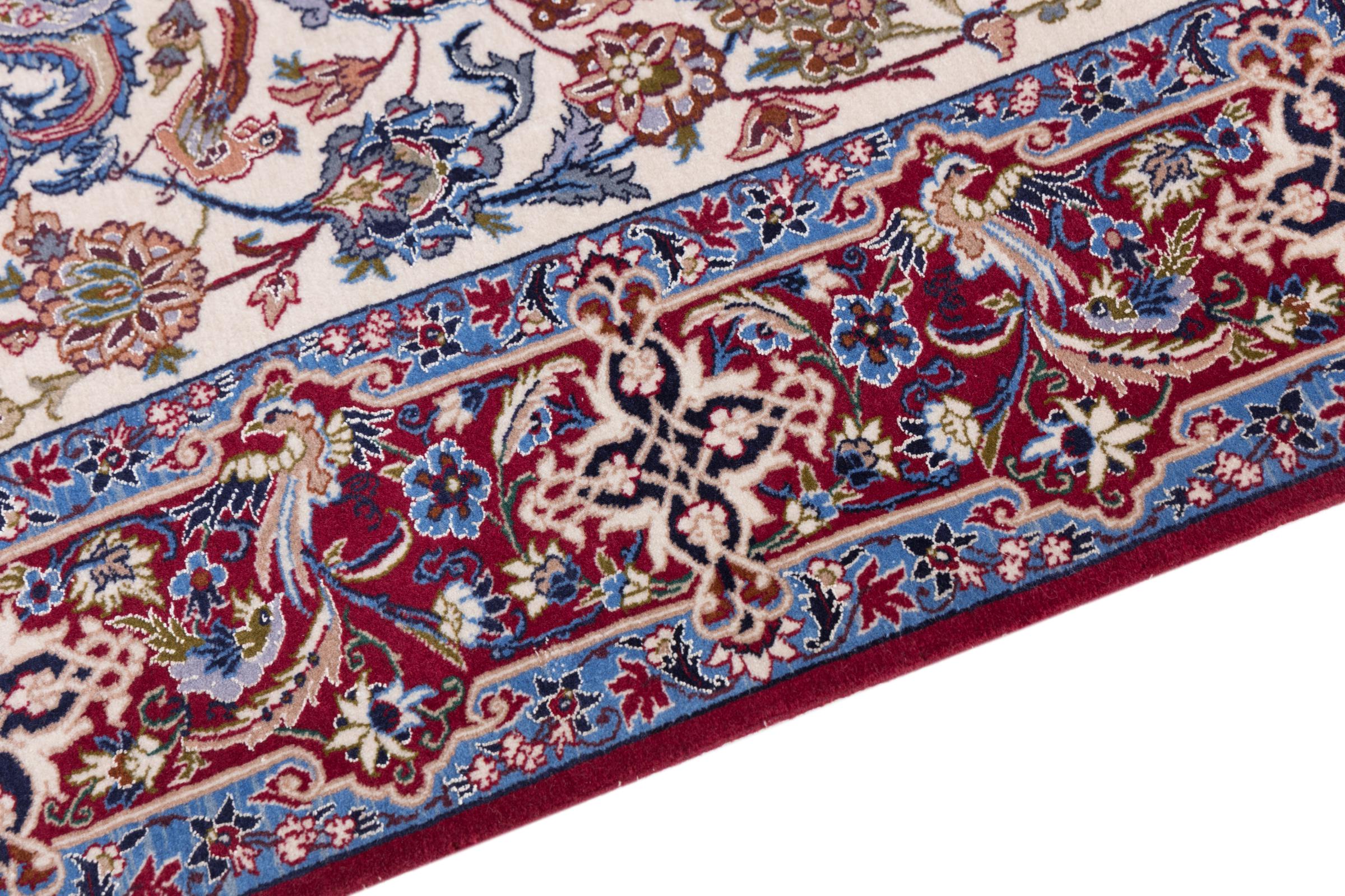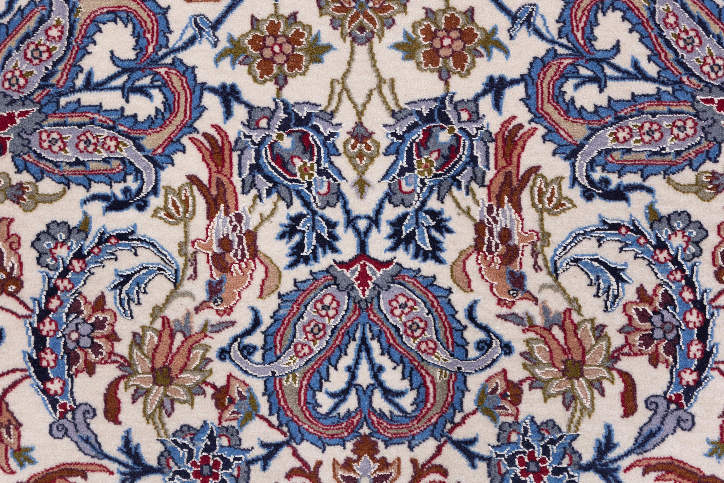 Esta alfombra de Ispahán está hecha con el arte del anudado más tradicional y elevado. Está magistralmente elaborada y decorada con fascinantes ornamentos. La alfombra persa fue anudada a mano en Isfahan, probablemente la ciudad más bella de Irán, a partir de los hilos más finos. Las alfombras de Isfahán se encuentran entre las persas más valiosas y pueden ser una verdadera inversión.
