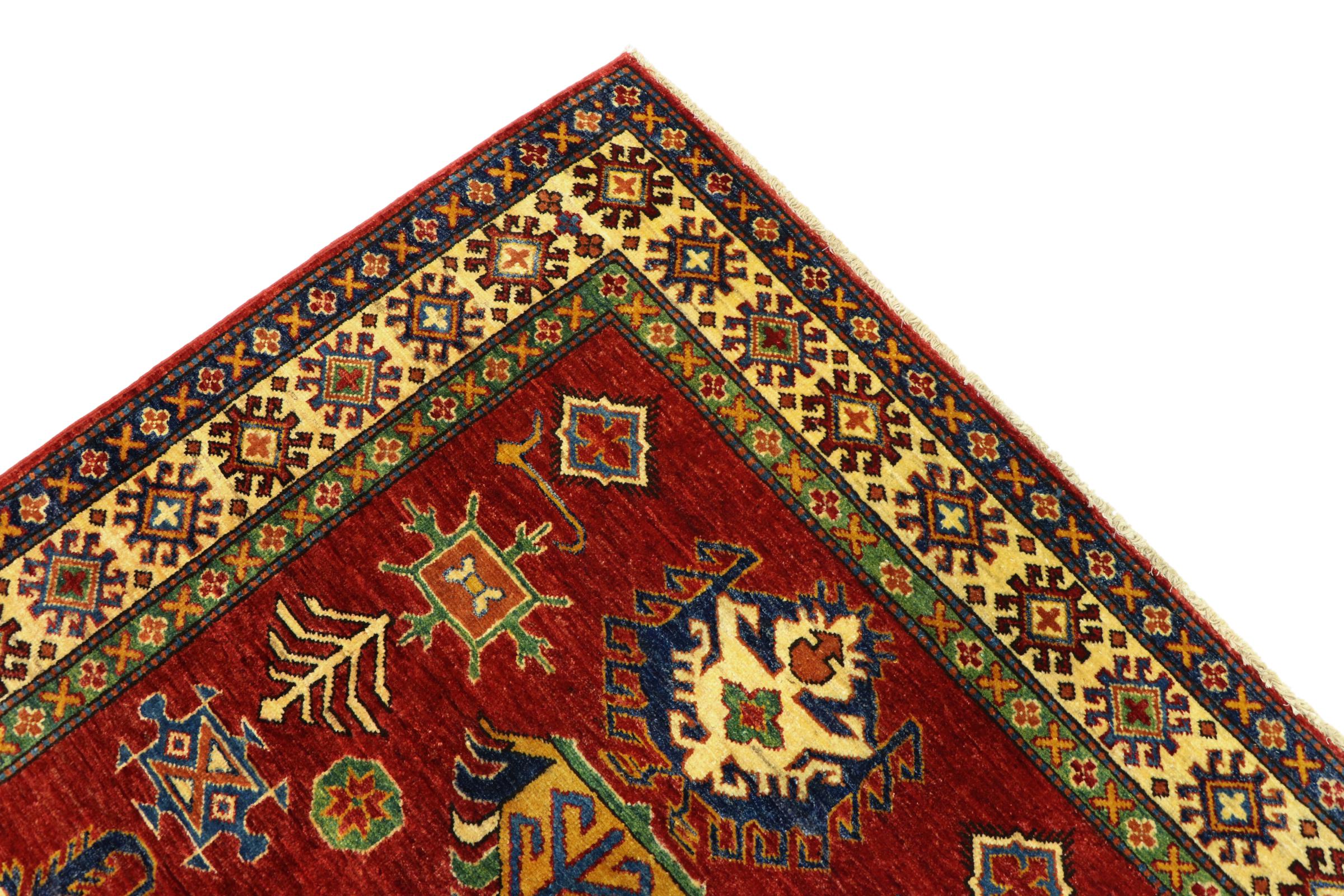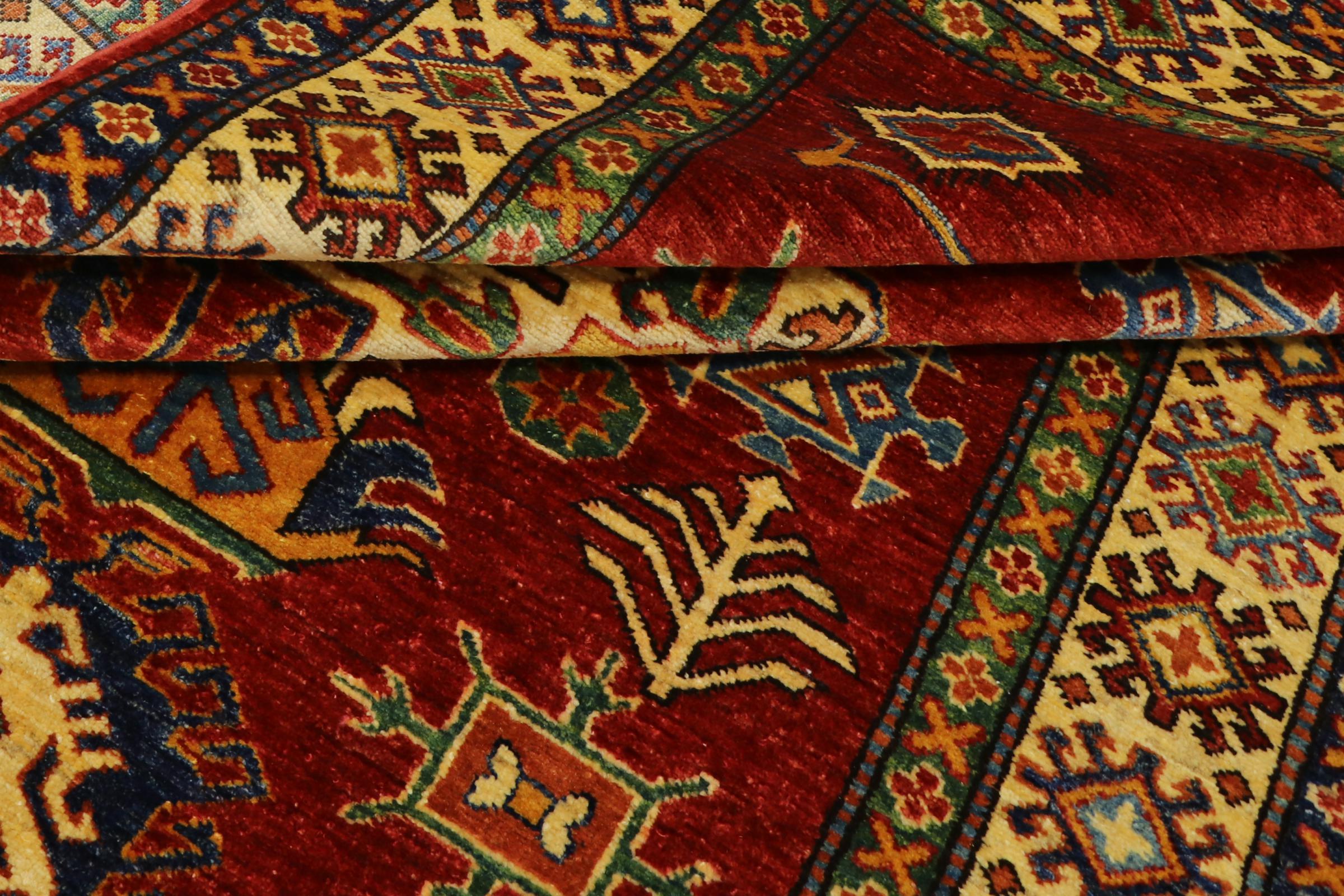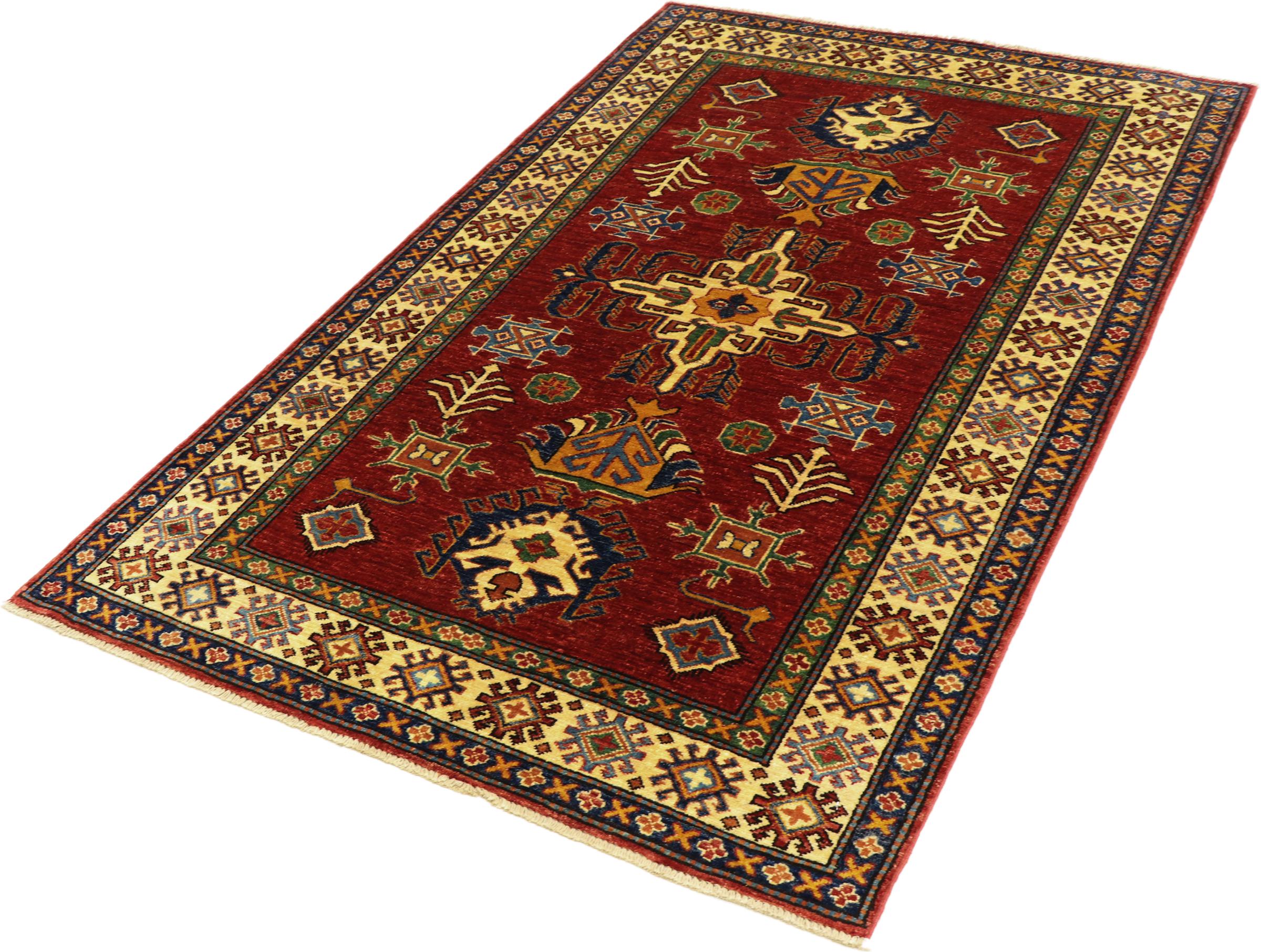 Esta alfombra Kazaka anudada a mano al estilo de las alfombras caucásicas convence por su gran robustez y sus vivos tonos. Así, refleja la cultura del Cáucaso en una bella composición. Una cultura que domina el arte de anudar alfombras desde hace siglos y que lo transmite al mundo exterior con formas encantadoramente sencillas en colores impresionantemente vivos.