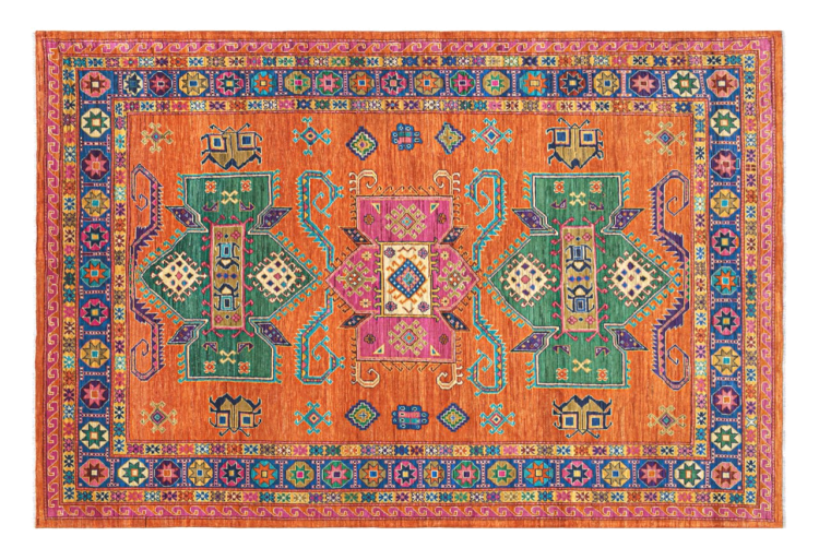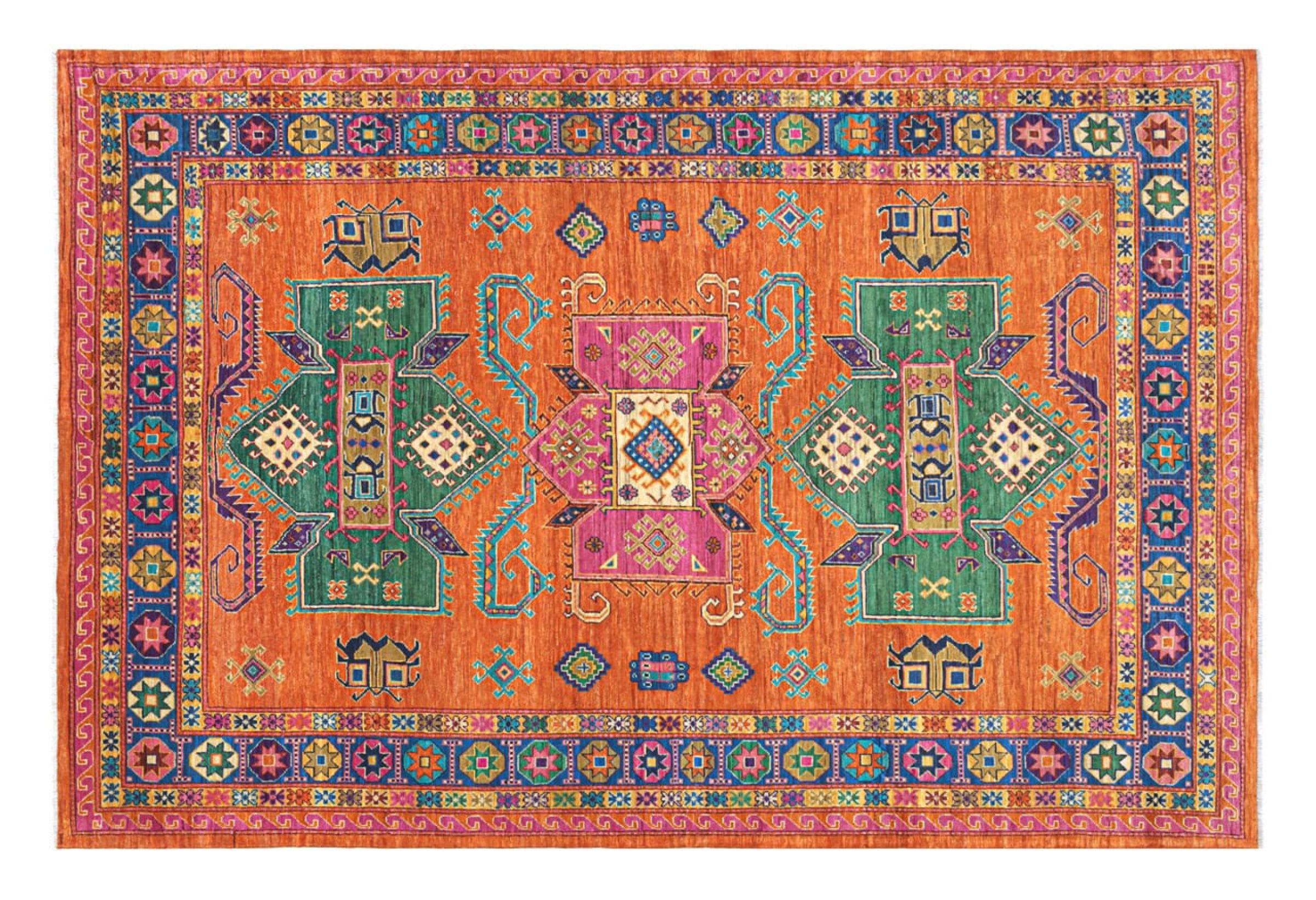 Esta alfombra Kazaka anudada a mano al estilo de las alfombras caucásicas convence por su gran robustez y sus vivos tonos. Así, refleja la cultura del Cáucaso en una bella composición. Una cultura que domina el arte de anudar alfombras desde hace siglos y que lo transmite al mundo exterior con formas encantadoramente sencillas en colores impresionantemente vivos.