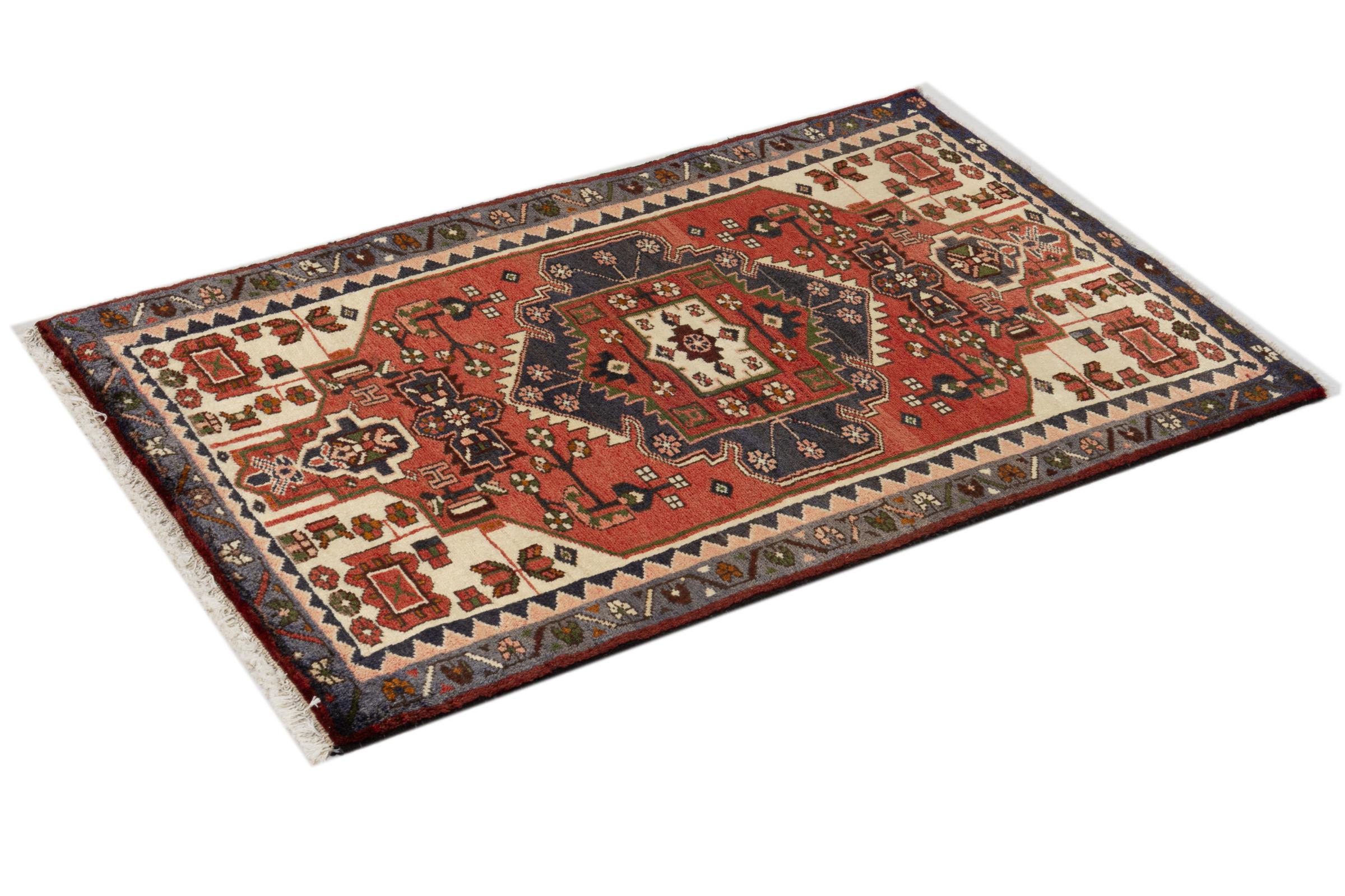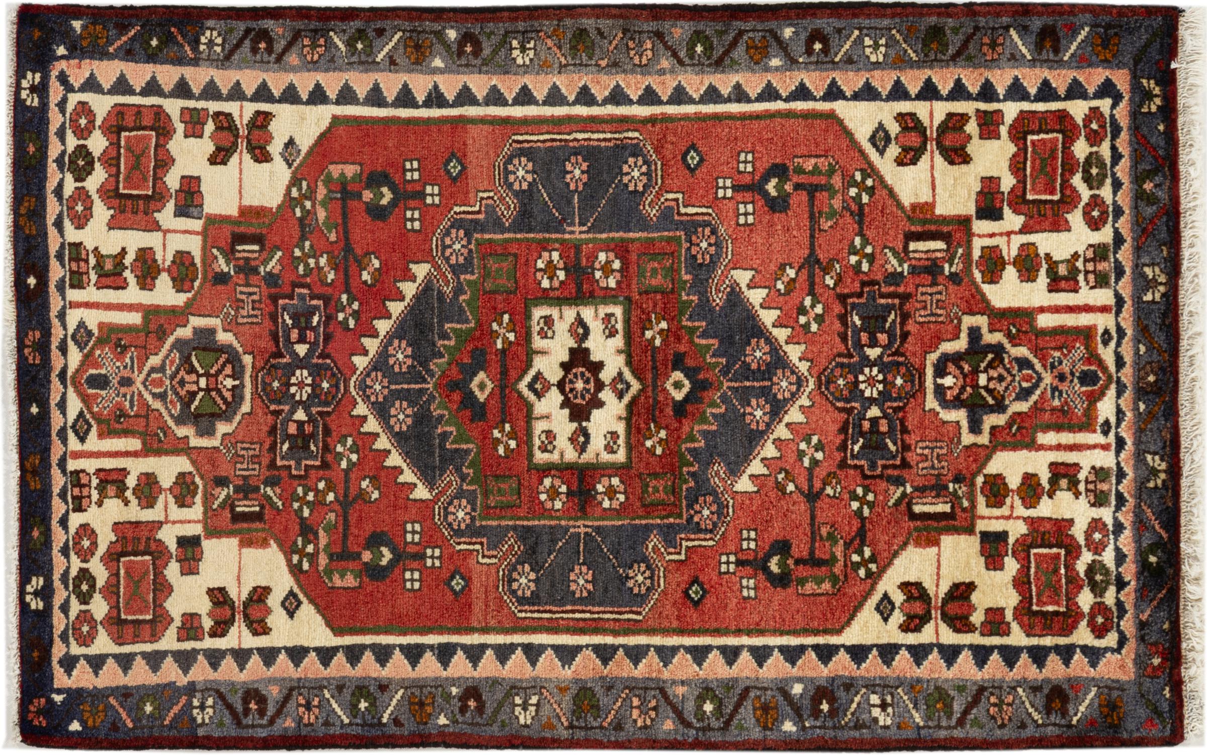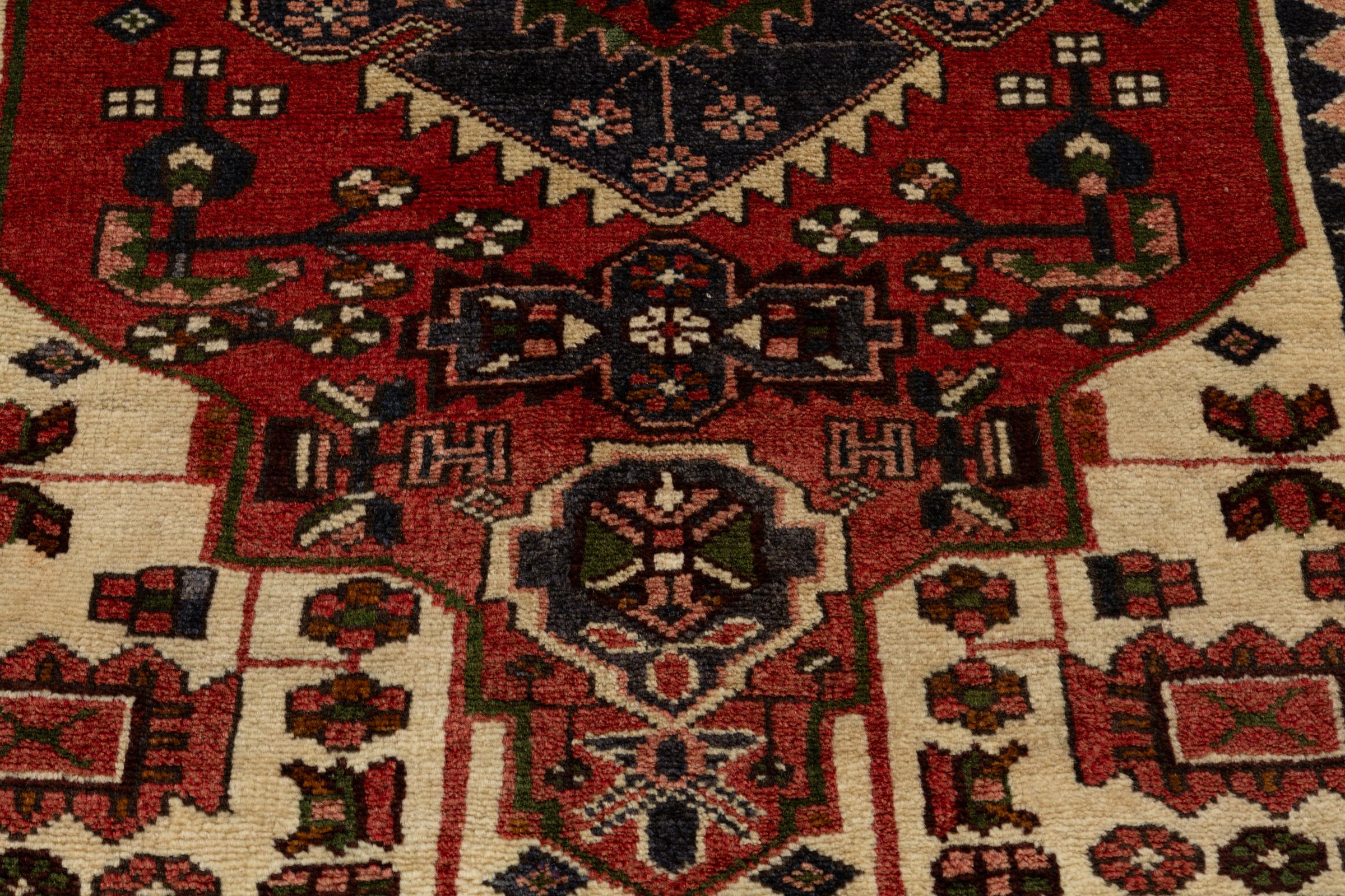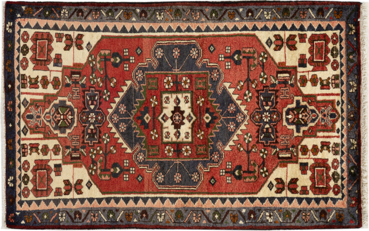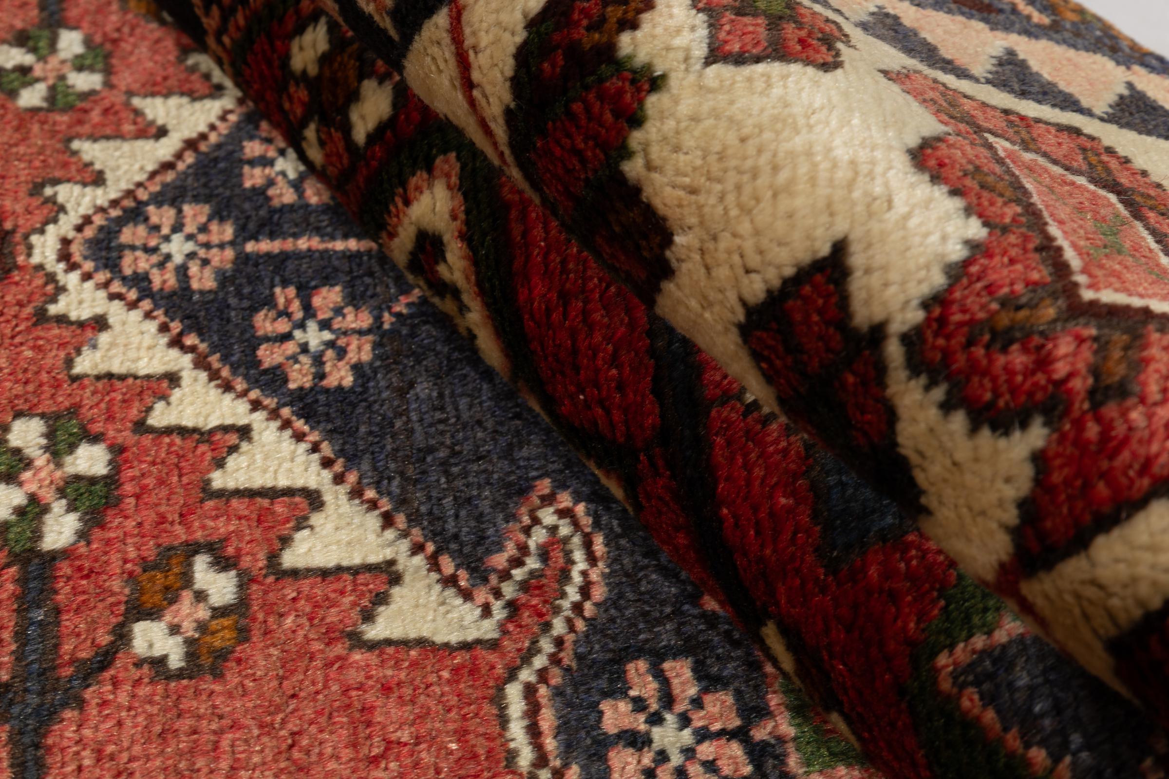 Es una auténtica alfombra persa procedente de Khamseh, un pueblo de la región de Hamadán. Tiene los colores típicos y los dibujos rectos de una alfombra de pueblo. Además, esta alfombra está hecha con el arte tradicional persa del anudado.