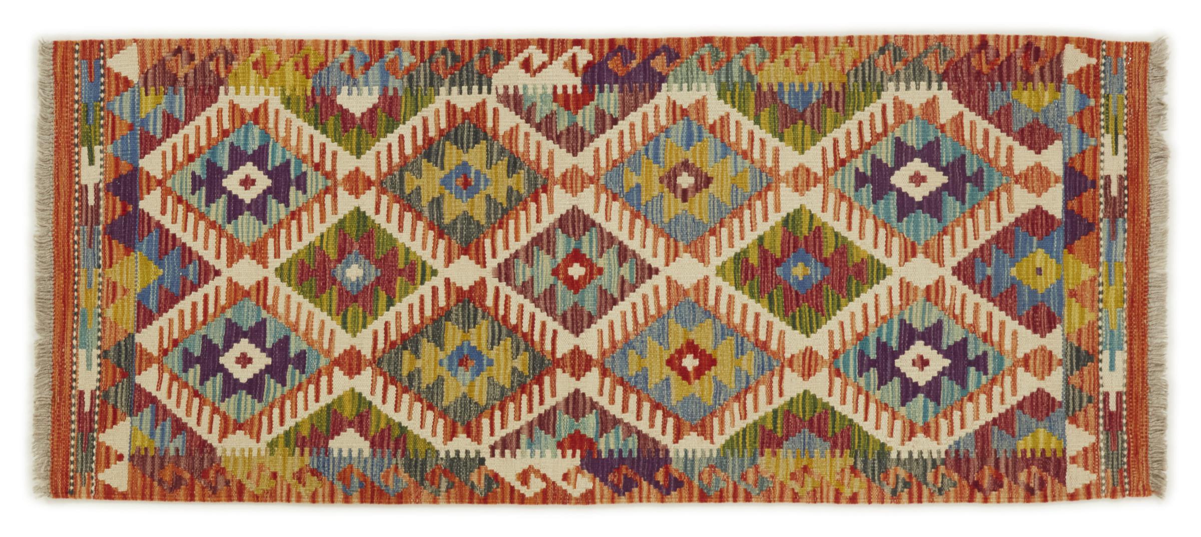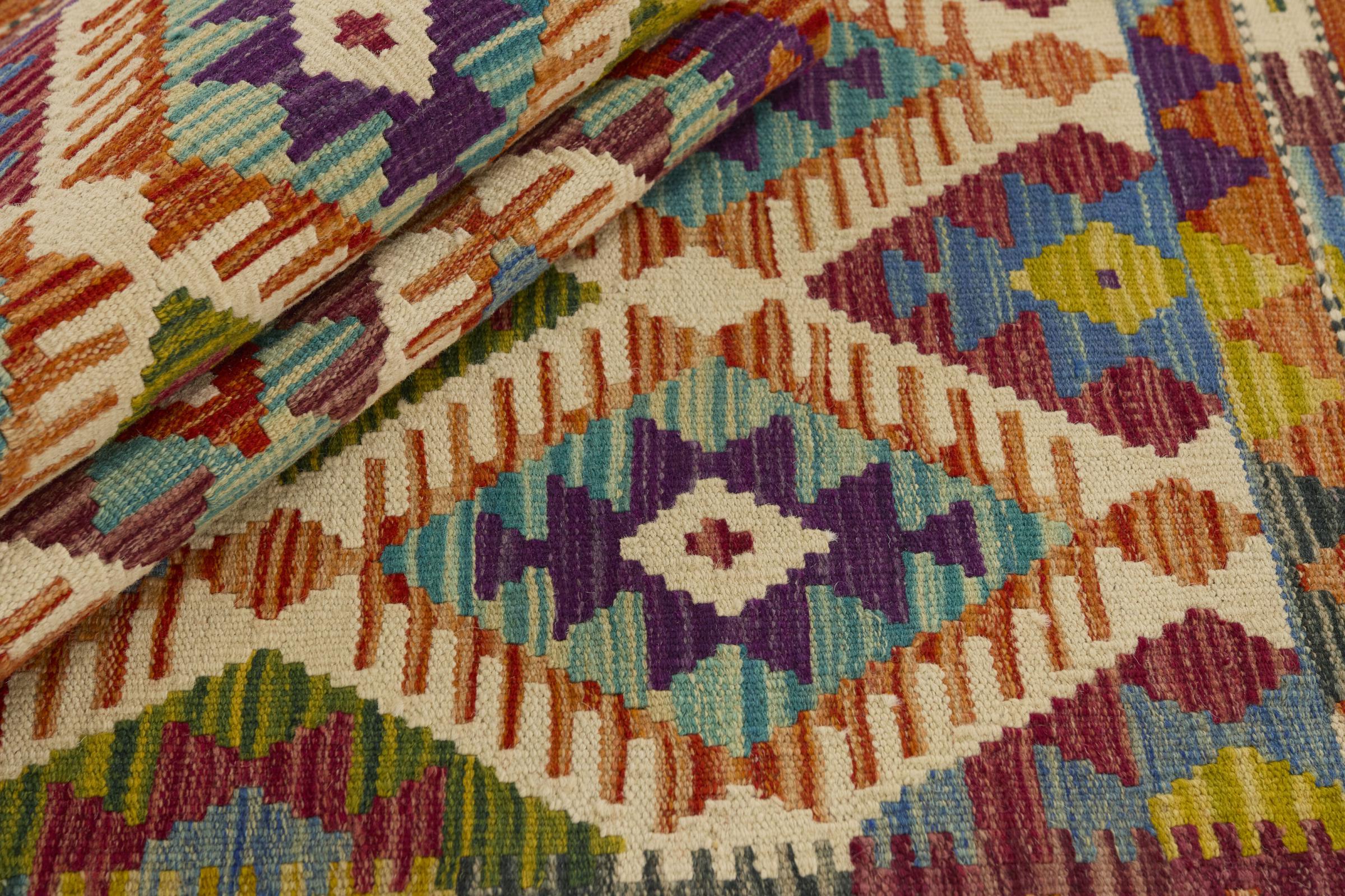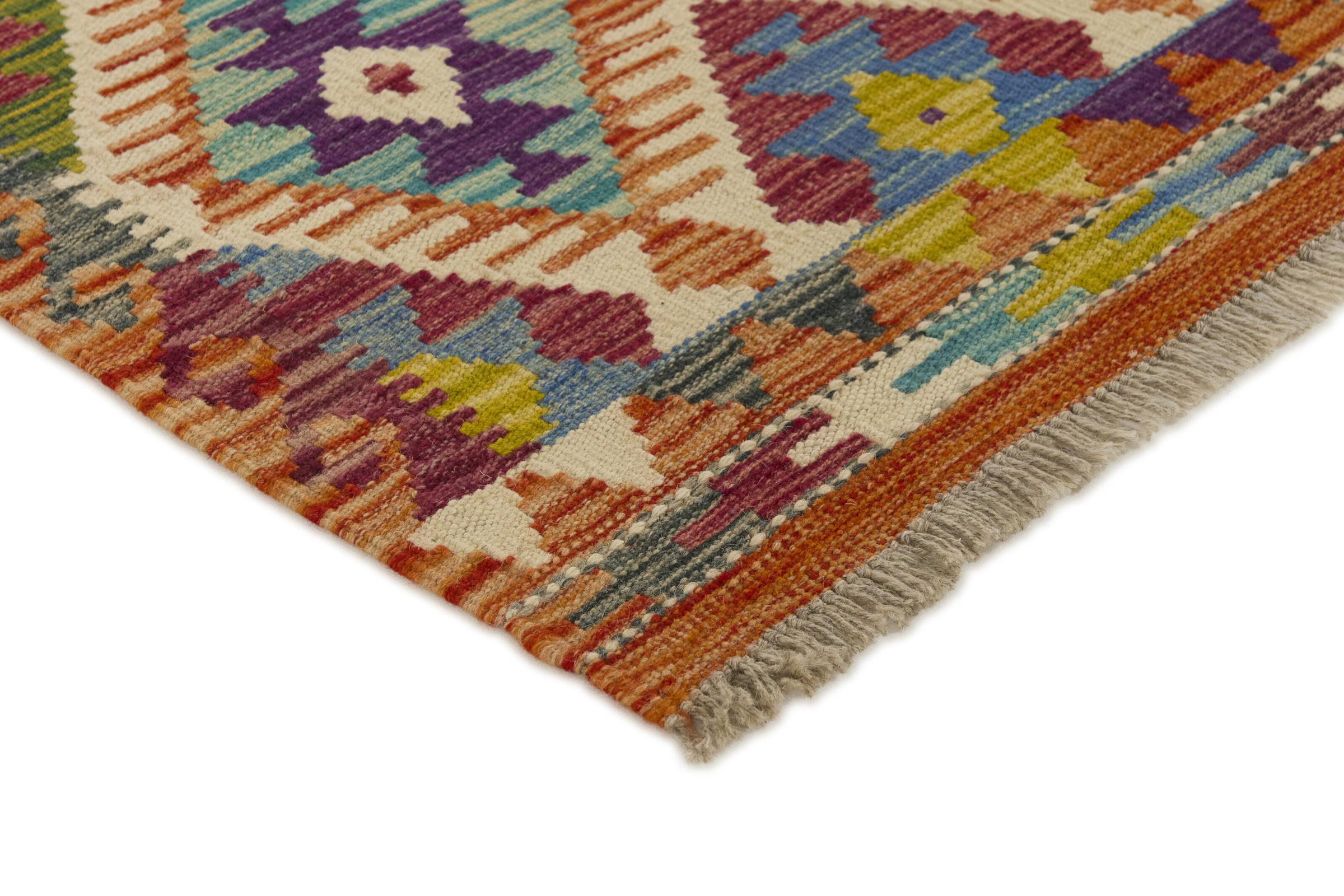Estas alfombras kilim muestran una diferencia decisiva con las alfombras anudadas a mano - son tejidas a mano. Por lo tanto, no tienen un montón alto de lana y son a menudo más planos y más ásperos que las alfombras de lana anudada. Su fabricación es menos elaborada y por eso suelen ser mucho más baratas. Como ventaja, las alfombras de kilim son también mucho más ligeras y pueden ser colocadas por delante y por detrás. Los kilims tejidos a mano provienen originalmente de la antigua Persia y ahora también se fabrican a menudo en el Afganistán. Tienen patrones bastante simples y directos, que se deben a su técnica de tejido.