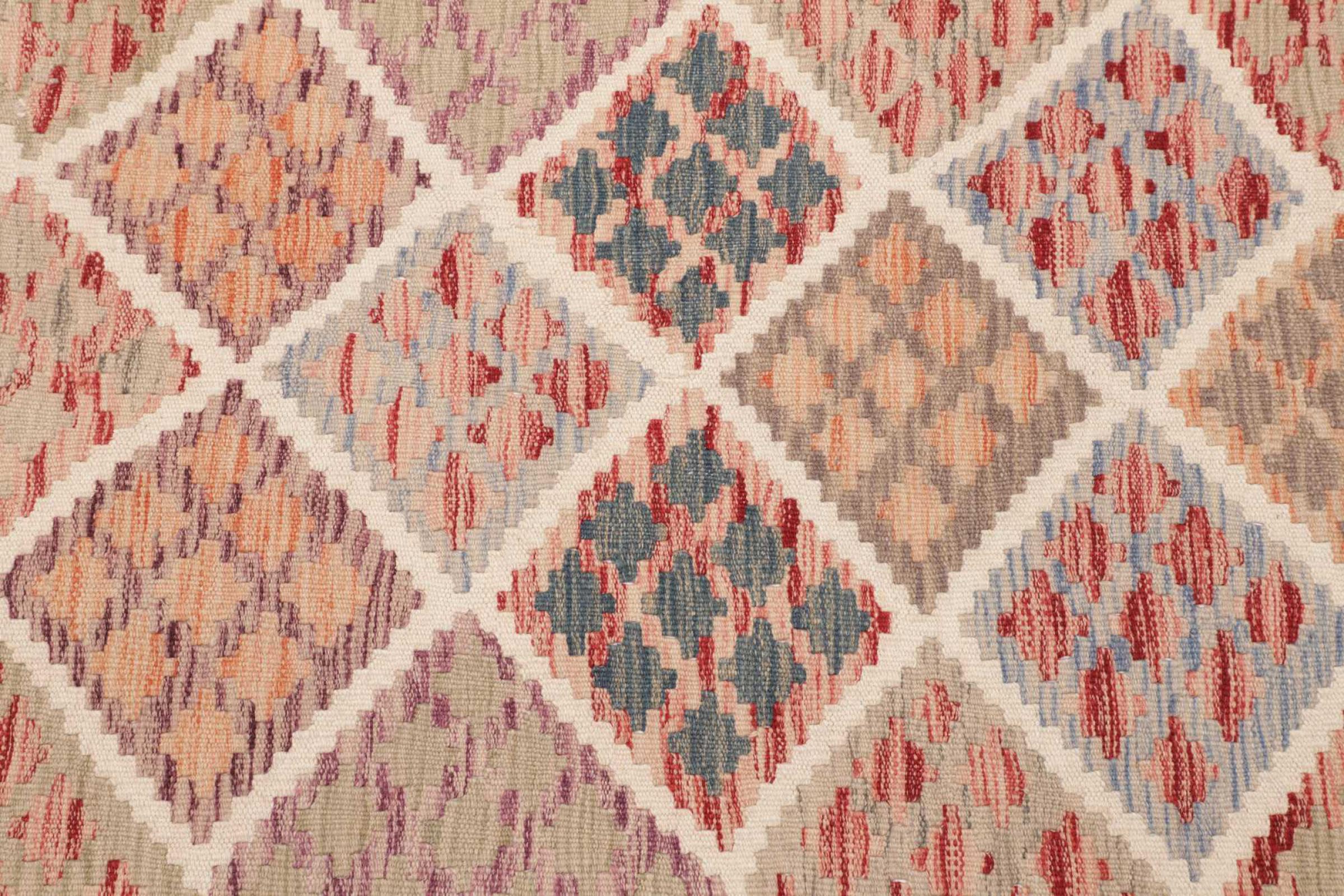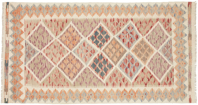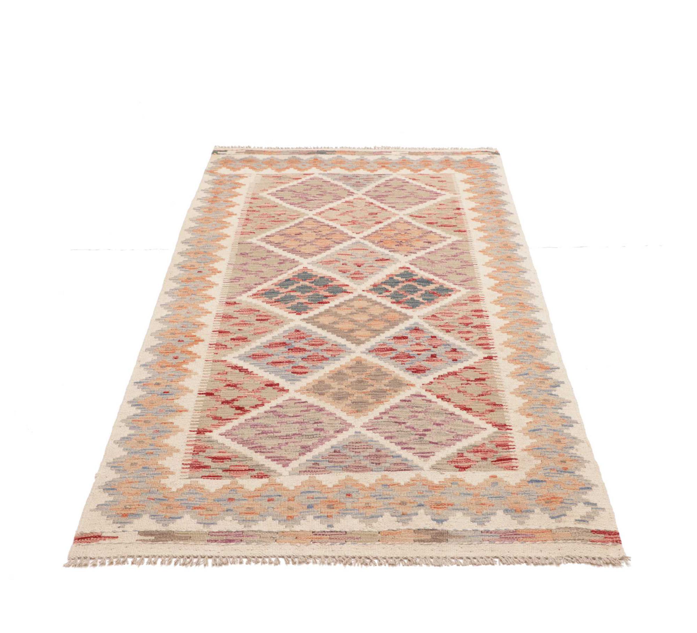 Estas alfombras kilim muestran una diferencia decisiva con las alfombras anudadas a mano - son tejidas a mano. Por lo tanto, no tienen un montón alto de lana y son a menudo más planos y más ásperos que las alfombras de lana anudada. Su fabricación es menos elaborada y por eso suelen ser mucho más baratas. Como ventaja, las alfombras de kilim son también mucho más ligeras y pueden ser colocadas por delante y por detrás. Los kilims tejidos a mano provienen originalmente de la antigua Persia y ahora también se fabrican a menudo en el Afganistán. Tienen patrones bastante simples y directos, que se deben a su técnica de tejido.