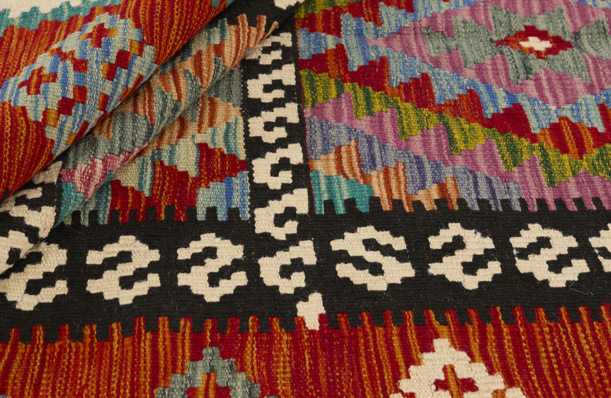 Estas alfombras kilim muestran una diferencia decisiva con las alfombras anudadas a mano - son tejidas a mano. Por lo tanto, no tienen un montón alto de lana y son a menudo más planos y más ásperos que las alfombras de lana anudada. Su fabricación es menos elaborada y por eso suelen ser mucho más baratas. Como ventaja, las alfombras de kilim son también mucho más ligeras y pueden ser colocadas por delante y por detrás. Los kilims tejidos a mano provienen originalmente de la antigua Persia y ahora también se fabrican a menudo en el Afganistán. Tienen patrones bastante simples y directos, que se deben a su técnica de tejido.