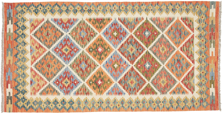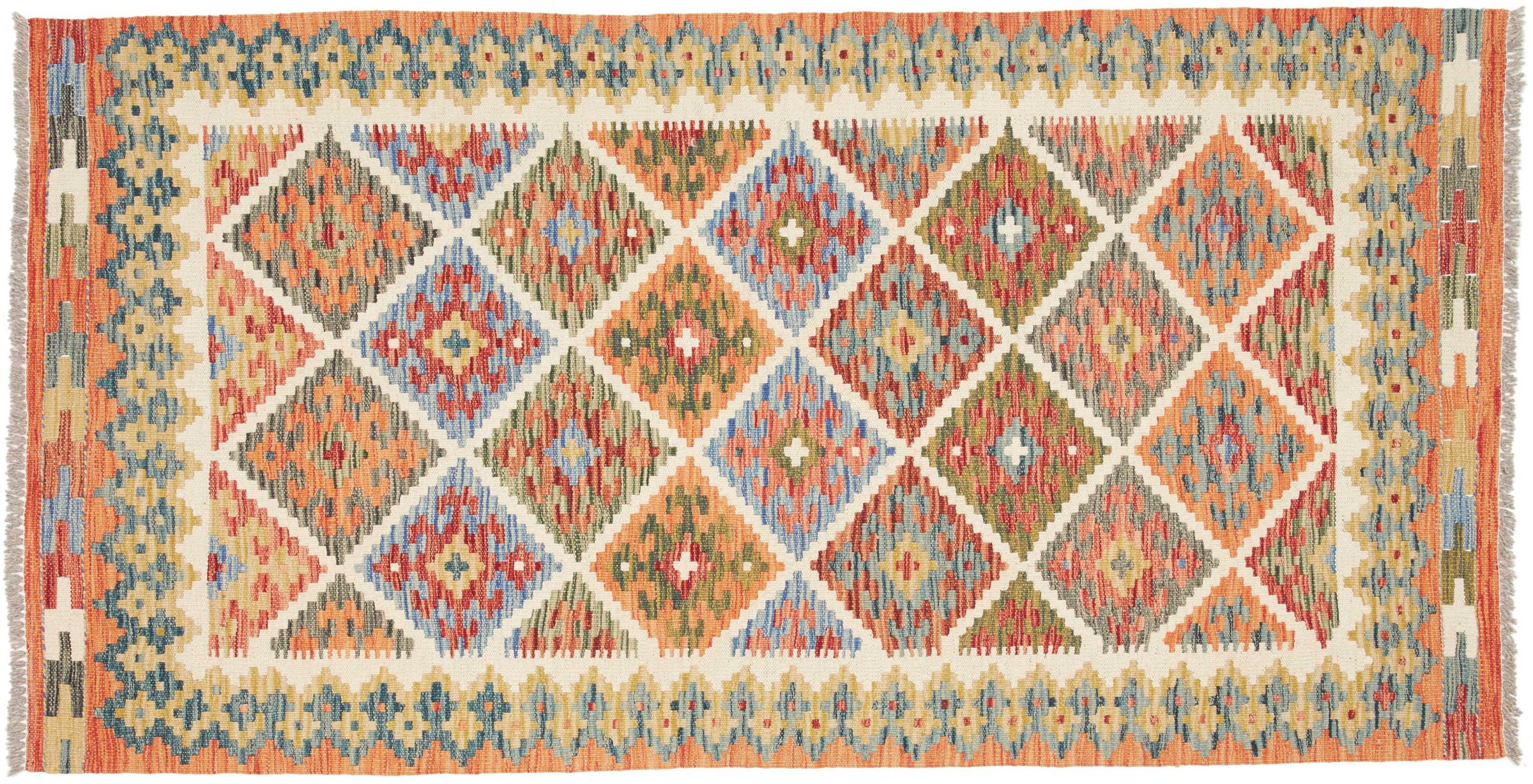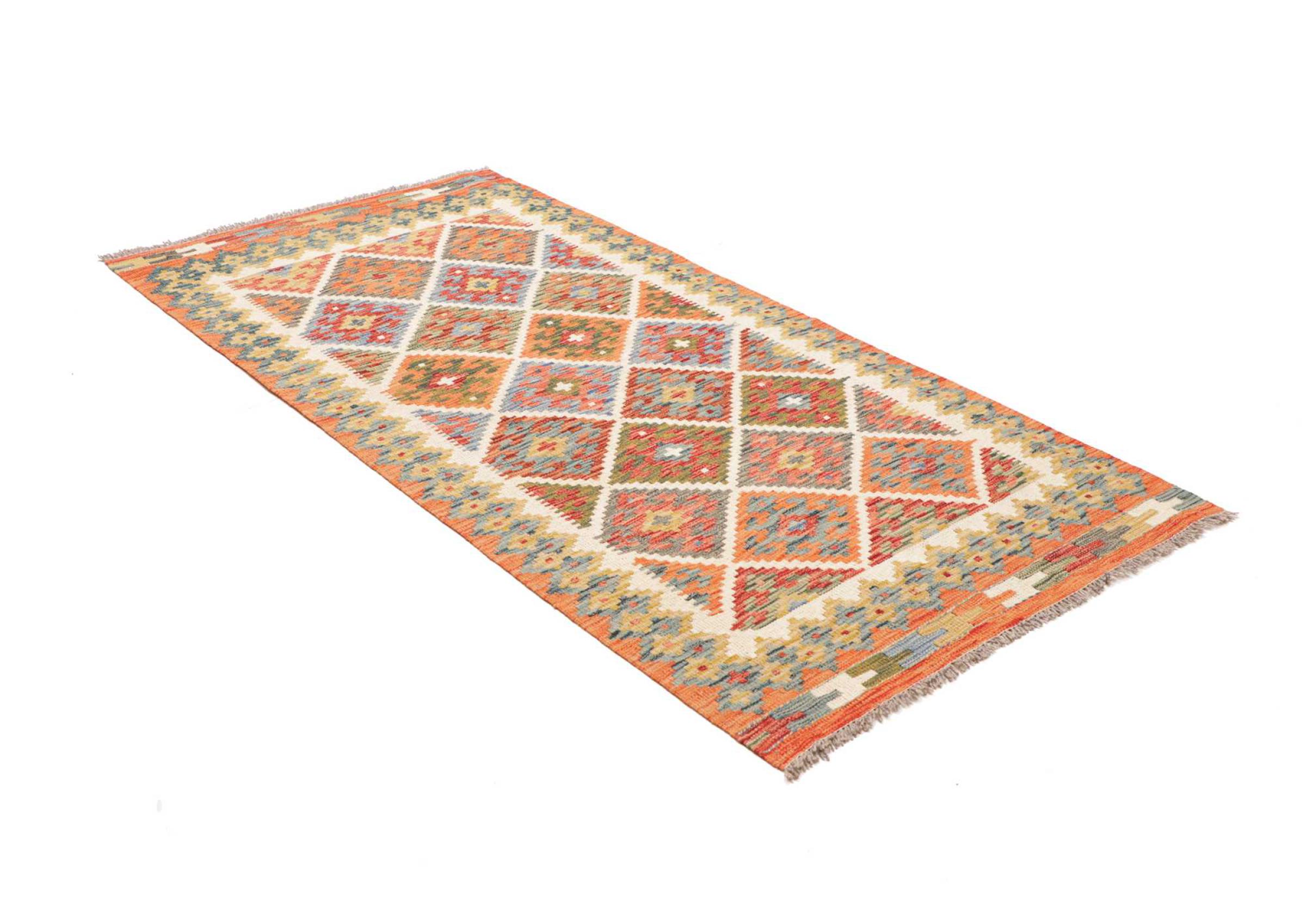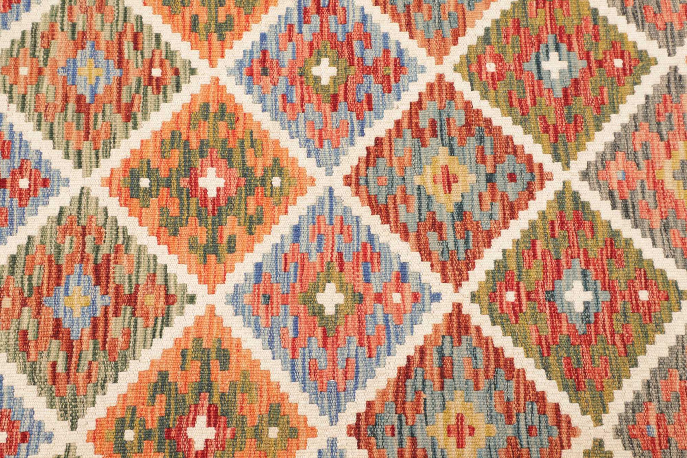 Estas alfombras kilim muestran una diferencia decisiva con las alfombras anudadas a mano - son tejidas a mano. Por lo tanto, no tienen un montón alto de lana y son a menudo más planos y más ásperos que las alfombras de lana anudada. Su fabricación es menos elaborada y por eso suelen ser mucho más baratas. Como ventaja, las alfombras de kilim son también mucho más ligeras y pueden ser colocadas por delante y por detrás. Los kilims tejidos a mano provienen originalmente de la antigua Persia y ahora también se fabrican a menudo en el Afganistán. Tienen patrones bastante simples y directos, que se deben a su técnica de tejido.