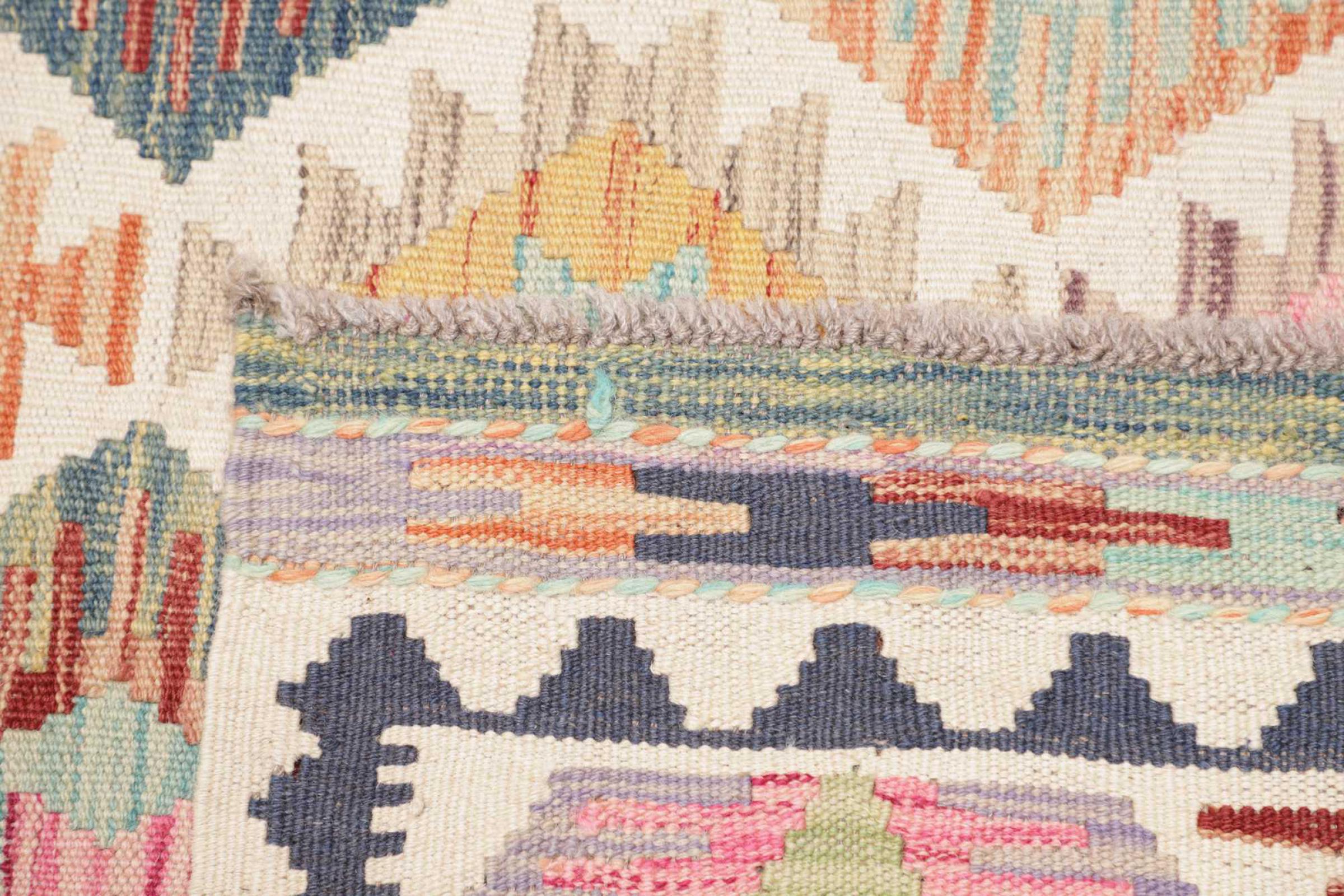 Estas alfombras kilim muestran una diferencia decisiva con las alfombras anudadas a mano - son tejidas a mano. Por lo tanto, no tienen un montón alto de lana y son a menudo más planos y más ásperos que las alfombras de lana anudada. Su fabricación es menos elaborada y por eso suelen ser mucho más baratas. Como ventaja, las alfombras de kilim son también mucho más ligeras y pueden ser colocadas por delante y por detrás. Los kilims tejidos a mano provienen originalmente de la antigua Persia y ahora también se fabrican a menudo en el Afganistán. Tienen patrones bastante simples y directos, que se deben a su técnica de tejido.