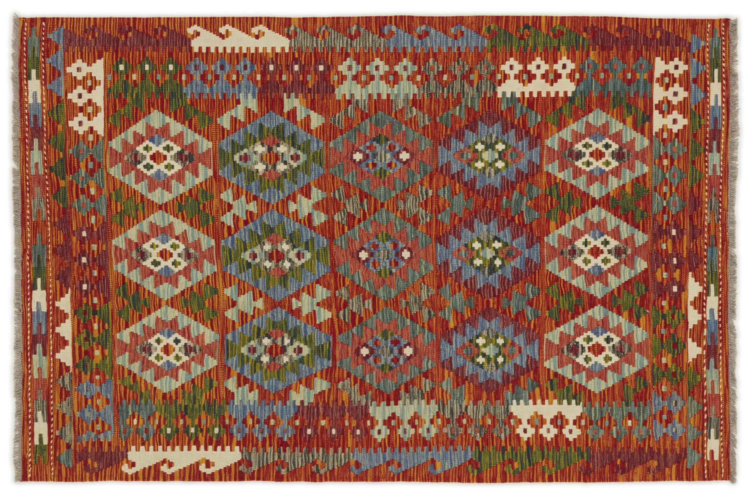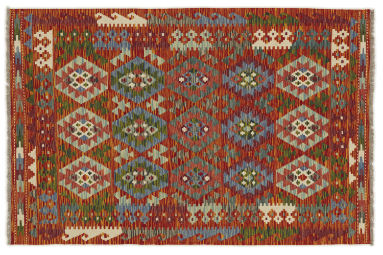 Estas alfombras kilim muestran una diferencia decisiva con las alfombras anudadas a mano - son tejidas a mano. Por lo tanto, no tienen un montón alto de lana y son a menudo más planos y más ásperos que las alfombras de lana anudada. Su fabricación es menos elaborada y por eso suelen ser mucho más baratas. Como ventaja, las alfombras de kilim son también mucho más ligeras y pueden ser colocadas por delante y por detrás. Los kilims tejidos a mano provienen originalmente de la antigua Persia y ahora también se fabrican a menudo en el Afganistán. Tienen patrones bastante simples y directos, que se deben a su técnica de tejido.