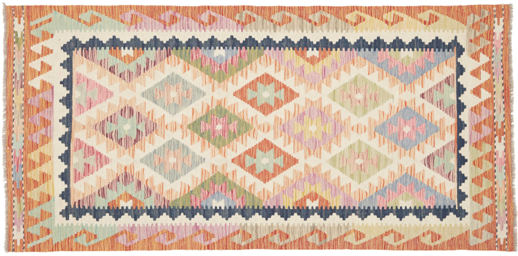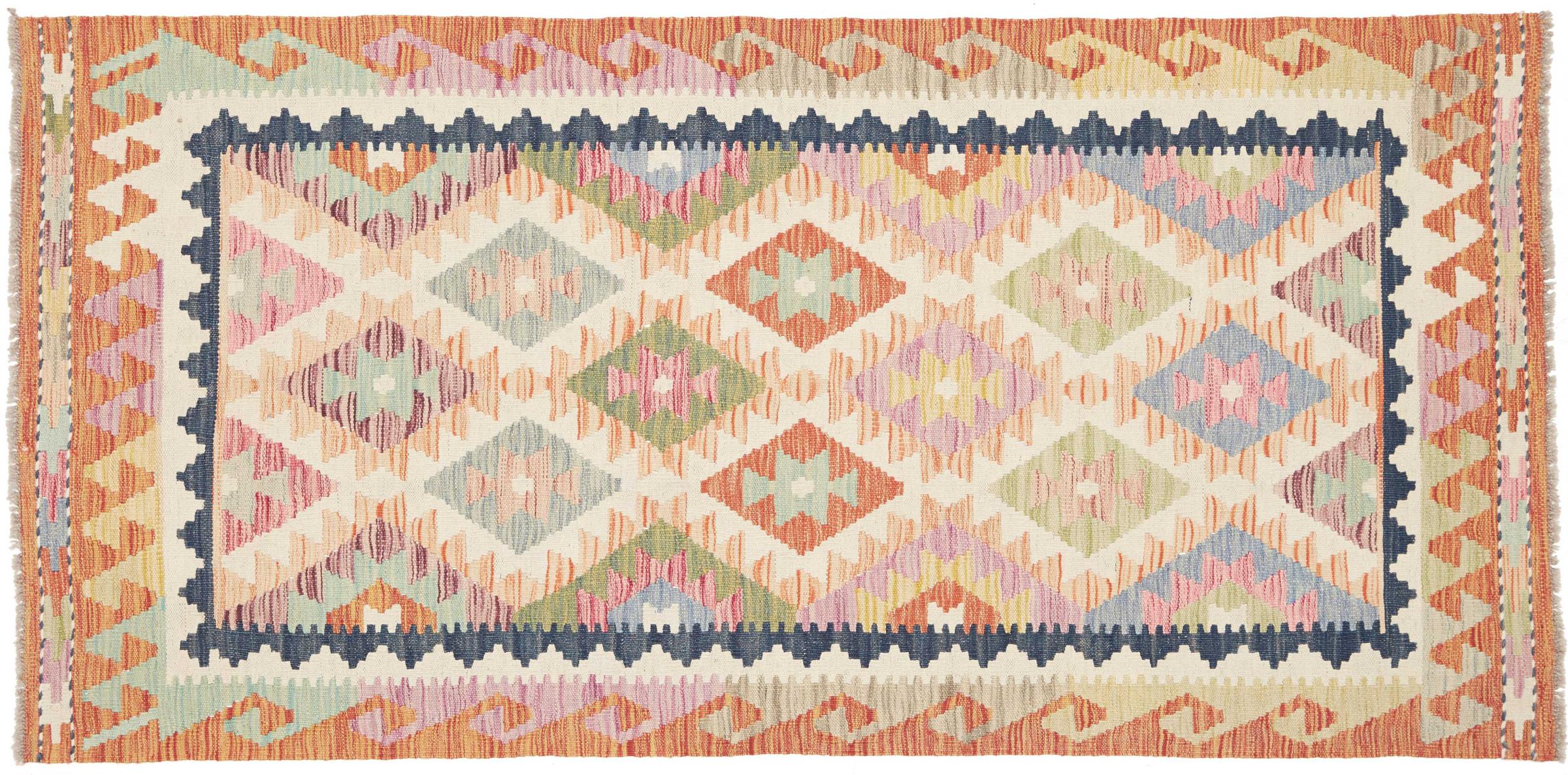 Estas alfombras kilim muestran una diferencia decisiva con las alfombras anudadas a mano - son tejidas a mano. Por lo tanto, no tienen un montón alto de lana y son a menudo más planos y más ásperos que las alfombras de lana anudada. Su fabricación es menos elaborada y por eso suelen ser mucho más baratas. Como ventaja, las alfombras de kilim son también mucho más ligeras y pueden ser colocadas por delante y por detrás. Los kilims tejidos a mano provienen originalmente de la antigua Persia y ahora también se fabrican a menudo en el Afganistán. Tienen patrones bastante simples y directos, que se deben a su técnica de tejido.