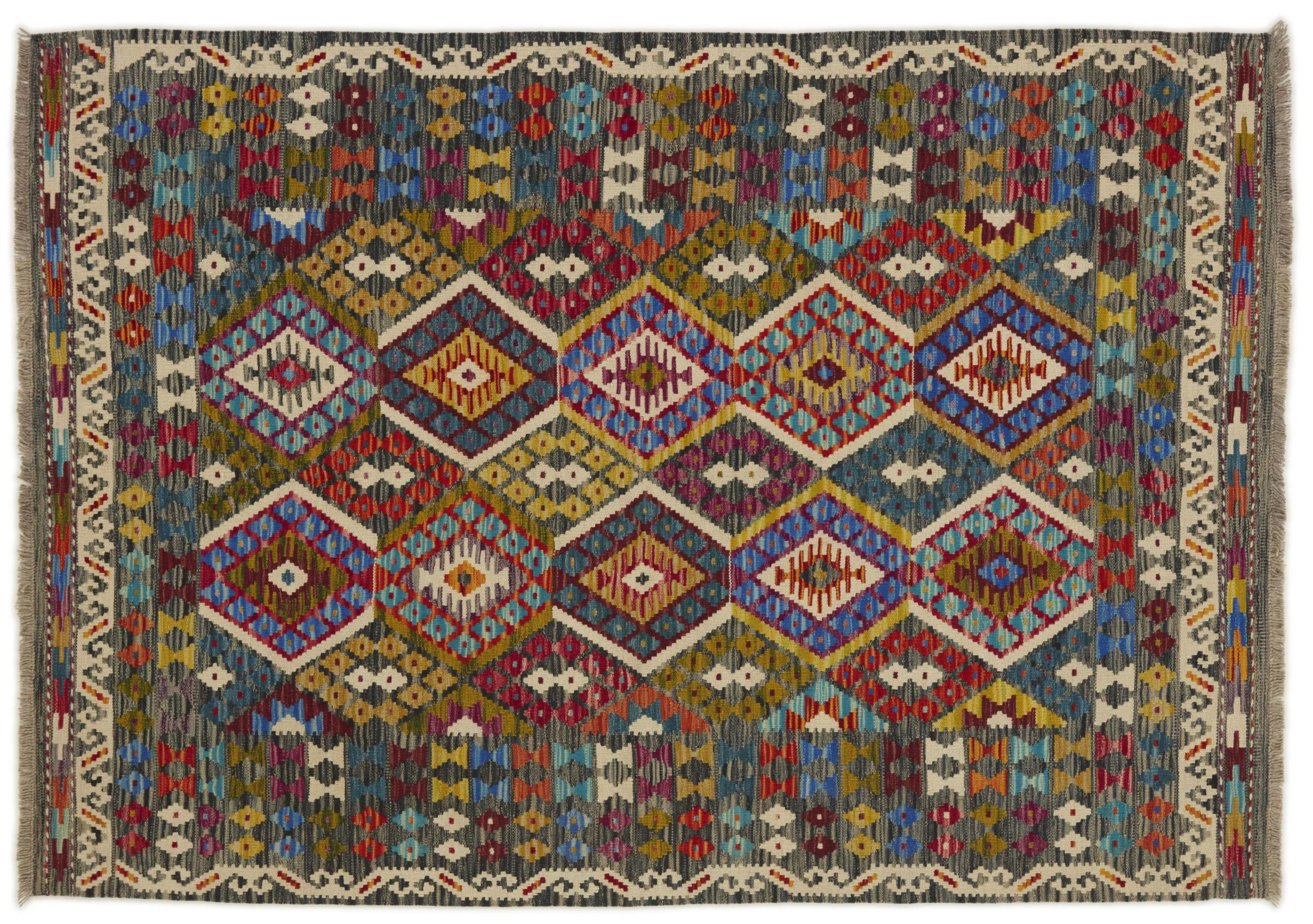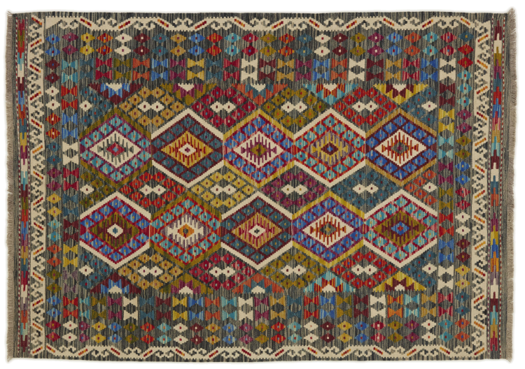 Estas alfombras kilim muestran una diferencia decisiva con las alfombras anudadas a mano - son tejidas a mano. Por lo tanto, no tienen un montón alto de lana y son a menudo más planos y más ásperos que las alfombras de lana anudada. Su fabricación es menos elaborada y por eso suelen ser mucho más baratas. Como ventaja, las alfombras de kilim son también mucho más ligeras y pueden ser colocadas por delante y por detrás. Los kilims tejidos a mano provienen originalmente de la antigua Persia y ahora también se fabrican a menudo en el Afganistán. Tienen patrones bastante simples y directos, que se deben a su técnica de tejido.