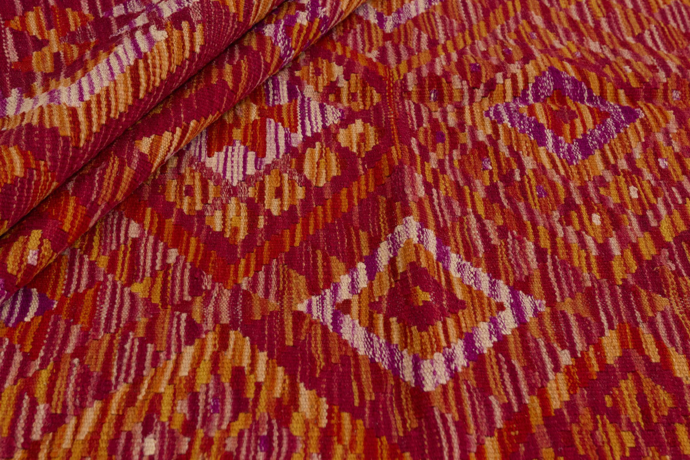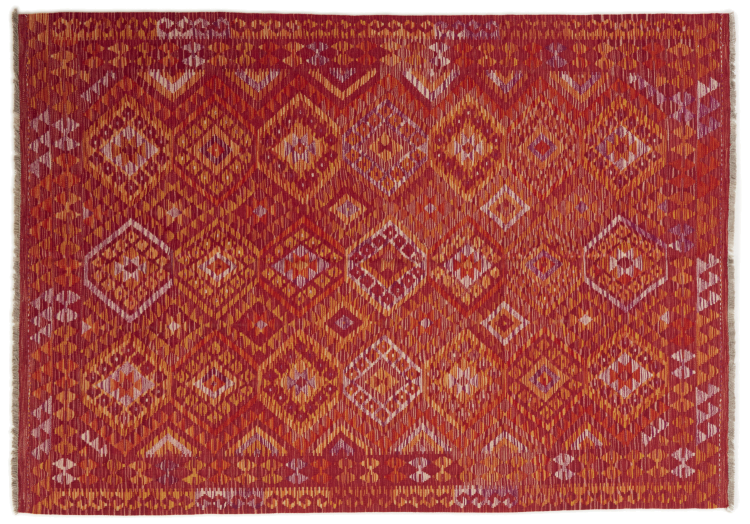 Esta alfombra fue hecha a mano en un telar como un tejido plano. Tejido plano es el término utilizado para describir las alfombras que no tienen pelo. Como el nombre promete, estas alfombras están tejidas y no anudadas. Esto resulta en una alfombra plana con una superficie estructurada. Los tejidos planos no son tan suaves y normalmente más delgados que las alfombras anudadas. Al mismo tiempo, su fabricación es mucho menos compleja y por lo general se pueden disponer por ambos lados (frontal y posterior). Sus patrones suelen ser geométricos, lo cual está determinado por el tejido.