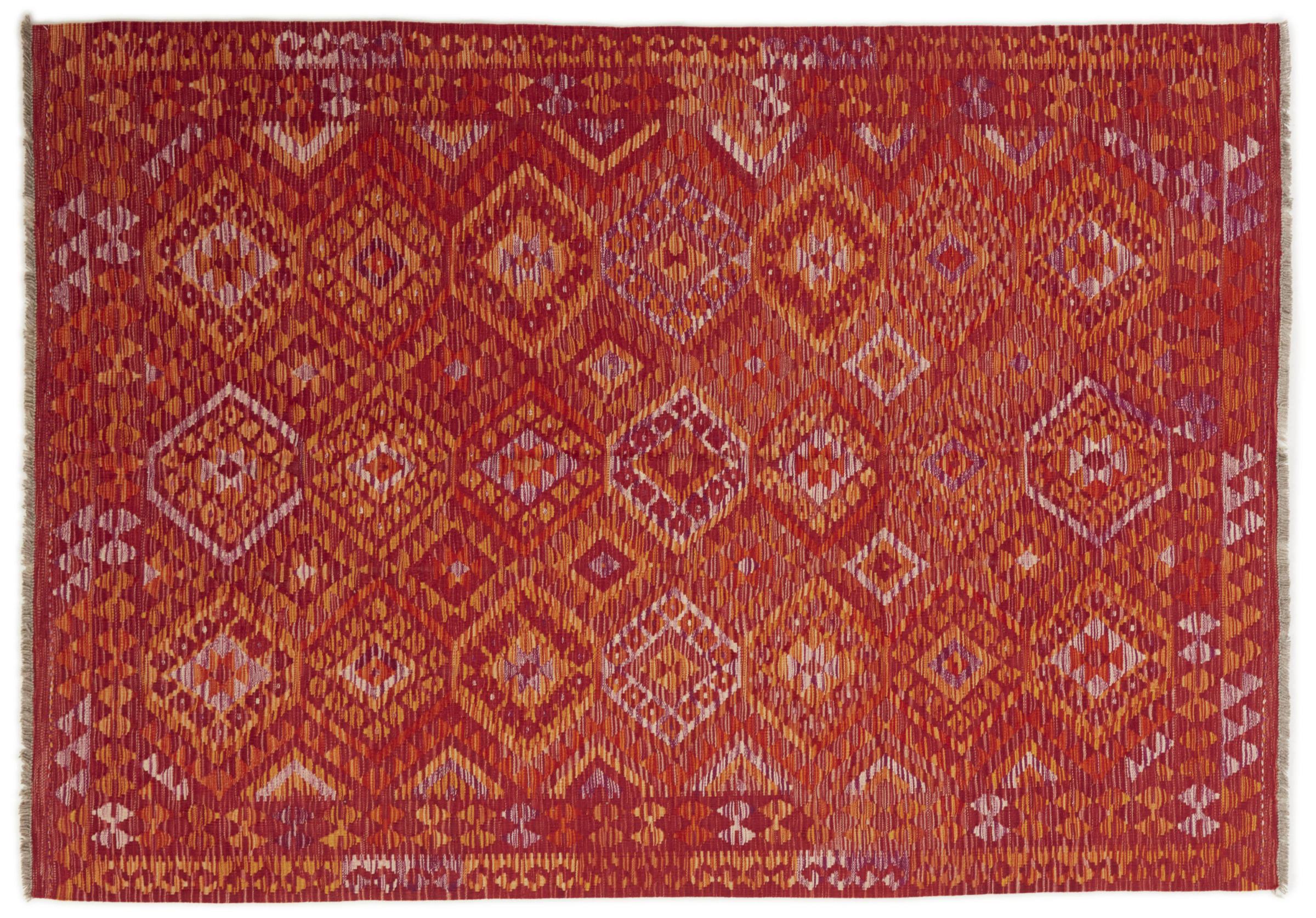 Estas alfombras kilim muestran una diferencia decisiva con las alfombras anudadas a mano - son tejidas a mano. Por lo tanto, no tienen un montón alto de lana y son a menudo más planos y más ásperos que las alfombras de lana anudada. Su fabricación es menos elaborada y por eso suelen ser mucho más baratas. Como ventaja, las alfombras de kilim son también mucho más ligeras y pueden ser colocadas por delante y por detrás. Los kilims tejidos a mano provienen originalmente de la antigua Persia y ahora también se fabrican a menudo en el Afganistán. Tienen patrones bastante simples y directos, que se deben a su técnica de tejido.
