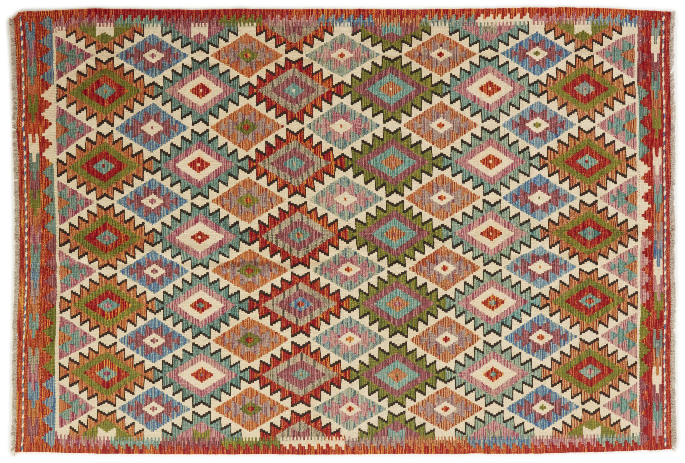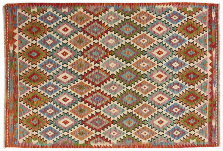Estas alfombras kilim muestran una diferencia decisiva con las alfombras anudadas a mano - son tejidas a mano. Por lo tanto, no tienen un montón alto de lana y son a menudo más planos y más ásperos que las alfombras de lana anudada. Su fabricación es menos elaborada y por eso suelen ser mucho más baratas. Como ventaja, las alfombras de kilim son también mucho más ligeras y pueden ser colocadas por delante y por detrás. Los kilims tejidos a mano provienen originalmente de la antigua Persia y ahora también se fabrican a menudo en el Afganistán. Tienen patrones bastante simples y directos, que se deben a su técnica de tejido.