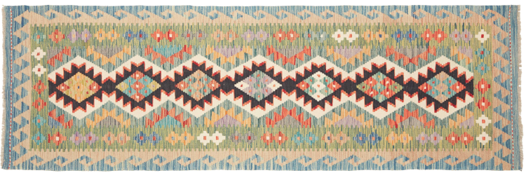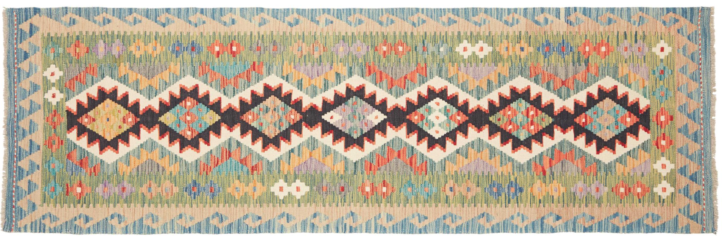 Estas alfombras kilim muestran una diferencia decisiva con las alfombras anudadas a mano - son tejidas a mano. Por lo tanto, no tienen un montón alto de lana y son a menudo más planos y más ásperos que las alfombras de lana anudada. Su fabricación es menos elaborada y por eso suelen ser mucho más baratas. Como ventaja, las alfombras de kilim son también mucho más ligeras y pueden ser colocadas por delante y por detrás. Los kilims tejidos a mano provienen originalmente de la antigua Persia y ahora también se fabrican a menudo en el Afganistán. Tienen patrones bastante simples y directos, que se deben a su técnica de tejido.