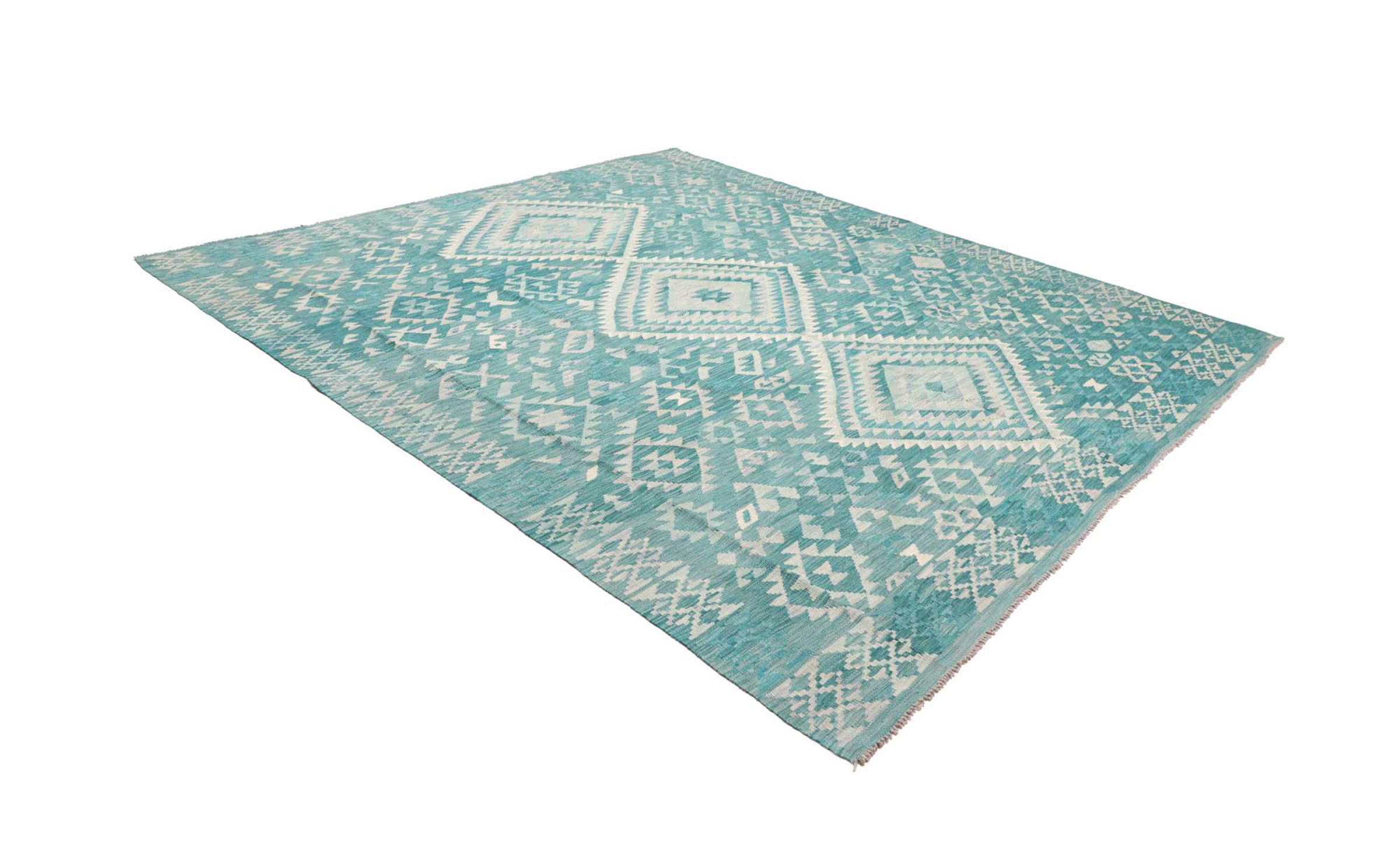 Estas alfombras kilim muestran una diferencia decisiva con las alfombras anudadas a mano - son tejidas a mano. Por lo tanto, no tienen un montón alto de lana y son a menudo más planos y más ásperos que las alfombras de lana anudada. Su fabricación es menos elaborada y por eso suelen ser mucho más baratas. Como ventaja, las alfombras de kilim son también mucho más ligeras y pueden ser colocadas por delante y por detrás. Los kilims tejidos a mano provienen originalmente de la antigua Persia y ahora también se fabrican a menudo en el Afganistán. Tienen patrones bastante simples y directos, que se deben a su técnica de tejido.