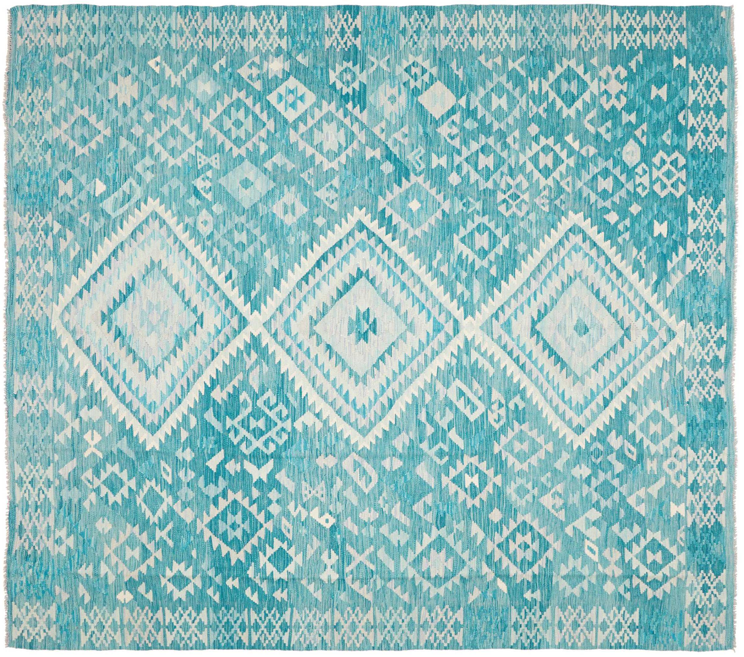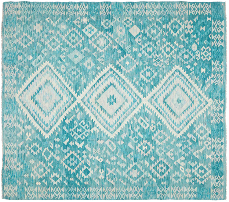 Esta alfombra fue hecha a mano en un telar como un tejido plano. Tejido plano es el término utilizado para describir las alfombras que no tienen pelo. Como el nombre promete, estas alfombras están tejidas y no anudadas. Esto resulta en una alfombra plana con una superficie estructurada. Los tejidos planos no son tan suaves y normalmente más delgados que las alfombras anudadas. Al mismo tiempo, su fabricación es mucho menos compleja y por lo general se pueden disponer por ambos lados (frontal y posterior). Sus patrones suelen ser geométricos, lo cual está determinado por el tejido.