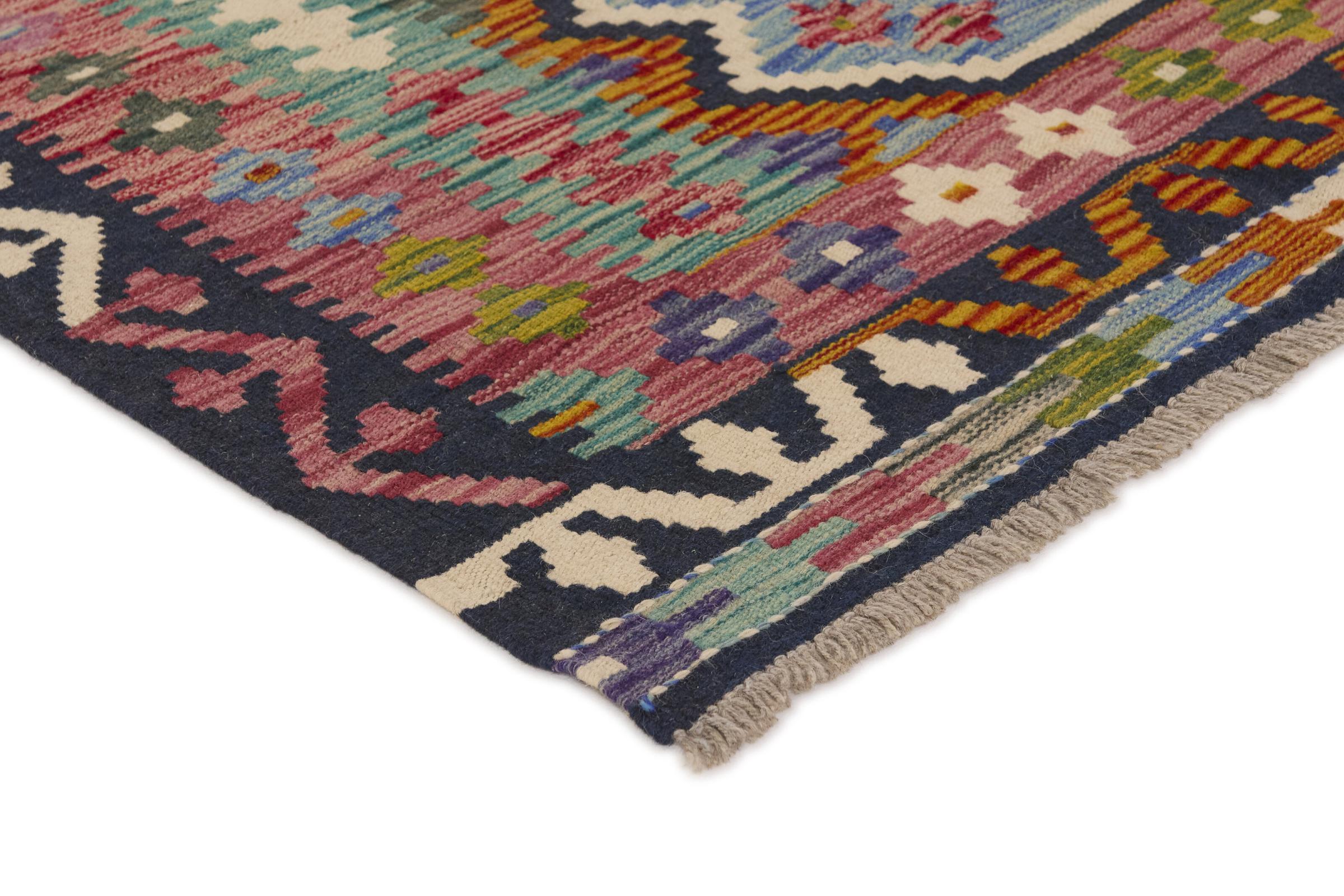 Estas alfombras kilim muestran una diferencia decisiva con las alfombras anudadas a mano - son tejidas a mano. Por lo tanto, no tienen un montón alto de lana y son a menudo más planos y más ásperos que las alfombras de lana anudada. Su fabricación es menos elaborada y por eso suelen ser mucho más baratas. Como ventaja, las alfombras de kilim son también mucho más ligeras y pueden ser colocadas por delante y por detrás. Los kilims tejidos a mano provienen originalmente de la antigua Persia y ahora también se fabrican a menudo en el Afganistán. Tienen patrones bastante simples y directos, que se deben a su técnica de tejido.