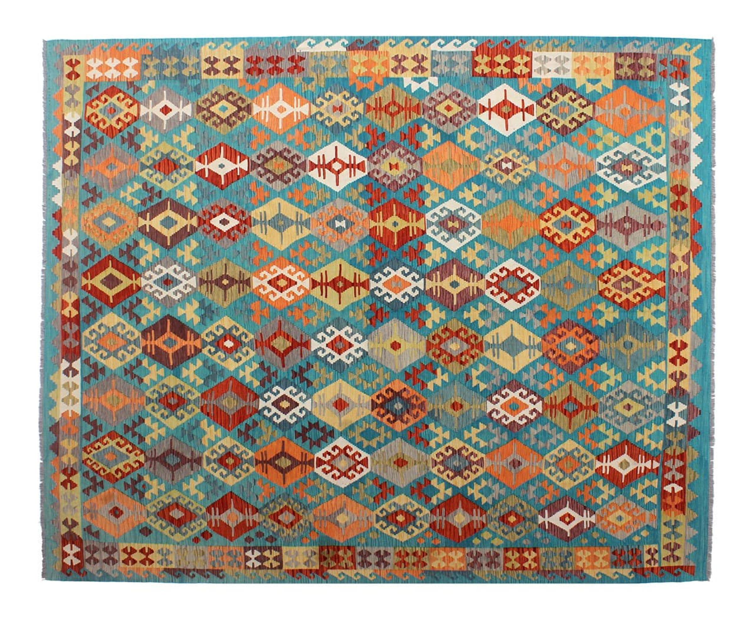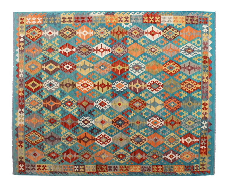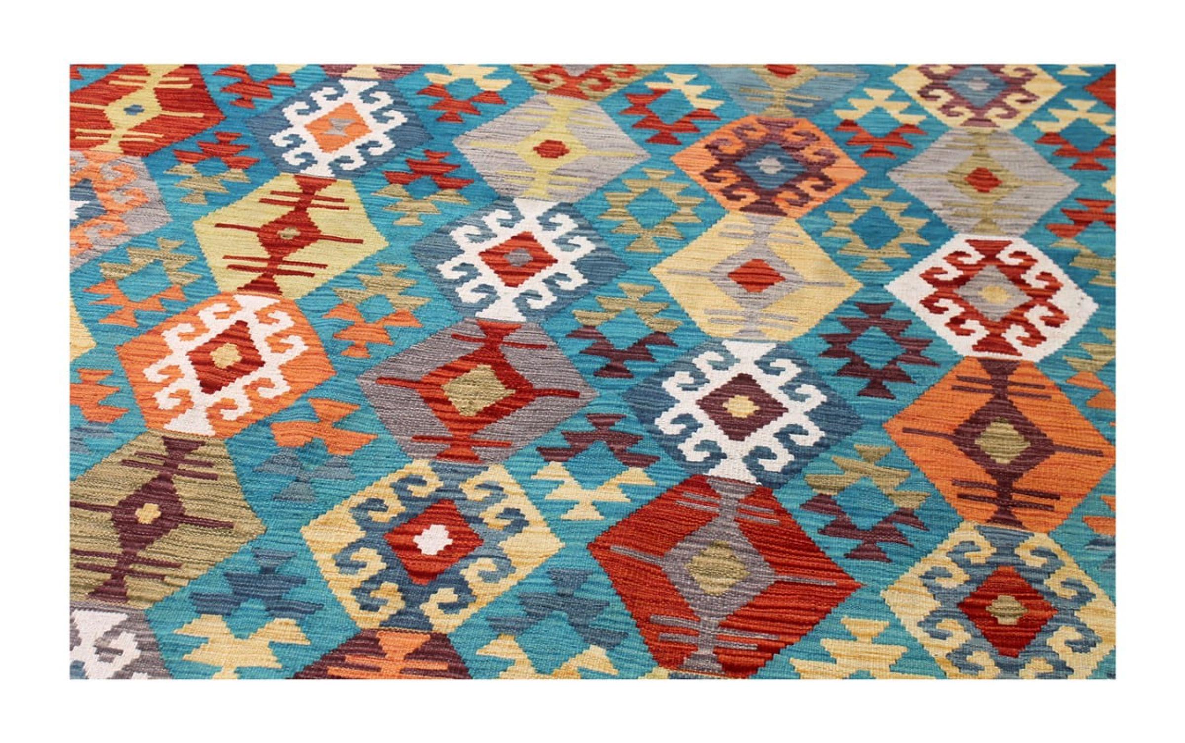 Estas alfombras kilim muestran una diferencia decisiva con las alfombras anudadas a mano - son tejidas a mano. Por lo tanto, no tienen un montón alto de lana y son a menudo más planos y más ásperos que las alfombras de lana anudada. Su fabricación es menos elaborada y por eso suelen ser mucho más baratas. Como ventaja, las alfombras de kilim son también mucho más ligeras y pueden ser colocadas por delante y por detrás. Los kilims tejidos a mano provienen originalmente de la antigua Persia y ahora también se fabrican a menudo en el Afganistán. Tienen patrones bastante simples y directos, que se deben a su técnica de tejido.