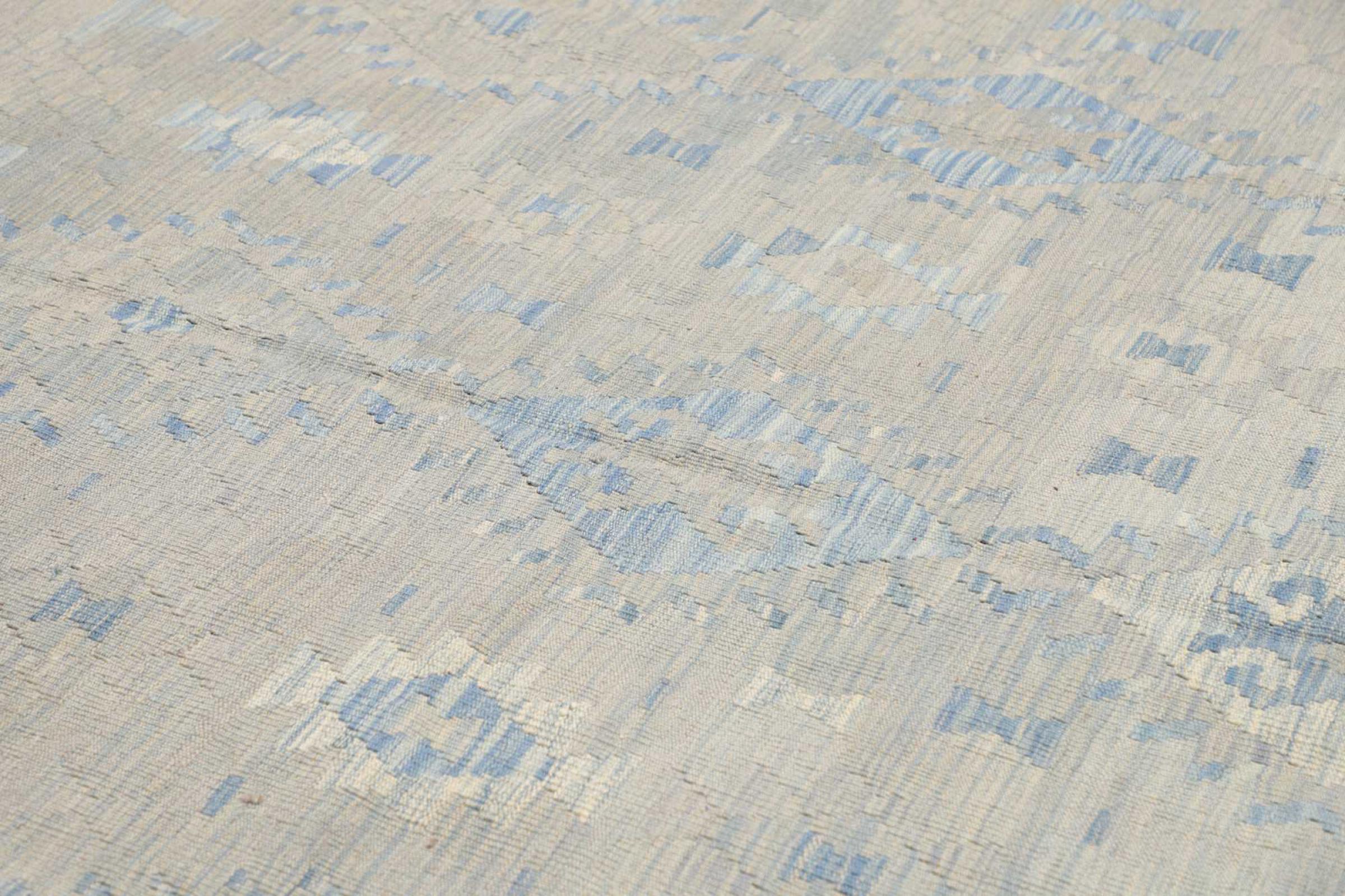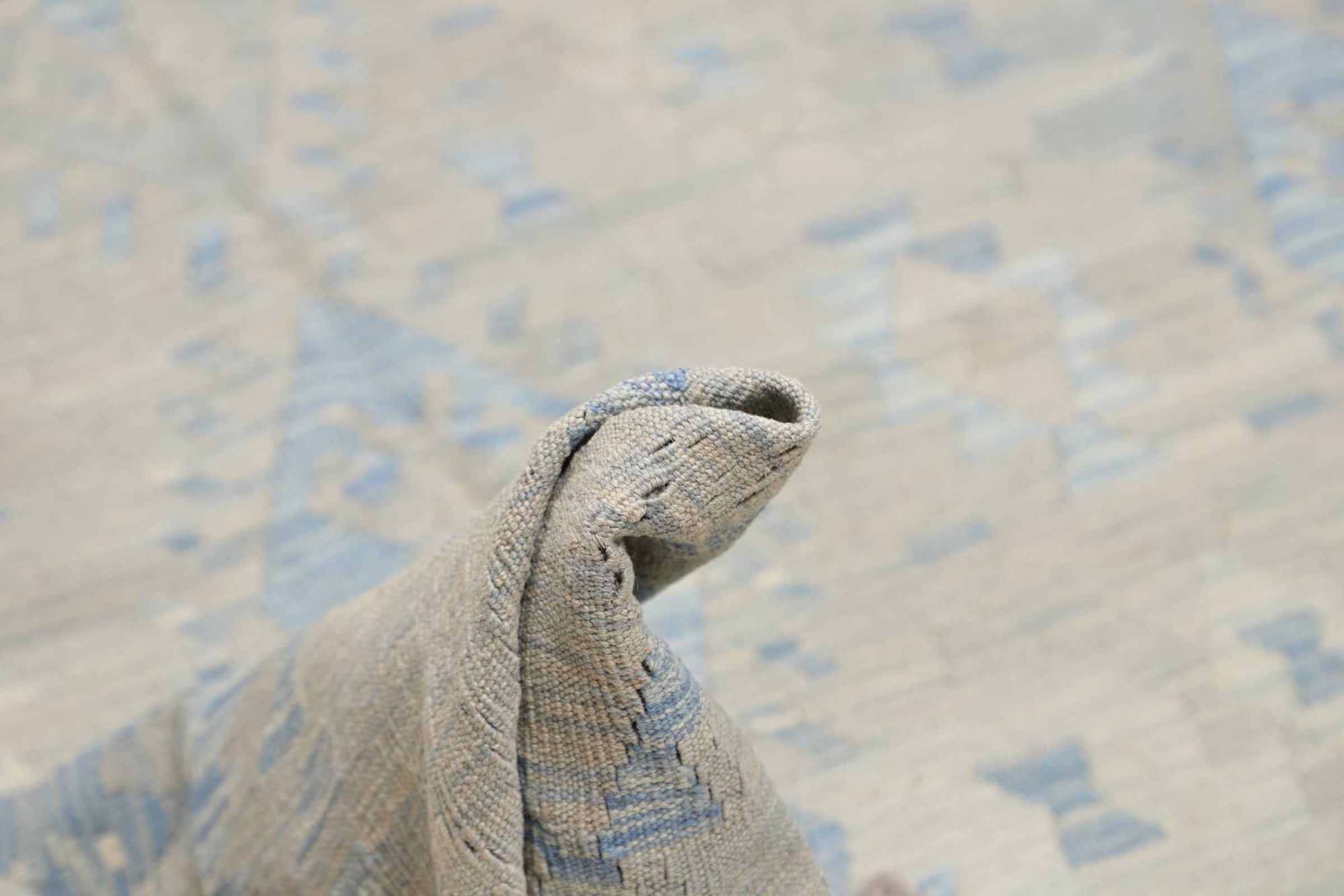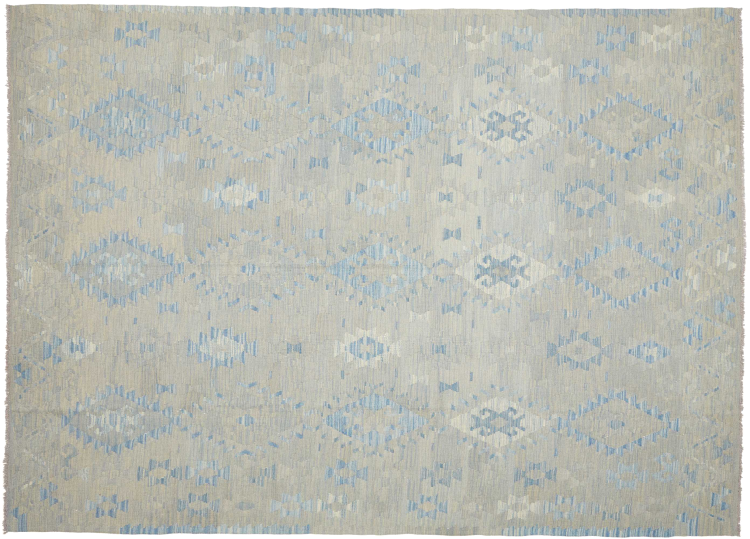 Esta alfombra fue hecha a mano en un telar como un tejido plano. Tejido plano es el término utilizado para describir las alfombras que no tienen pelo. Como el nombre promete, estas alfombras están tejidas y no anudadas. Esto resulta en una alfombra plana con una superficie estructurada. Los tejidos planos no son tan suaves y normalmente más delgados que las alfombras anudadas. Al mismo tiempo, su fabricación es mucho menos compleja y por lo general se pueden disponer por ambos lados (frontal y posterior). Sus patrones suelen ser geométricos, lo cual está determinado por el tejido.