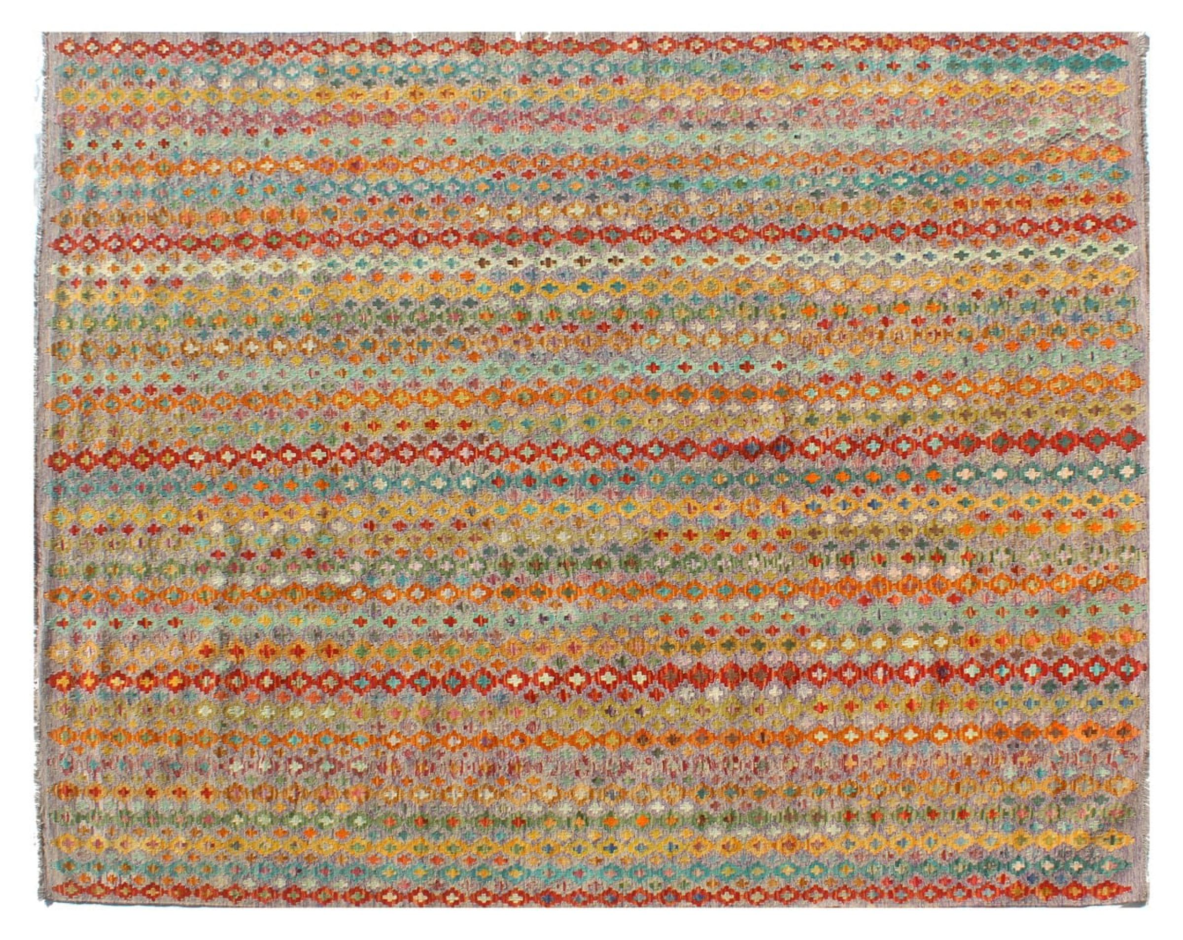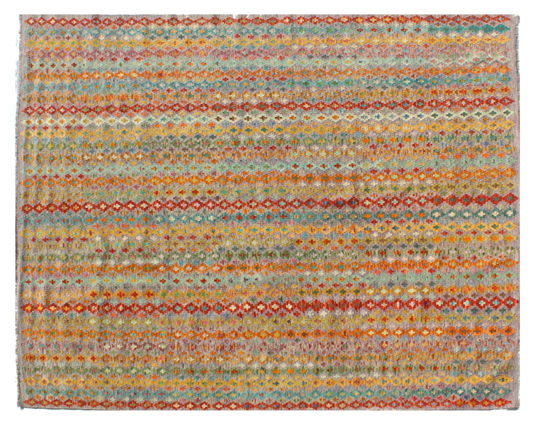 Esta alfombra fue hecha a mano en un telar como un tejido plano. Tejido plano es el término utilizado para describir las alfombras que no tienen pelo. Como el nombre promete, estas alfombras están tejidas y no anudadas. Esto resulta en una alfombra plana con una superficie estructurada. Los tejidos planos no son tan suaves y normalmente más delgados que las alfombras anudadas. Al mismo tiempo, su fabricación es mucho menos compleja y por lo general se pueden disponer por ambos lados (frontal y posterior). Sus patrones suelen ser geométricos, lo cual está determinado por el tejido.