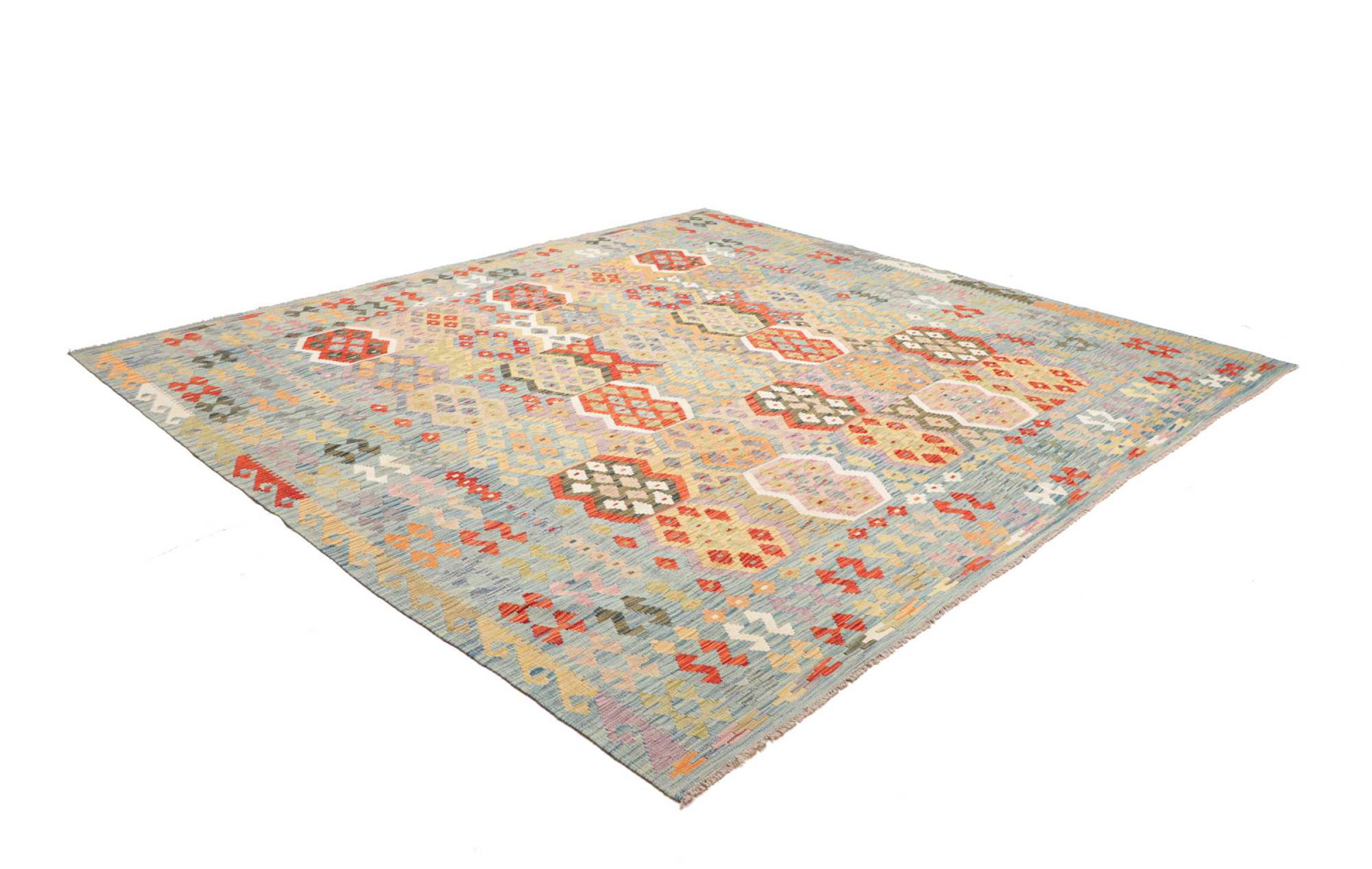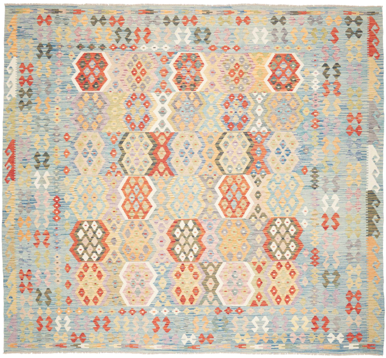 Esta alfombra fue hecha a mano en un telar como un tejido plano. Tejido plano es el término utilizado para describir las alfombras que no tienen pelo. Como el nombre promete, estas alfombras están tejidas y no anudadas. Esto resulta en una alfombra plana con una superficie estructurada. Los tejidos planos no son tan suaves y normalmente más delgados que las alfombras anudadas. Al mismo tiempo, su fabricación es mucho menos compleja y por lo general se pueden disponer por ambos lados (frontal y posterior). Sus patrones suelen ser geométricos, lo cual está determinado por el tejido.
