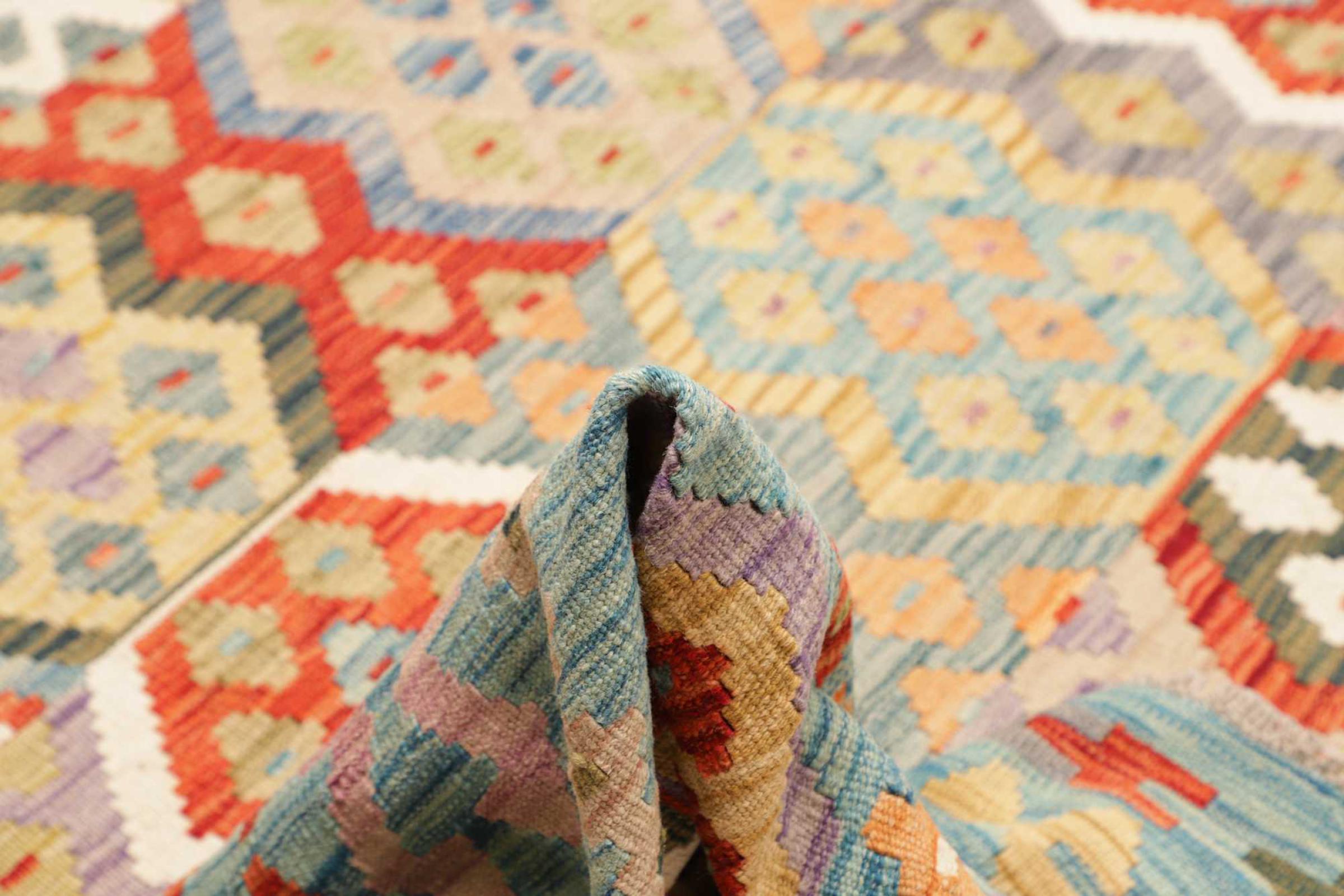 Estas alfombras kilim muestran una diferencia decisiva con las alfombras anudadas a mano - son tejidas a mano. Por lo tanto, no tienen un montón alto de lana y son a menudo más planos y más ásperos que las alfombras de lana anudada. Su fabricación es menos elaborada y por eso suelen ser mucho más baratas. Como ventaja, las alfombras de kilim son también mucho más ligeras y pueden ser colocadas por delante y por detrás. Los kilims tejidos a mano provienen originalmente de la antigua Persia y ahora también se fabrican a menudo en el Afganistán. Tienen patrones bastante simples y directos, que se deben a su técnica de tejido.