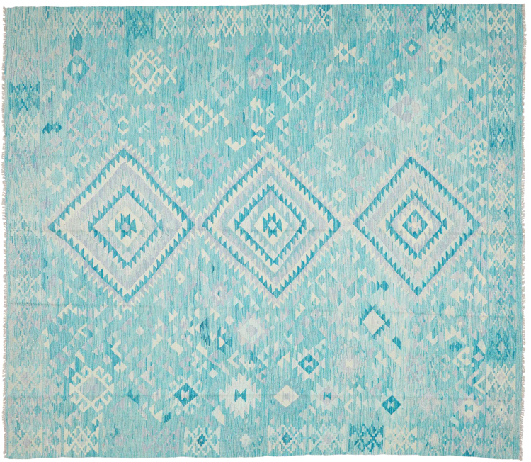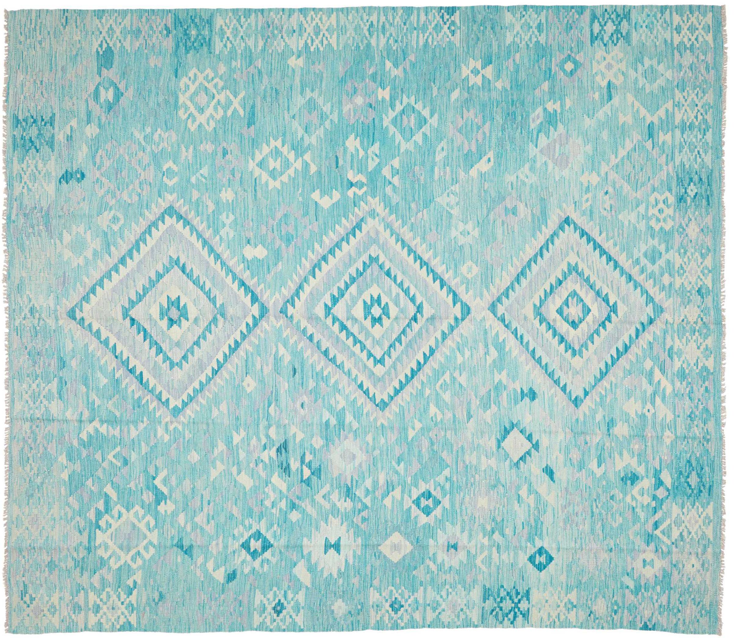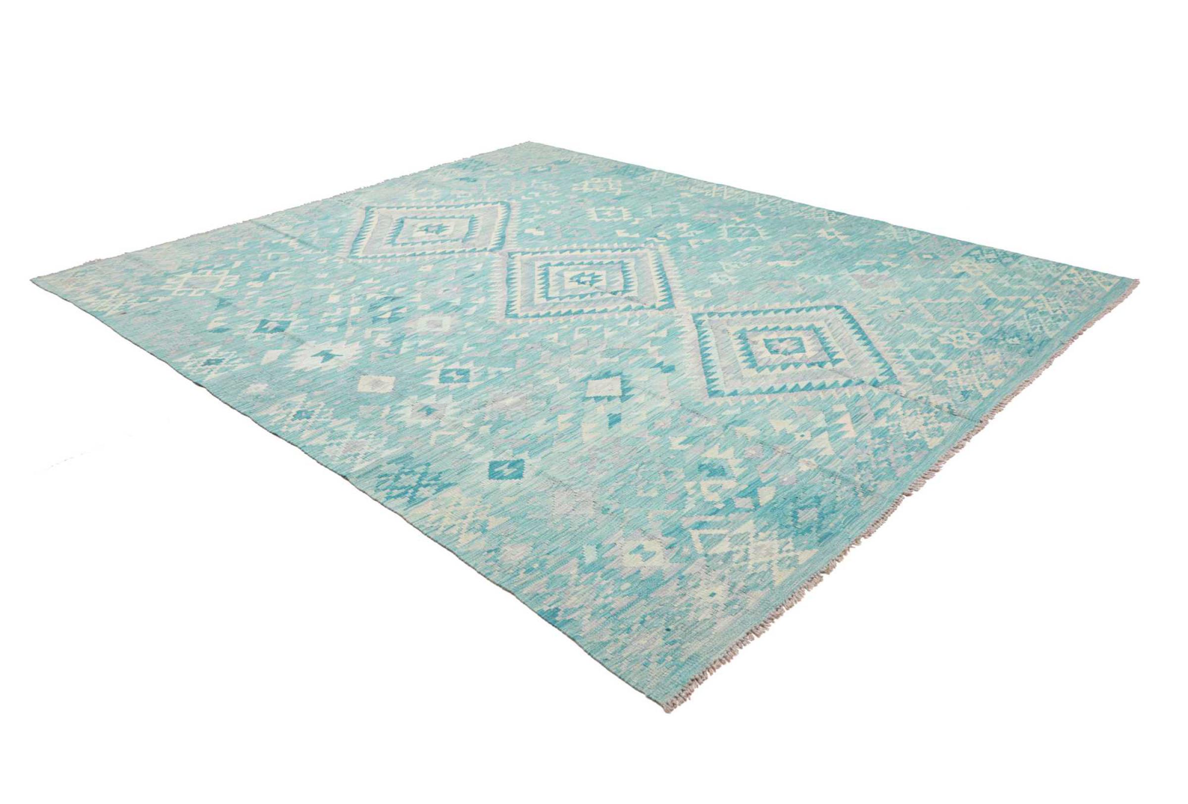Estas alfombras kilim muestran una diferencia decisiva con las alfombras anudadas a mano - son tejidas a mano. Por lo tanto, no tienen un montón alto de lana y son a menudo más planos y más ásperos que las alfombras de lana anudada. Su fabricación es menos elaborada y por eso suelen ser mucho más baratas. Como ventaja, las alfombras de kilim son también mucho más ligeras y pueden ser colocadas por delante y por detrás. Los kilims tejidos a mano provienen originalmente de la antigua Persia y ahora también se fabrican a menudo en el Afganistán. Tienen patrones bastante simples y directos, que se deben a su técnica de tejido.
