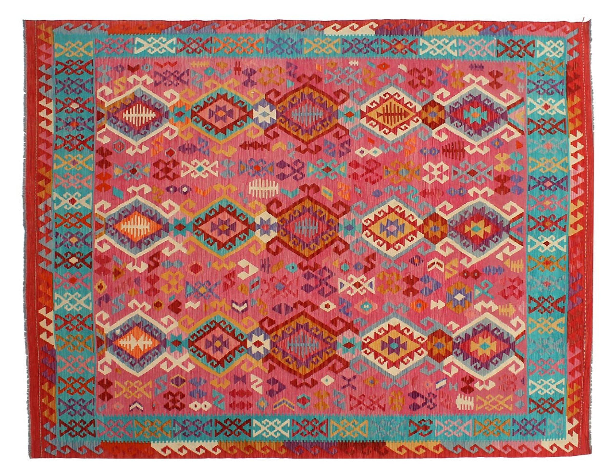 Estas alfombras kilim muestran una diferencia decisiva con las alfombras anudadas a mano - son tejidas a mano. Por lo tanto, no tienen un montón alto de lana y son a menudo más planos y más ásperos que las alfombras de lana anudada. Su fabricación es menos elaborada y por eso suelen ser mucho más baratas. Como ventaja, las alfombras de kilim son también mucho más ligeras y pueden ser colocadas por delante y por detrás. Los kilims tejidos a mano provienen originalmente de la antigua Persia y ahora también se fabrican a menudo en el Afganistán. Tienen patrones bastante simples y directos, que se deben a su técnica de tejido.