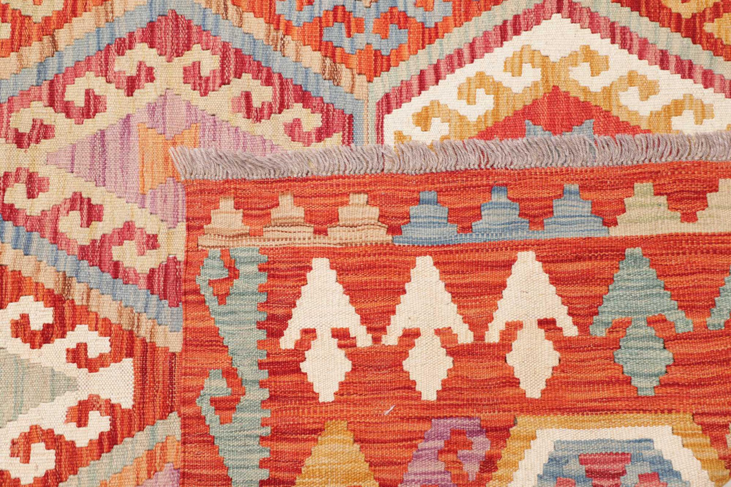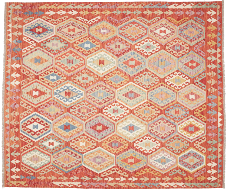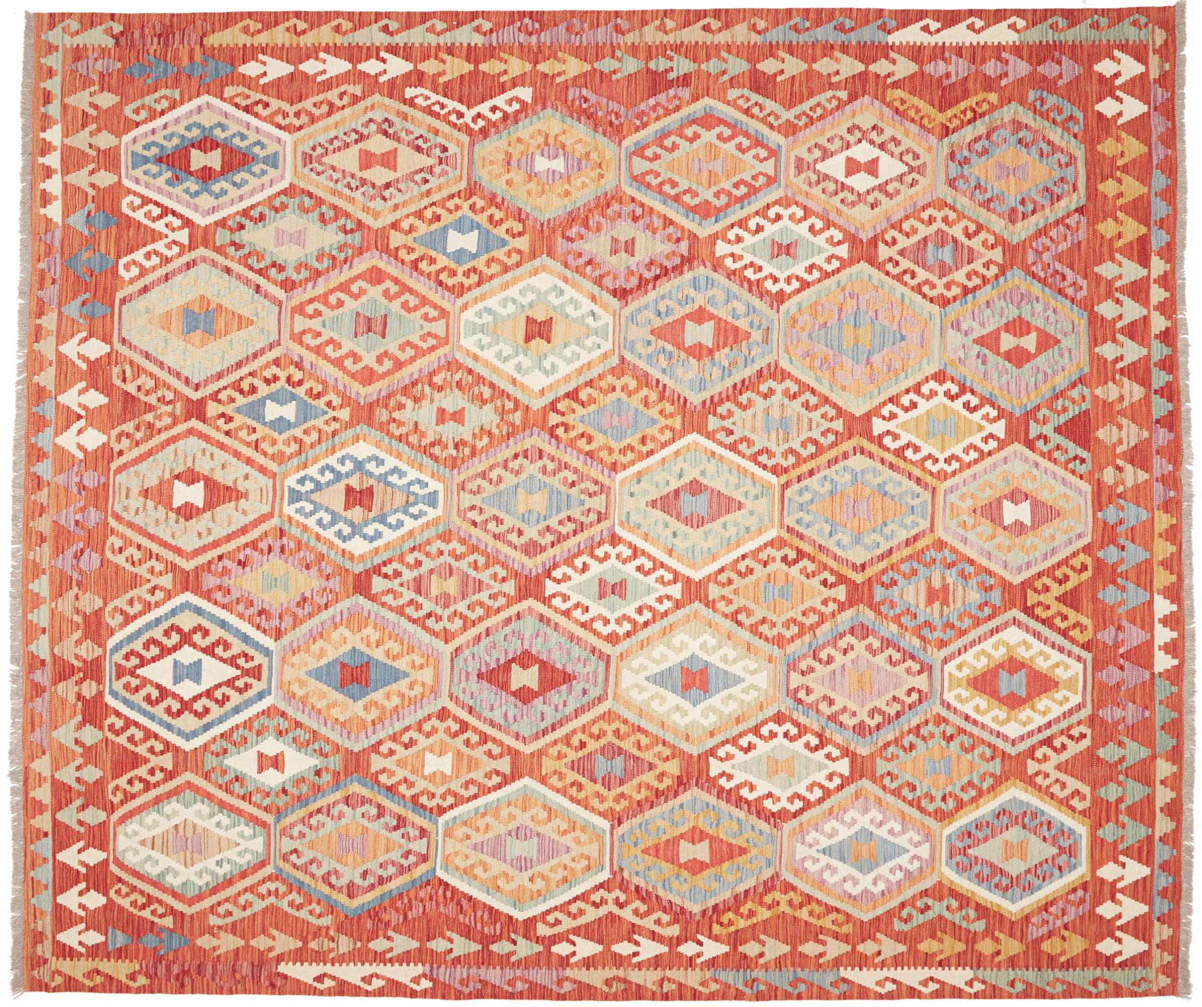 Estas alfombras kilim muestran una diferencia decisiva con las alfombras anudadas a mano - son tejidas a mano. Por lo tanto, no tienen un montón alto de lana y son a menudo más planos y más ásperos que las alfombras de lana anudada. Su fabricación es menos elaborada y por eso suelen ser mucho más baratas. Como ventaja, las alfombras de kilim son también mucho más ligeras y pueden ser colocadas por delante y por detrás. Los kilims tejidos a mano provienen originalmente de la antigua Persia y ahora también se fabrican a menudo en el Afganistán. Tienen patrones bastante simples y directos, que se deben a su técnica de tejido.