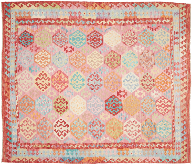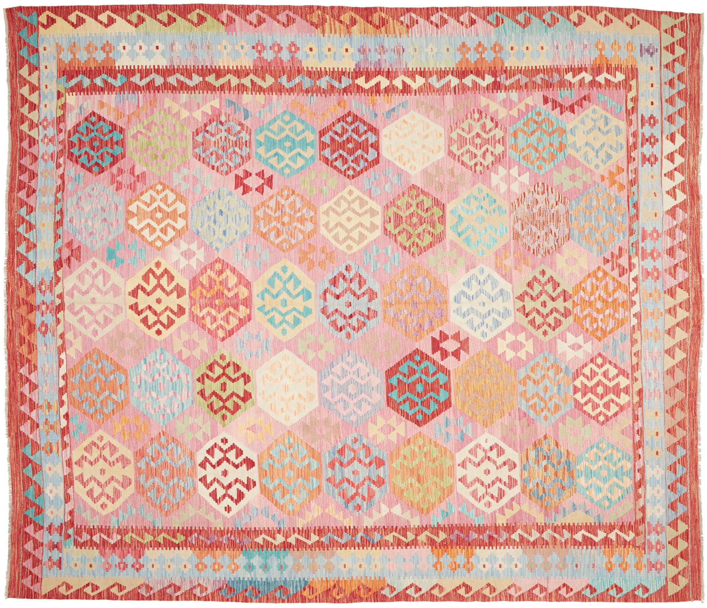 Estas alfombras kilim muestran una diferencia decisiva con las alfombras anudadas a mano - son tejidas a mano. Por lo tanto, no tienen un montón alto de lana y son a menudo más planos y más ásperos que las alfombras de lana anudada. Su fabricación es menos elaborada y por eso suelen ser mucho más baratas. Como ventaja, las alfombras de kilim son también mucho más ligeras y pueden ser colocadas por delante y por detrás. Los kilims tejidos a mano provienen originalmente de la antigua Persia y ahora también se fabrican a menudo en el Afganistán. Tienen patrones bastante simples y directos, que se deben a su técnica de tejido.