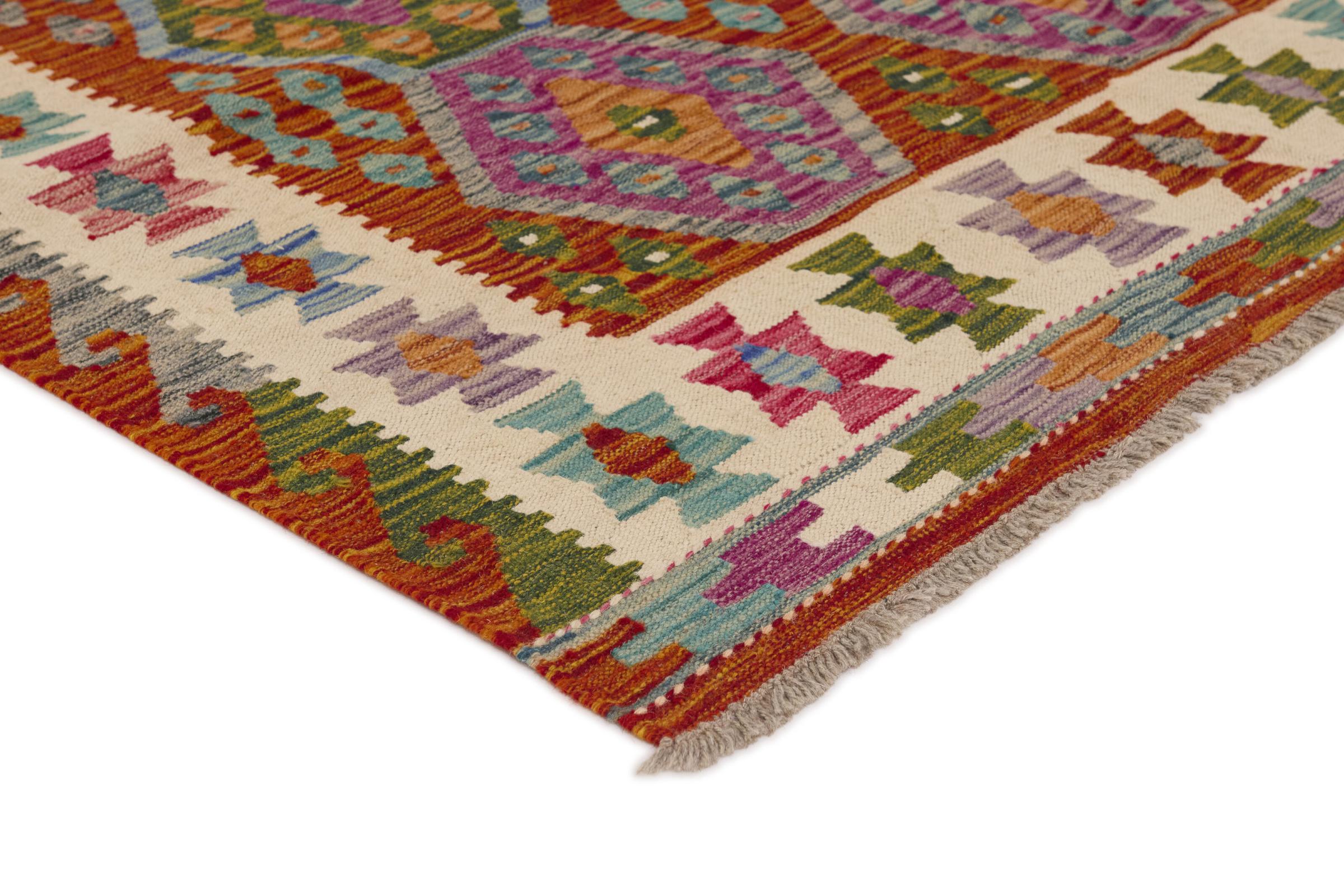 Estas alfombras kilim muestran una diferencia decisiva con las alfombras anudadas a mano - son tejidas a mano. Por lo tanto, no tienen un montón alto de lana y son a menudo más planos y más ásperos que las alfombras de lana anudada. Su fabricación es menos elaborada y por eso suelen ser mucho más baratas. Como ventaja, las alfombras de kilim son también mucho más ligeras y pueden ser colocadas por delante y por detrás. Los kilims tejidos a mano provienen originalmente de la antigua Persia y ahora también se fabrican a menudo en el Afganistán. Tienen patrones bastante simples y directos, que se deben a su técnica de tejido.