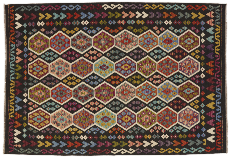 Esta alfombra fue hecha a mano en un telar como un tejido plano. Tejido plano es el término utilizado para describir las alfombras que no tienen pelo. Como el nombre promete, estas alfombras están tejidas y no anudadas. Esto resulta en una alfombra plana con una superficie estructurada. Los tejidos planos no son tan suaves y normalmente más delgados que las alfombras anudadas. Al mismo tiempo, su fabricación es mucho menos compleja y por lo general se pueden disponer por ambos lados (frontal y posterior). Sus patrones suelen ser geométricos, lo cual está determinado por el tejido.