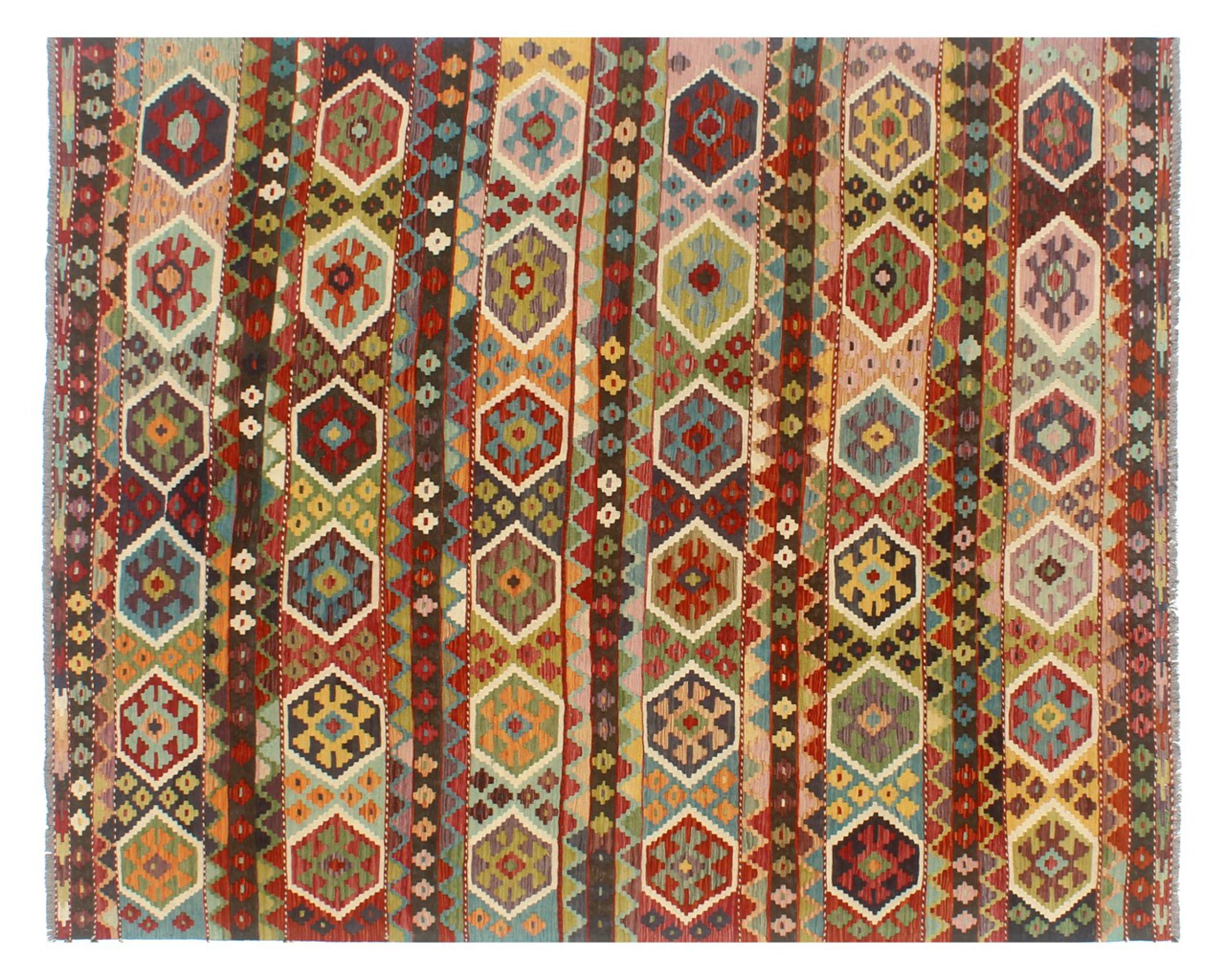 Estas alfombras kilim muestran una diferencia decisiva con las alfombras anudadas a mano - son tejidas a mano. Por lo tanto, no tienen un montón alto de lana y son a menudo más planos y más ásperos que las alfombras de lana anudada. Su fabricación es menos elaborada y por eso suelen ser mucho más baratas. Como ventaja, las alfombras de kilim son también mucho más ligeras y pueden ser colocadas por delante y por detrás. Los kilims tejidos a mano provienen originalmente de la antigua Persia y ahora también se fabrican a menudo en el Afganistán. Tienen patrones bastante simples y directos, que se deben a su técnica de tejido.