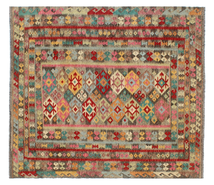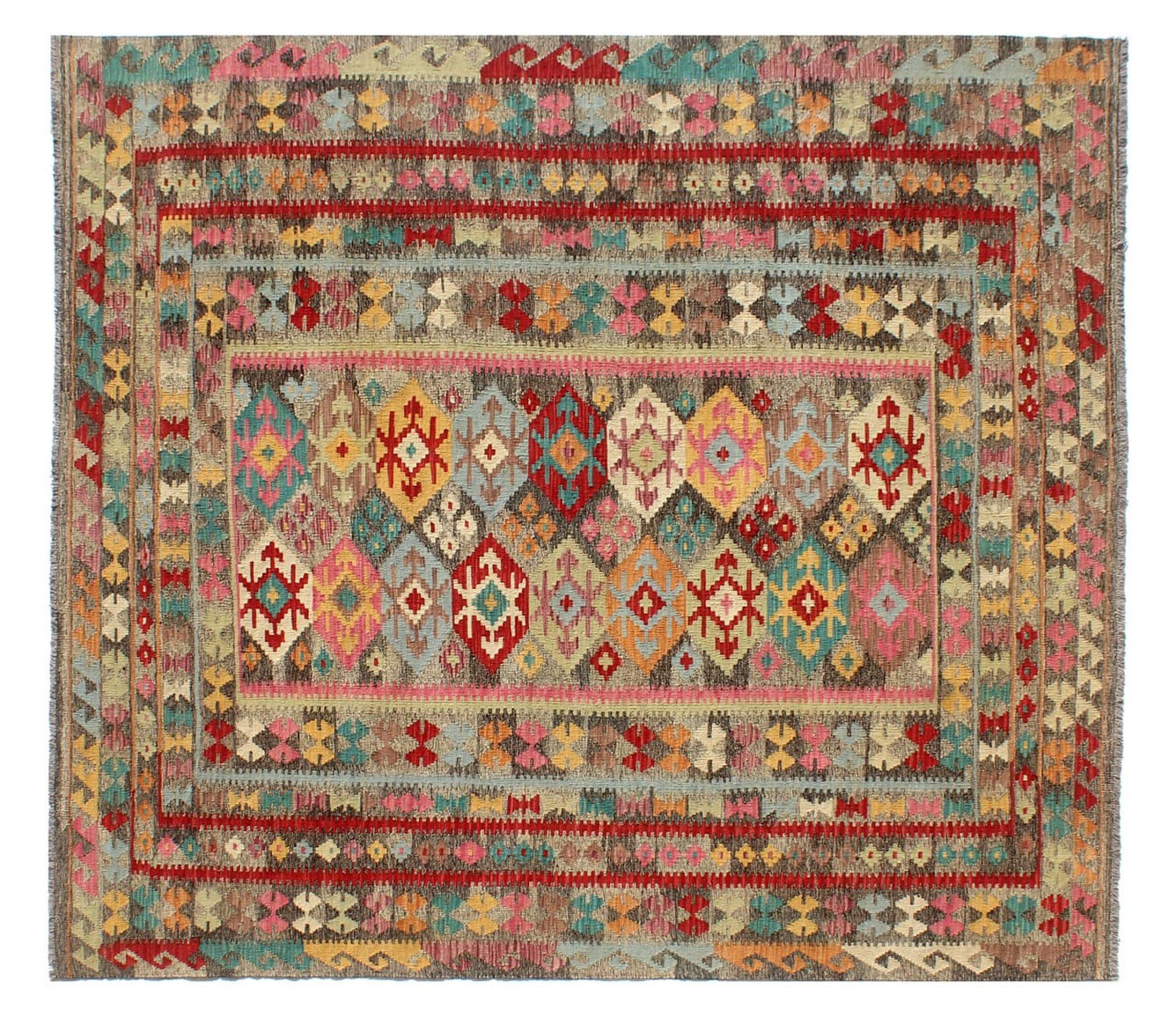 Estas alfombras kilim muestran una diferencia decisiva con las alfombras anudadas a mano - son tejidas a mano. Por lo tanto, no tienen un montón alto de lana y son a menudo más planos y más ásperos que las alfombras de lana anudada. Su fabricación es menos elaborada y por eso suelen ser mucho más baratas. Como ventaja, las alfombras de kilim son también mucho más ligeras y pueden ser colocadas por delante y por detrás. Los kilims tejidos a mano provienen originalmente de la antigua Persia y ahora también se fabrican a menudo en el Afganistán. Tienen patrones bastante simples y directos, que se deben a su técnica de tejido.