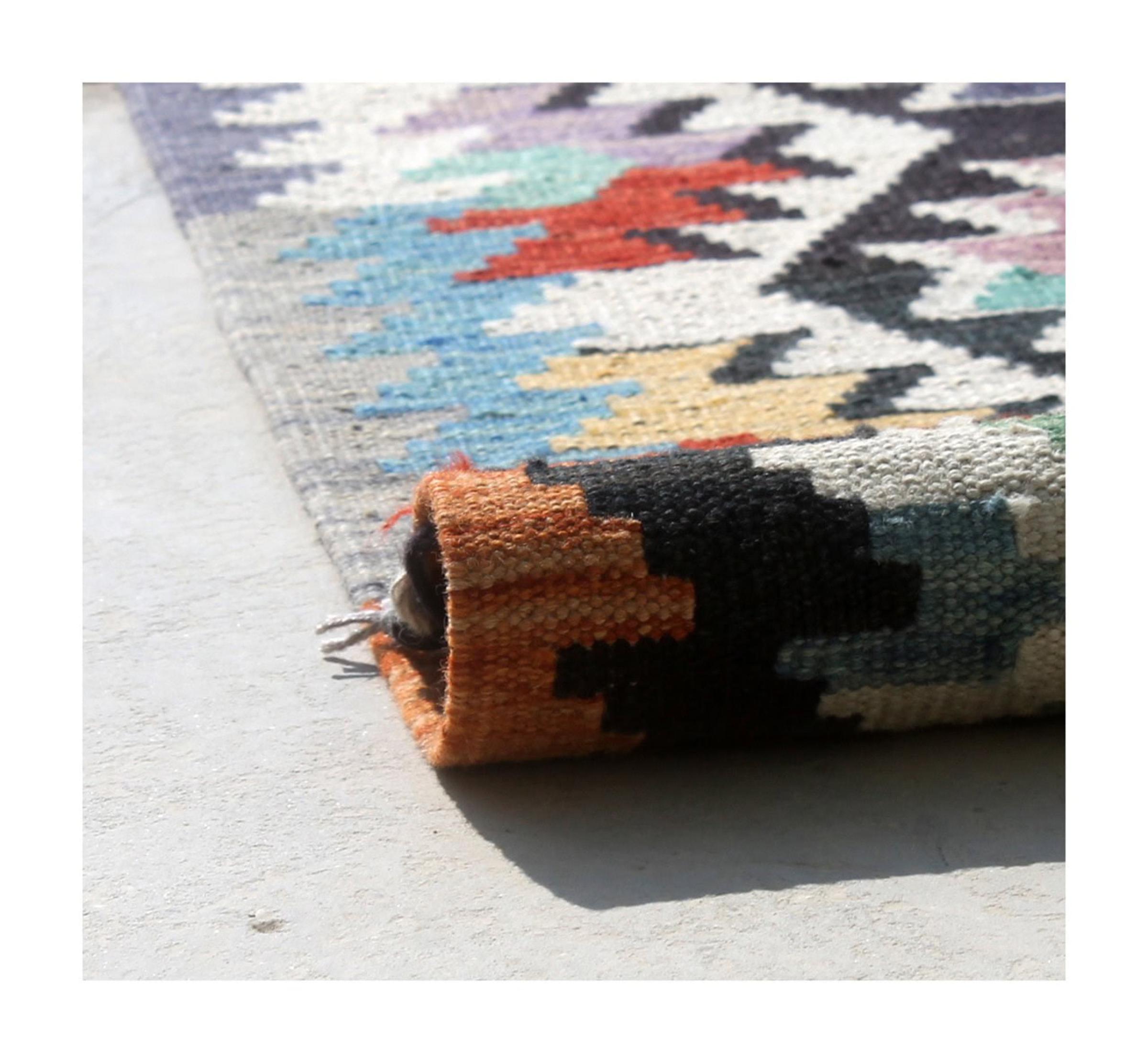 Estas alfombras kilim muestran una diferencia decisiva con las alfombras anudadas a mano - son tejidas a mano. Por lo tanto, no tienen un montón alto de lana y son a menudo más planos y más ásperos que las alfombras de lana anudada. Su fabricación es menos elaborada y por eso suelen ser mucho más baratas. Como ventaja, las alfombras de kilim son también mucho más ligeras y pueden ser colocadas por delante y por detrás. Los kilims tejidos a mano provienen originalmente de la antigua Persia y ahora también se fabrican a menudo en el Afganistán. Tienen patrones bastante simples y directos, que se deben a su técnica de tejido.
