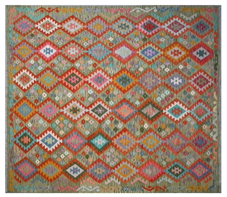 Esta alfombra fue hecha a mano en un telar como un tejido plano. Tejido plano es el término utilizado para describir las alfombras que no tienen pelo. Como el nombre promete, estas alfombras están tejidas y no anudadas. Esto resulta en una alfombra plana con una superficie estructurada. Los tejidos planos no son tan suaves y normalmente más delgados que las alfombras anudadas. Al mismo tiempo, su fabricación es mucho menos compleja y por lo general se pueden disponer por ambos lados (frontal y posterior). Sus patrones suelen ser geométricos, lo cual está determinado por el tejido.