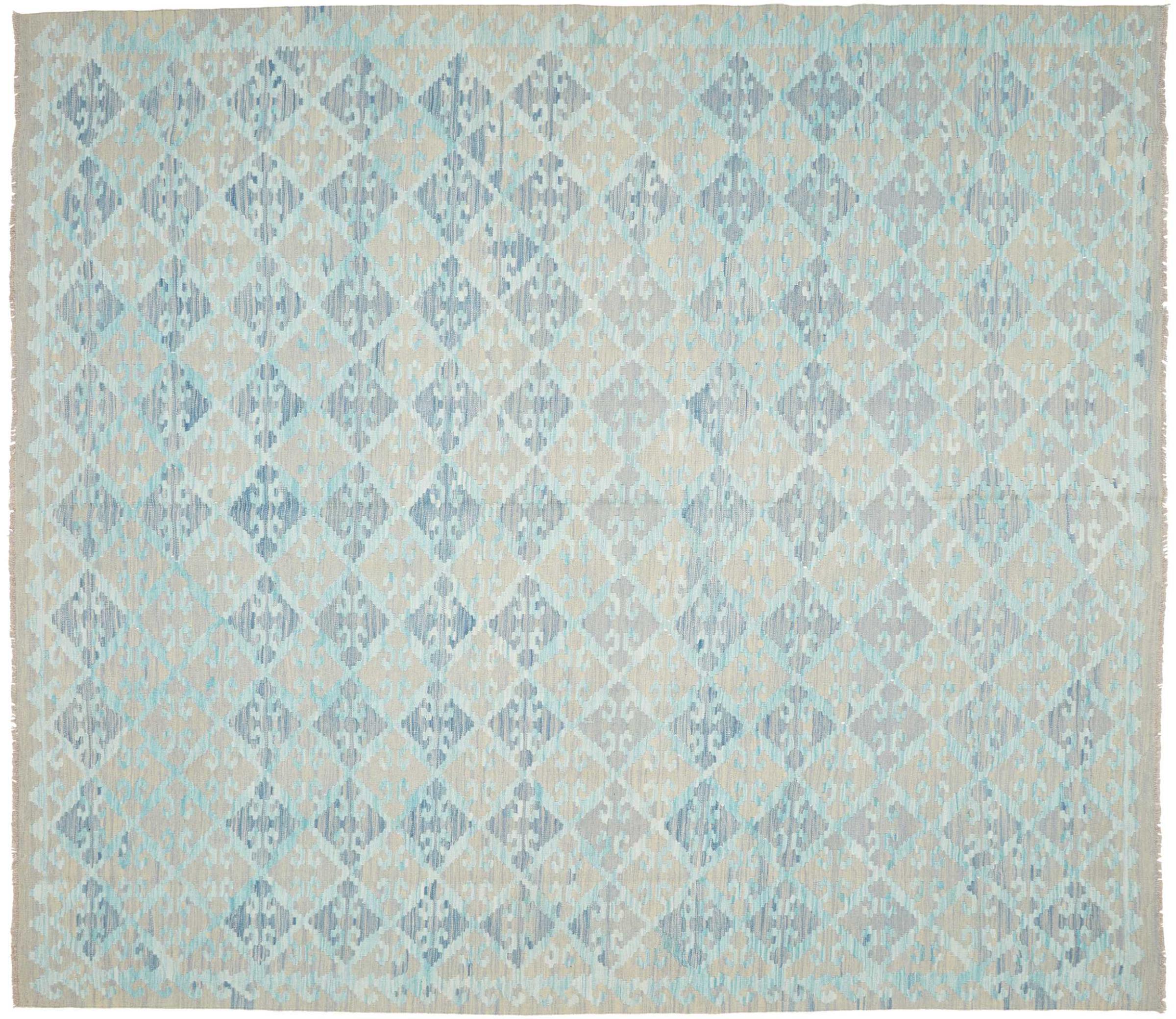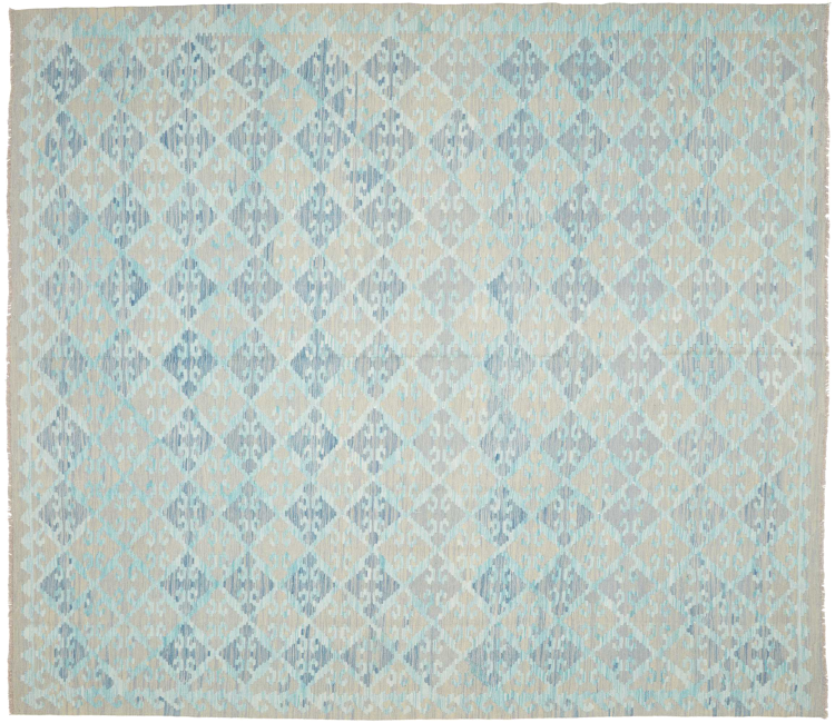 Esta alfombra fue hecha a mano en un telar como un tejido plano. Tejido plano es el término utilizado para describir las alfombras que no tienen pelo. Como el nombre promete, estas alfombras están tejidas y no anudadas. Esto resulta en una alfombra plana con una superficie estructurada. Los tejidos planos no son tan suaves y normalmente más delgados que las alfombras anudadas. Al mismo tiempo, su fabricación es mucho menos compleja y por lo general se pueden disponer por ambos lados (frontal y posterior). Sus patrones suelen ser geométricos, lo cual está determinado por el tejido.