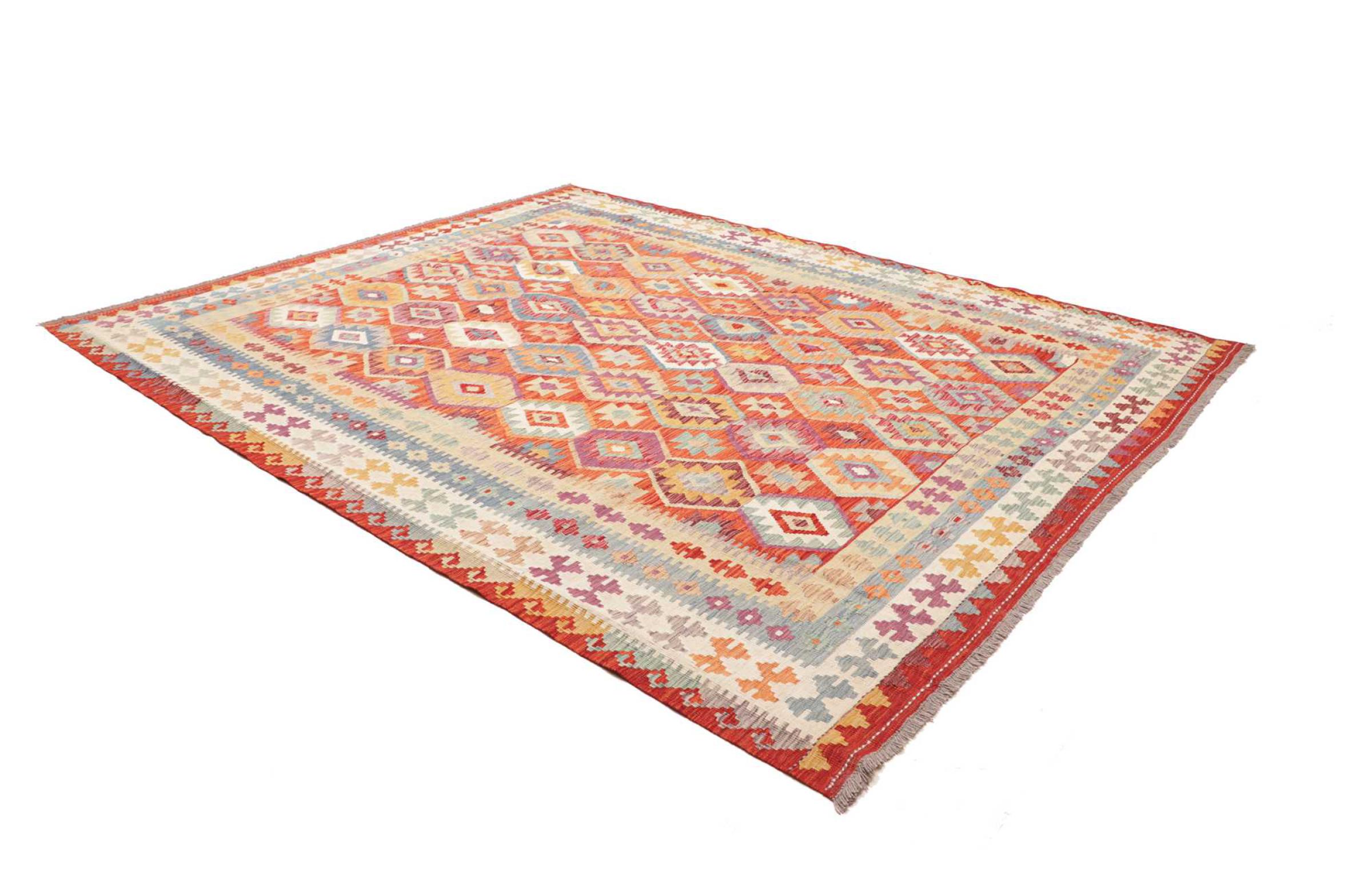 Estas alfombras kilim muestran una diferencia decisiva con las alfombras anudadas a mano - son tejidas a mano. Por lo tanto, no tienen un montón alto de lana y son a menudo más planos y más ásperos que las alfombras de lana anudada. Su fabricación es menos elaborada y por eso suelen ser mucho más baratas. Como ventaja, las alfombras de kilim son también mucho más ligeras y pueden ser colocadas por delante y por detrás. Los kilims tejidos a mano provienen originalmente de la antigua Persia y ahora también se fabrican a menudo en el Afganistán. Tienen patrones bastante simples y directos, que se deben a su técnica de tejido.
