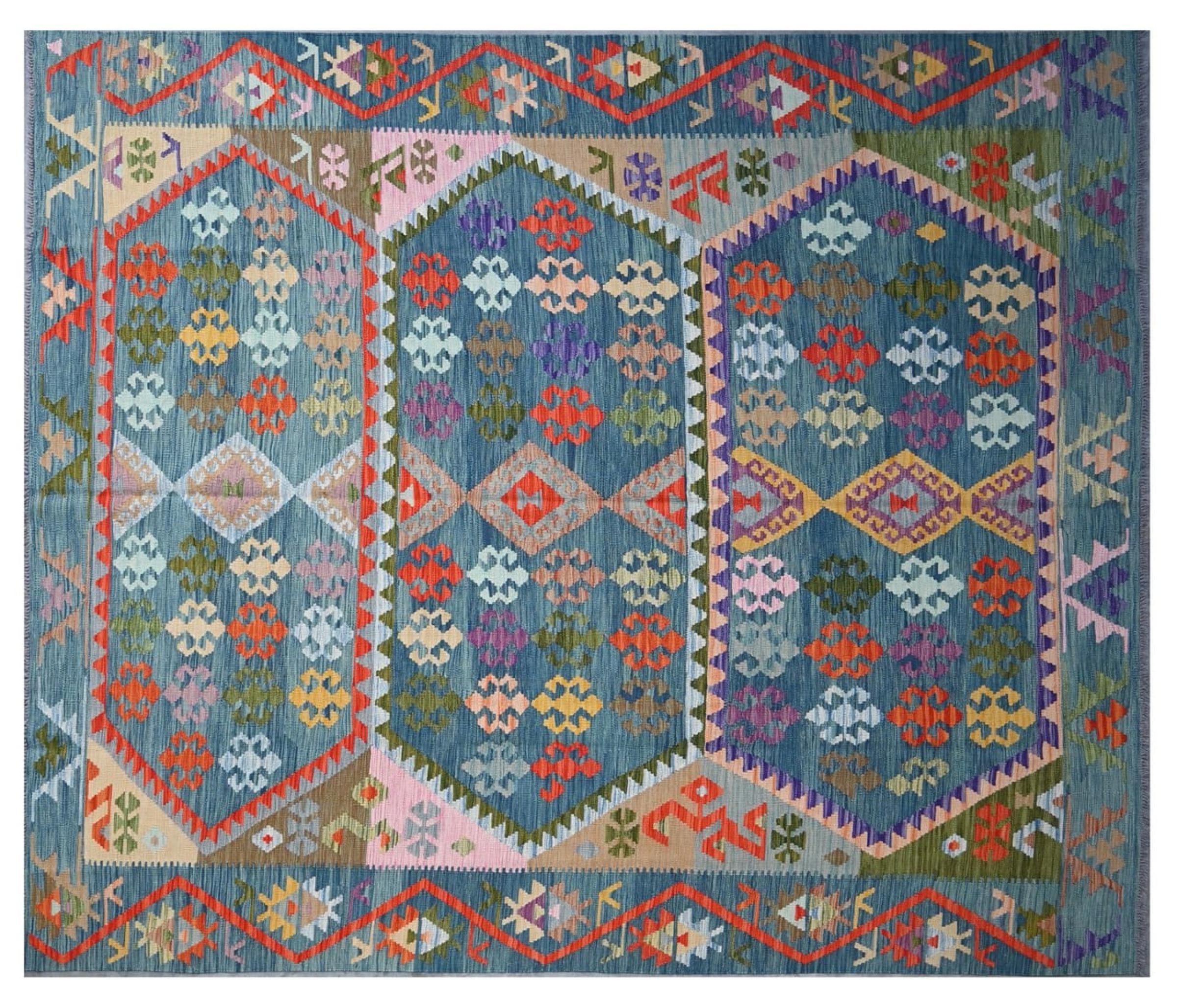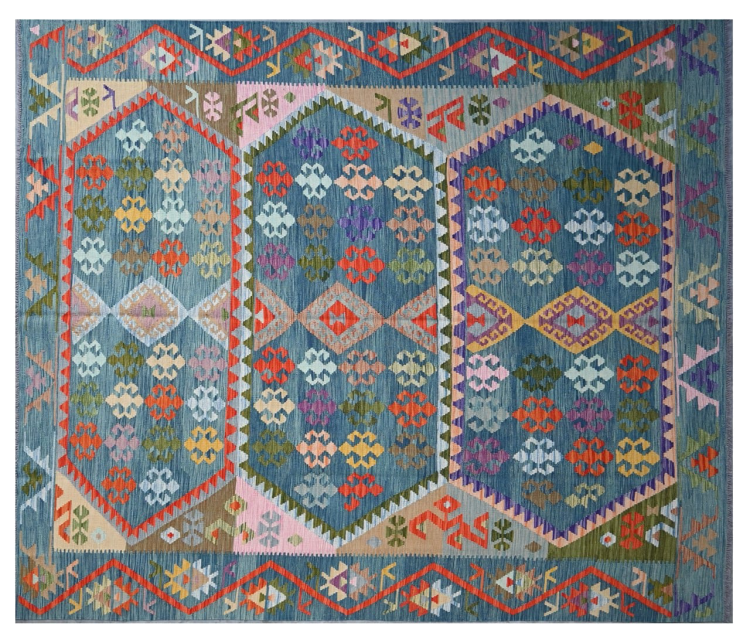 Estas alfombras kilim muestran una diferencia decisiva con las alfombras anudadas a mano - son tejidas a mano. Por lo tanto, no tienen un montón alto de lana y son a menudo más planos y más ásperos que las alfombras de lana anudada. Su fabricación es menos elaborada y por eso suelen ser mucho más baratas. Como ventaja, las alfombras de kilim son también mucho más ligeras y pueden ser colocadas por delante y por detrás. Los kilims tejidos a mano provienen originalmente de la antigua Persia y ahora también se fabrican a menudo en el Afganistán. Tienen patrones bastante simples y directos, que se deben a su técnica de tejido.