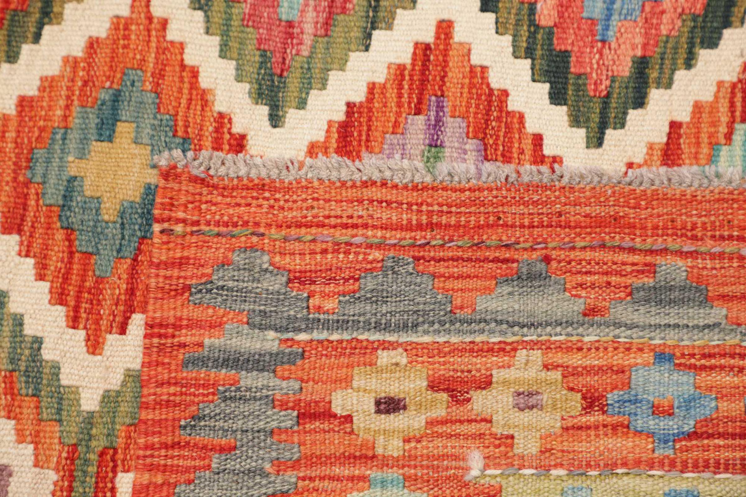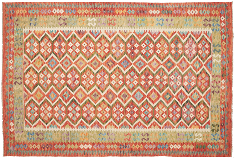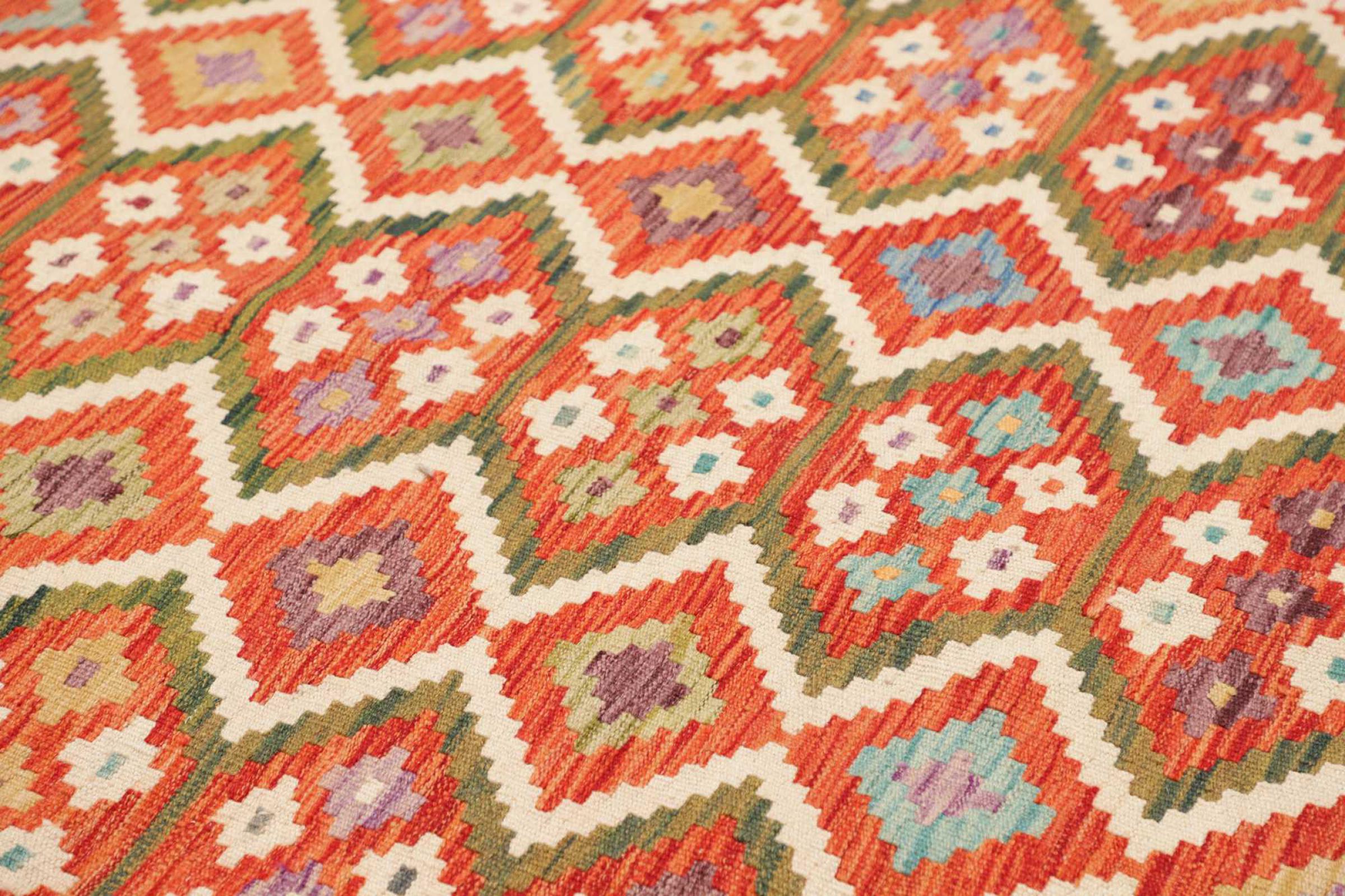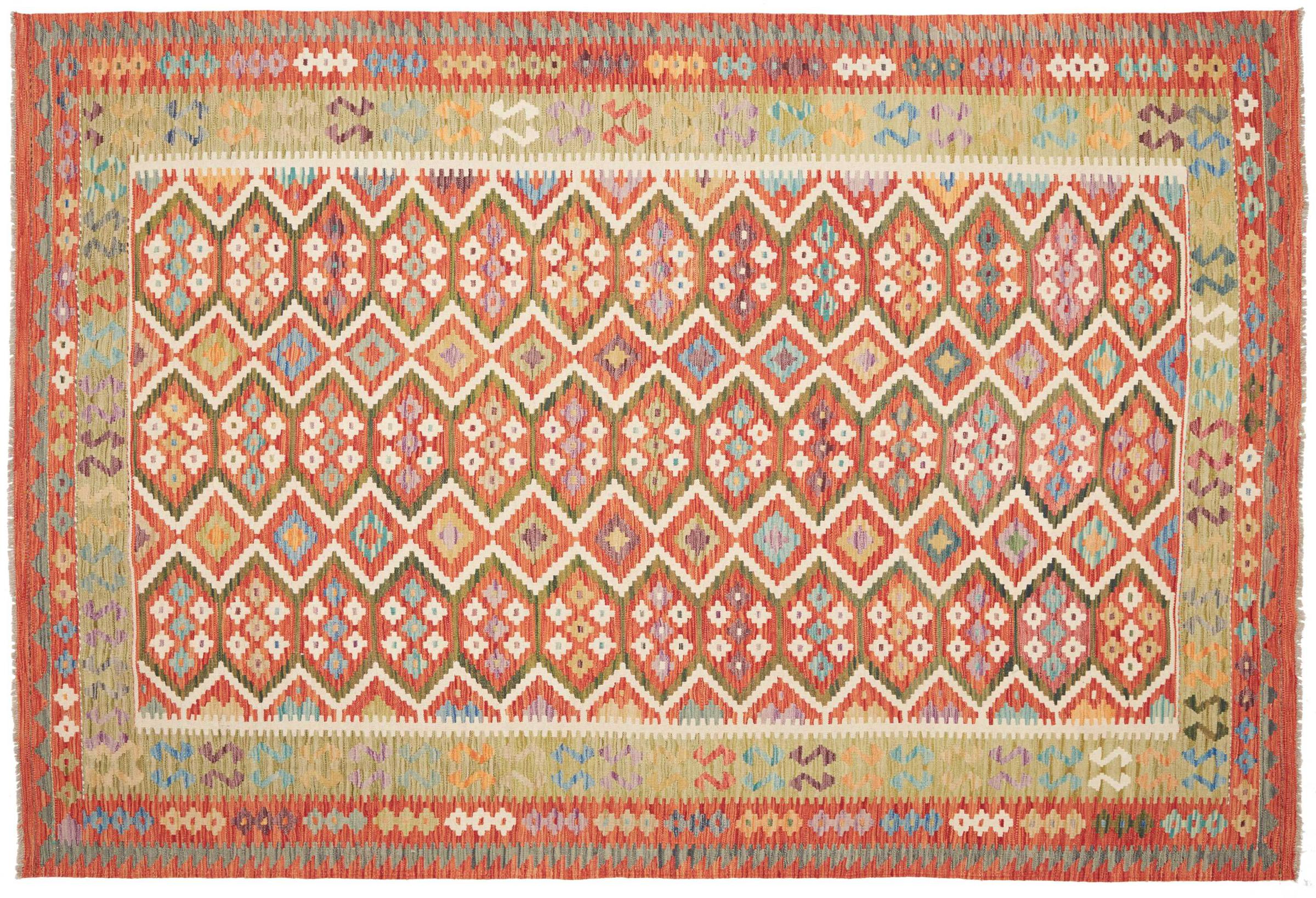 Estas alfombras kilim muestran una diferencia decisiva con las alfombras anudadas a mano - son tejidas a mano. Por lo tanto, no tienen un montón alto de lana y son a menudo más planos y más ásperos que las alfombras de lana anudada. Su fabricación es menos elaborada y por eso suelen ser mucho más baratas. Como ventaja, las alfombras de kilim son también mucho más ligeras y pueden ser colocadas por delante y por detrás. Los kilims tejidos a mano provienen originalmente de la antigua Persia y ahora también se fabrican a menudo en el Afganistán. Tienen patrones bastante simples y directos, que se deben a su técnica de tejido.