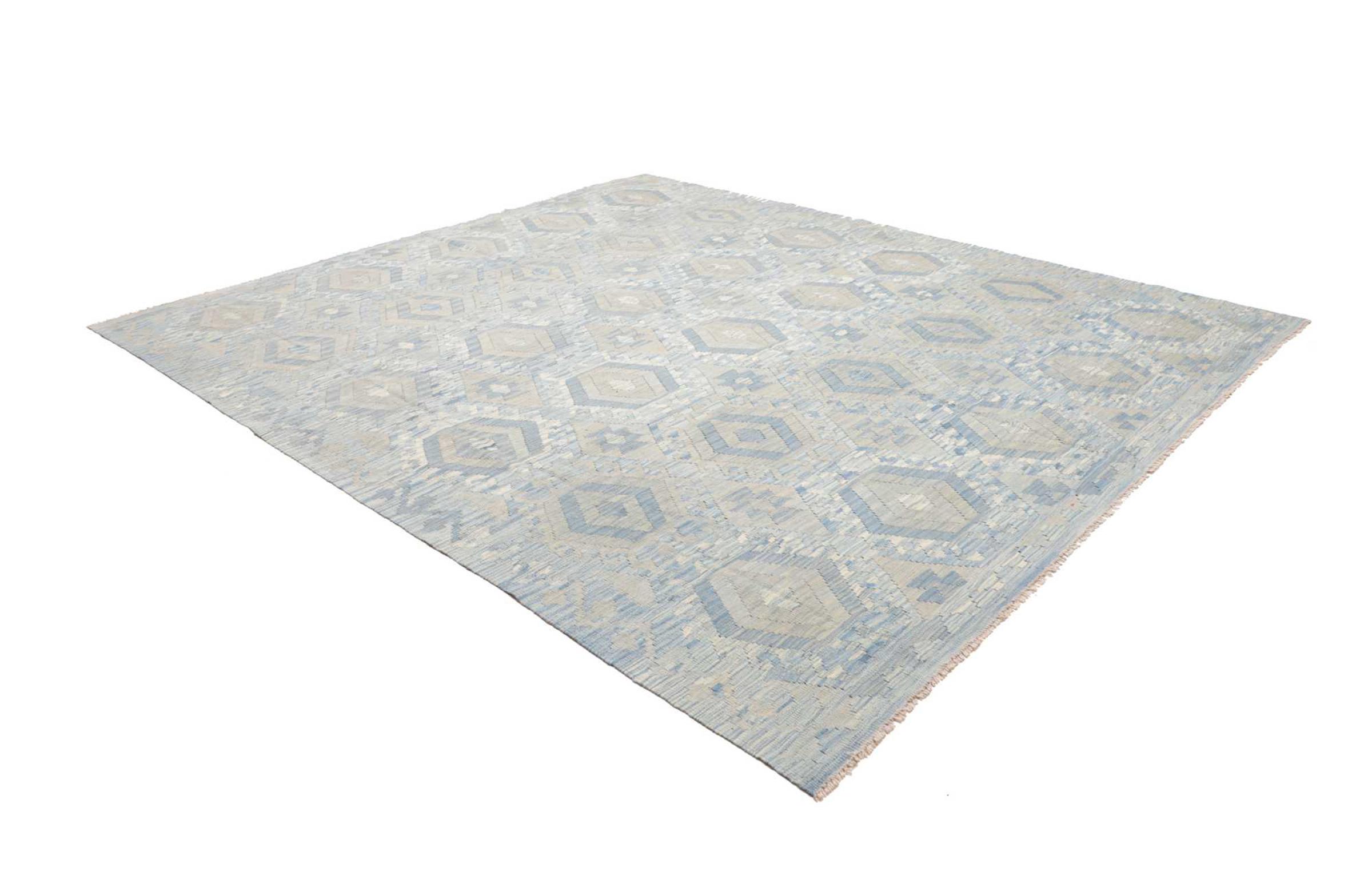Estas alfombras kilim muestran una diferencia decisiva con las alfombras anudadas a mano - son tejidas a mano. Por lo tanto, no tienen un montón alto de lana y son a menudo más planos y más ásperos que las alfombras de lana anudada. Su fabricación es menos elaborada y por eso suelen ser mucho más baratas. Como ventaja, las alfombras de kilim son también mucho más ligeras y pueden ser colocadas por delante y por detrás. Los kilims tejidos a mano provienen originalmente de la antigua Persia y ahora también se fabrican a menudo en el Afganistán. Tienen patrones bastante simples y directos, que se deben a su técnica de tejido.