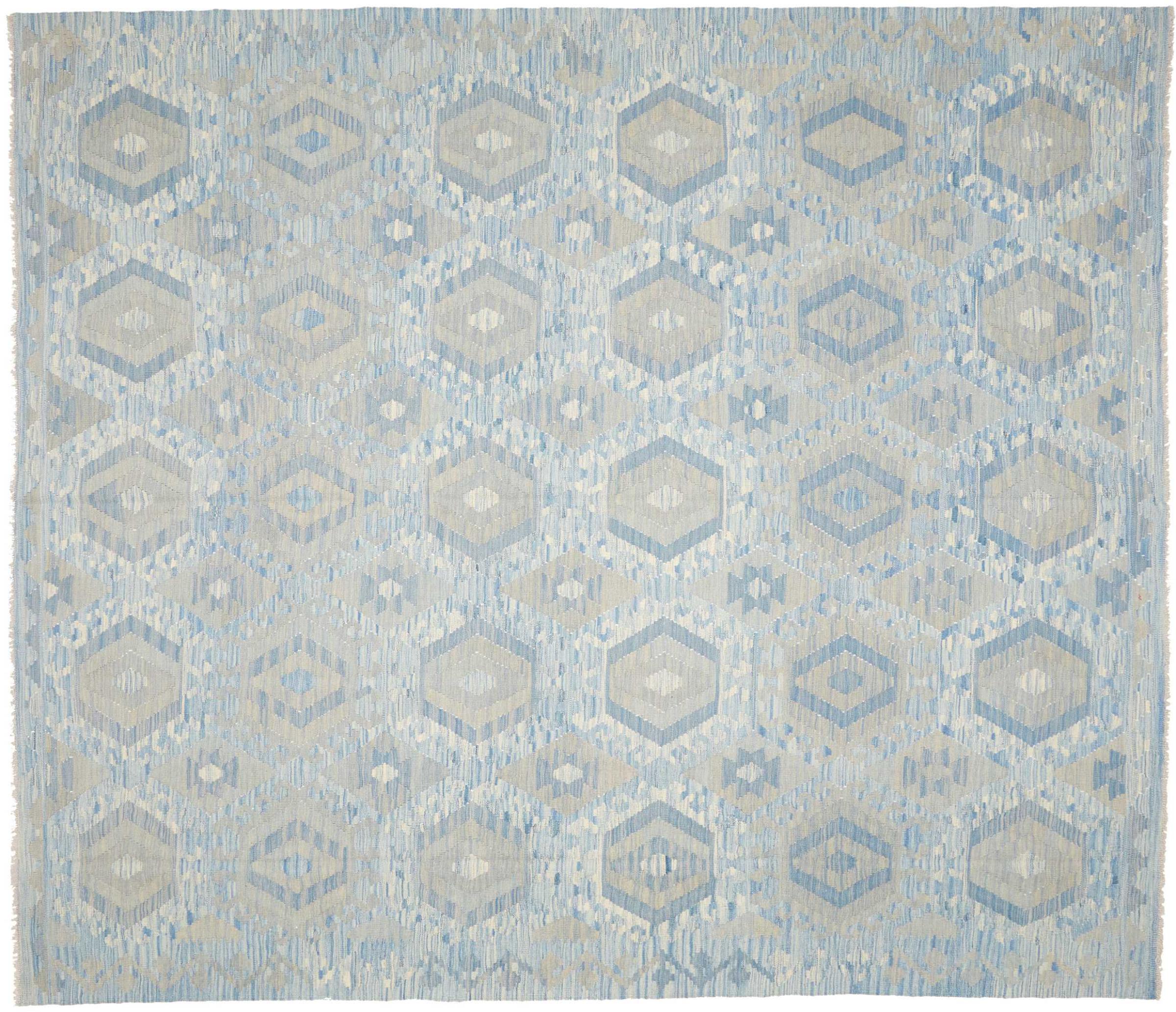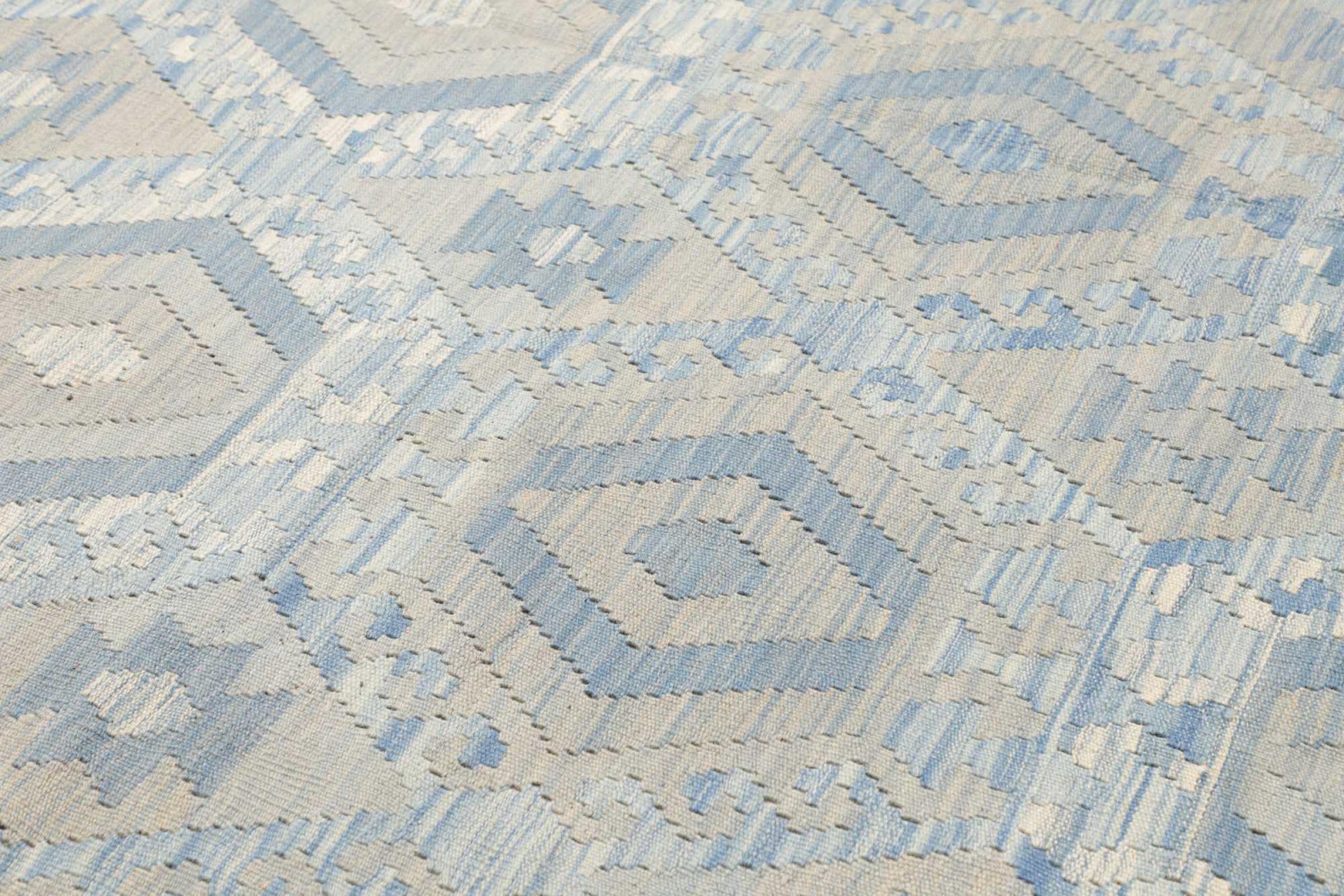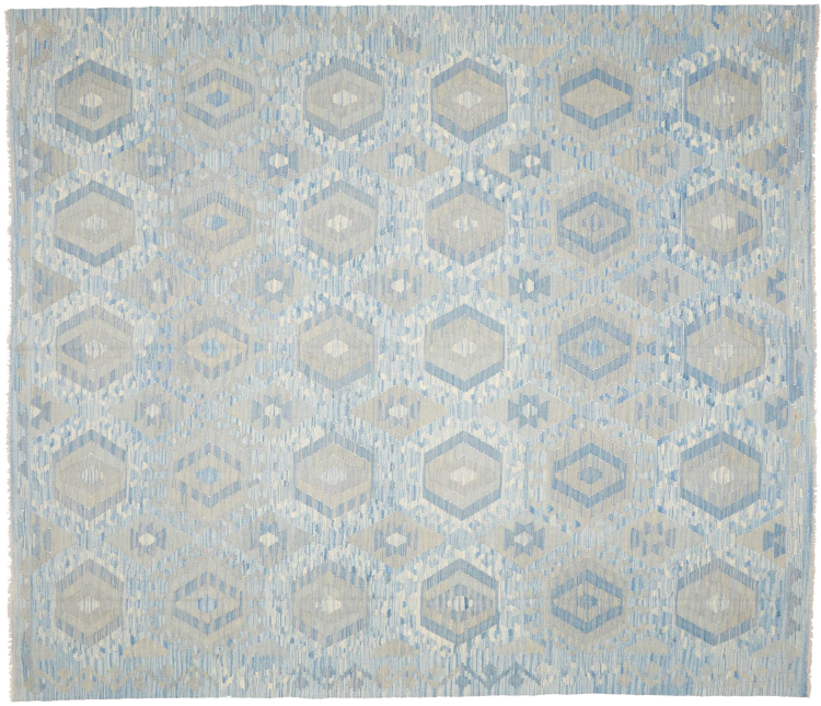 Esta alfombra fue hecha a mano en un telar como un tejido plano. Tejido plano es el término utilizado para describir las alfombras que no tienen pelo. Como el nombre promete, estas alfombras están tejidas y no anudadas. Esto resulta en una alfombra plana con una superficie estructurada. Los tejidos planos no son tan suaves y normalmente más delgados que las alfombras anudadas. Al mismo tiempo, su fabricación es mucho menos compleja y por lo general se pueden disponer por ambos lados (frontal y posterior). Sus patrones suelen ser geométricos, lo cual está determinado por el tejido.