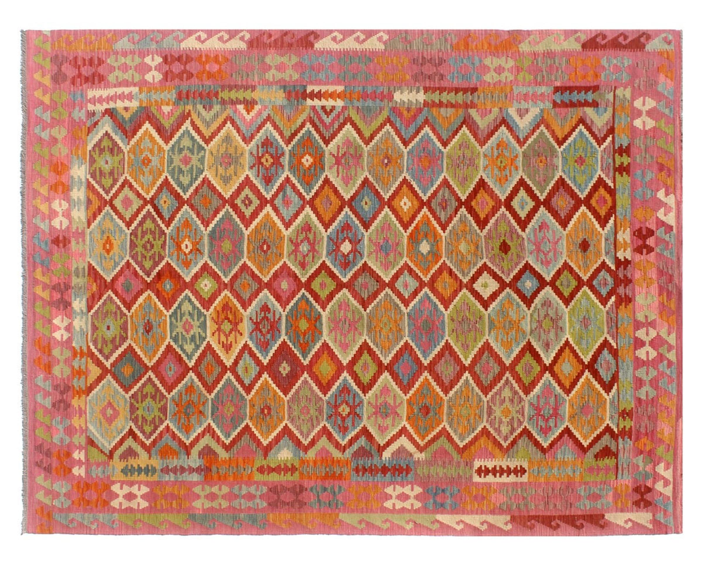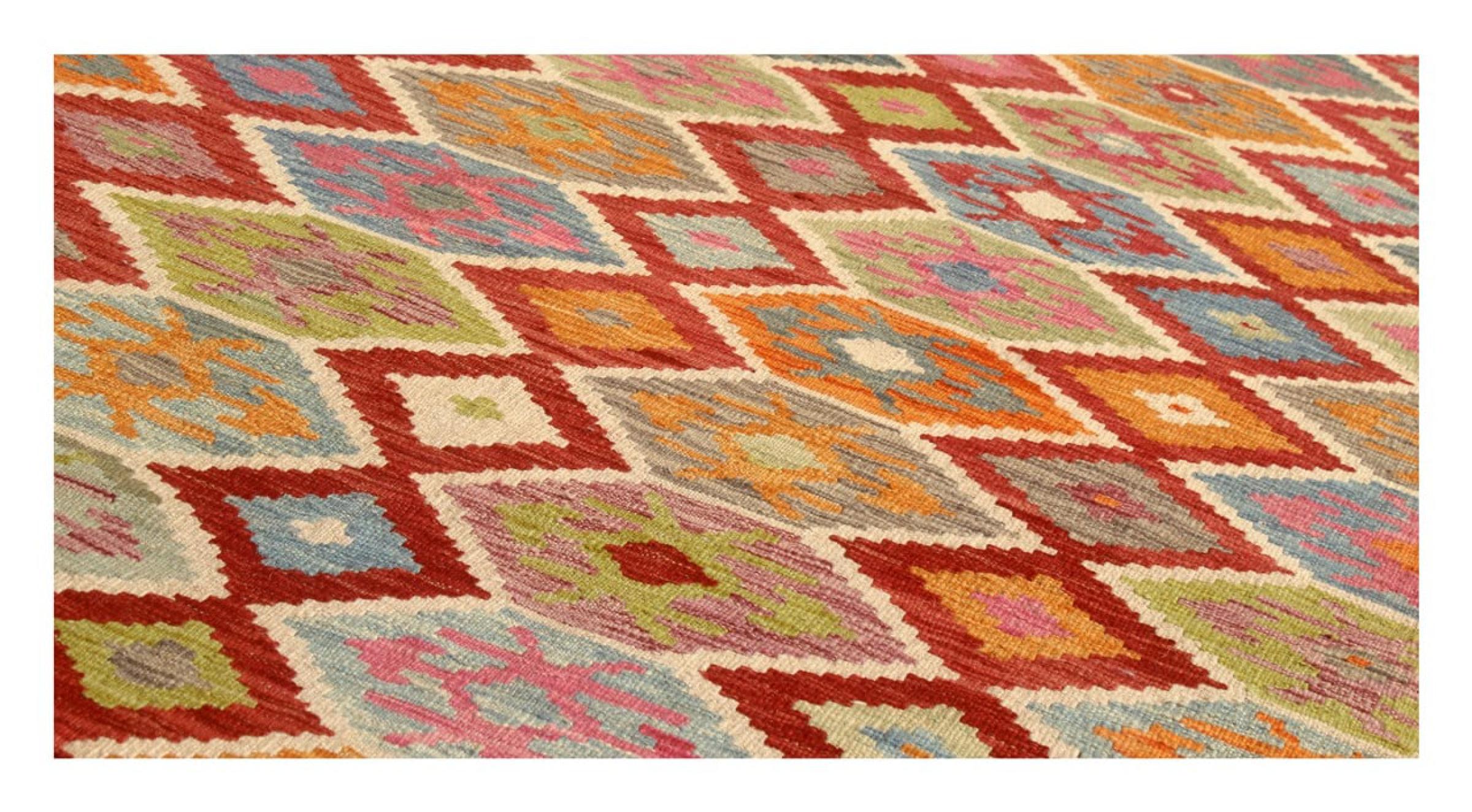 Estas alfombras kilim muestran una diferencia decisiva con las alfombras anudadas a mano - son tejidas a mano. Por lo tanto, no tienen un montón alto de lana y son a menudo más planos y más ásperos que las alfombras de lana anudada. Su fabricación es menos elaborada y por eso suelen ser mucho más baratas. Como ventaja, las alfombras de kilim son también mucho más ligeras y pueden ser colocadas por delante y por detrás. Los kilims tejidos a mano provienen originalmente de la antigua Persia y ahora también se fabrican a menudo en el Afganistán. Tienen patrones bastante simples y directos, que se deben a su técnica de tejido.