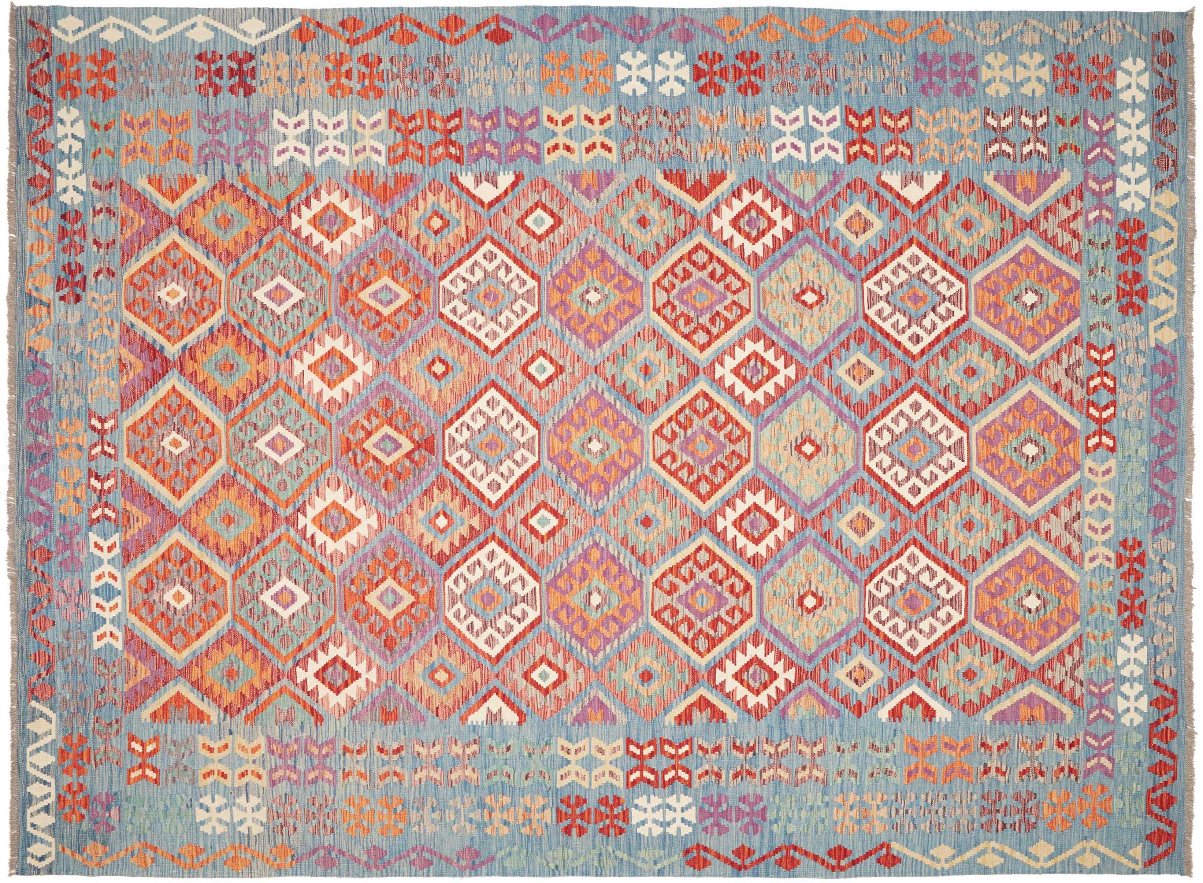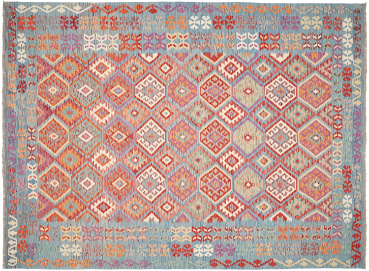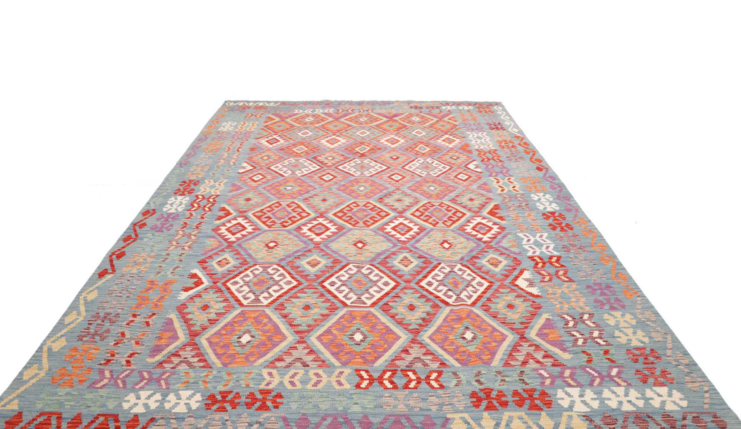 Estas alfombras kilim muestran una diferencia decisiva con las alfombras anudadas a mano - son tejidas a mano. Por lo tanto, no tienen un montón alto de lana y son a menudo más planos y más ásperos que las alfombras de lana anudada. Su fabricación es menos elaborada y por eso suelen ser mucho más baratas. Como ventaja, las alfombras de kilim son también mucho más ligeras y pueden ser colocadas por delante y por detrás. Los kilims tejidos a mano provienen originalmente de la antigua Persia y ahora también se fabrican a menudo en el Afganistán. Tienen patrones bastante simples y directos, que se deben a su técnica de tejido.