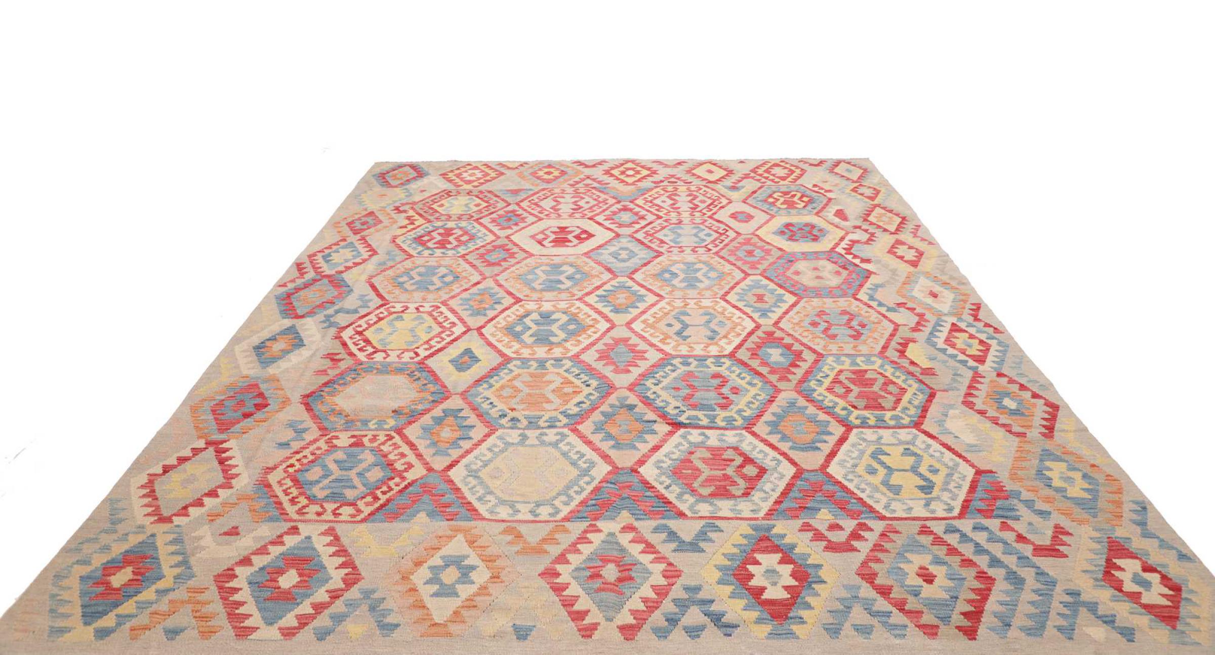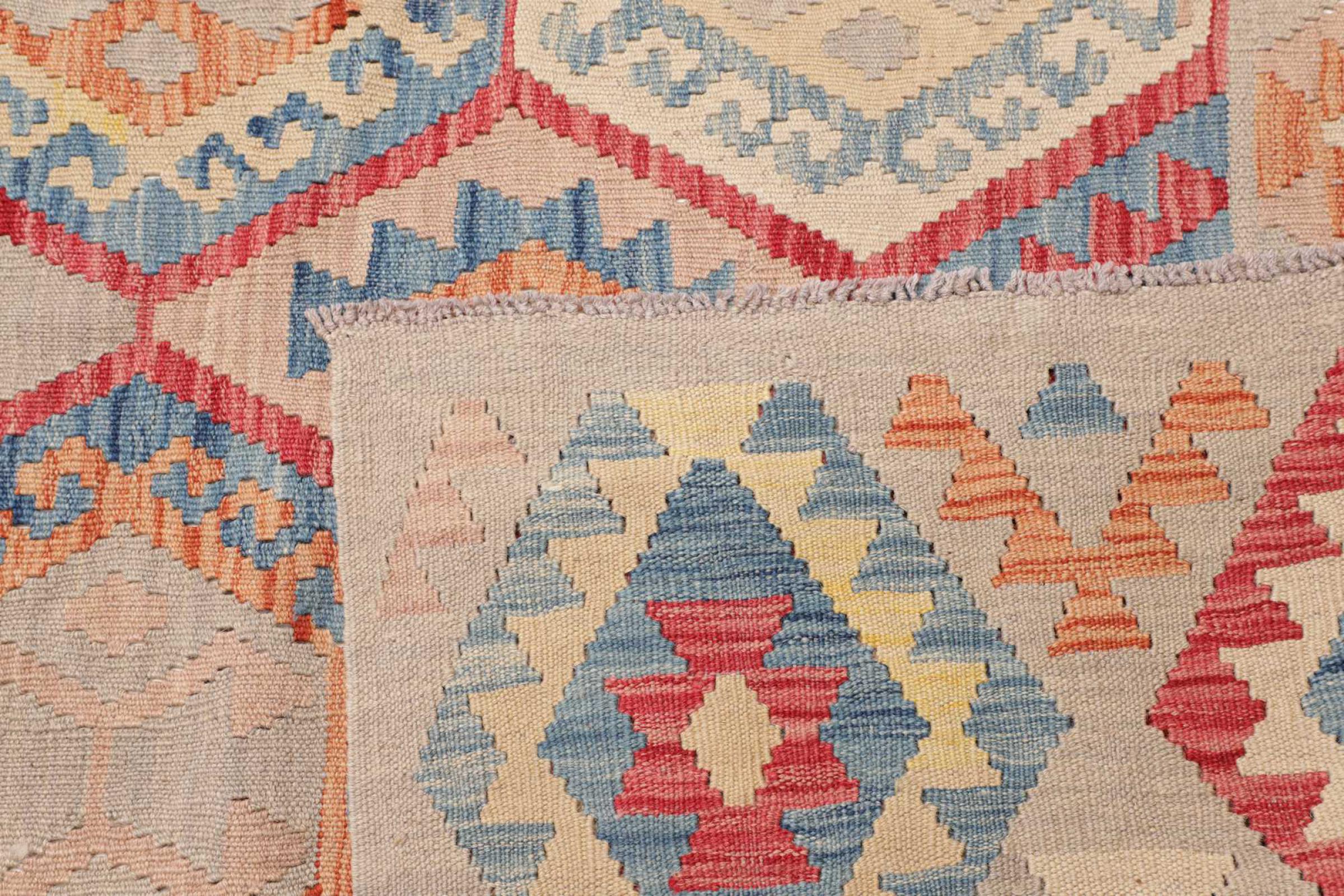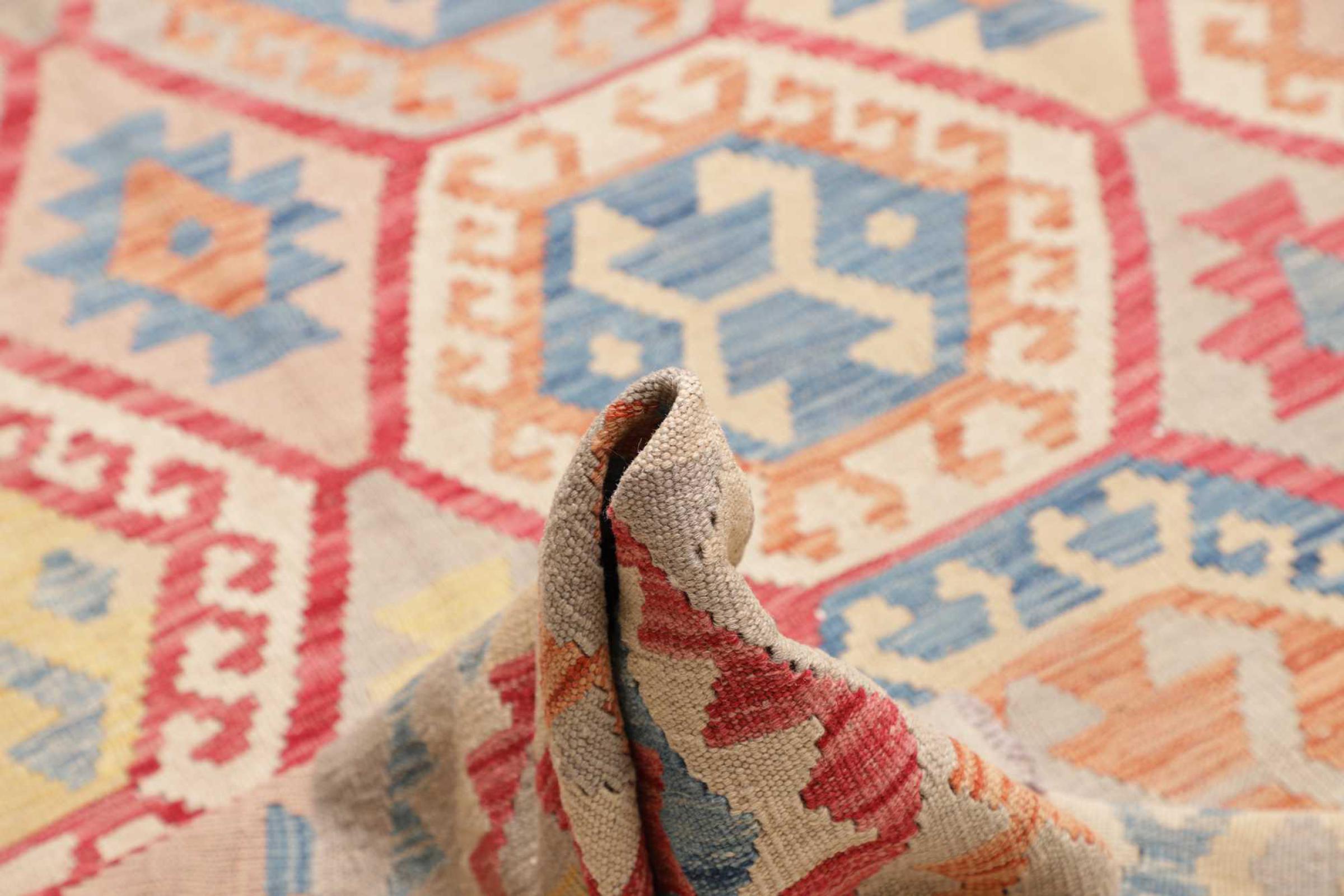 Estas alfombras kilim muestran una diferencia decisiva con las alfombras anudadas a mano - son tejidas a mano. Por lo tanto, no tienen un montón alto de lana y son a menudo más planos y más ásperos que las alfombras de lana anudada. Su fabricación es menos elaborada y por eso suelen ser mucho más baratas. Como ventaja, las alfombras de kilim son también mucho más ligeras y pueden ser colocadas por delante y por detrás. Los kilims tejidos a mano provienen originalmente de la antigua Persia y ahora también se fabrican a menudo en el Afganistán. Tienen patrones bastante simples y directos, que se deben a su técnica de tejido.