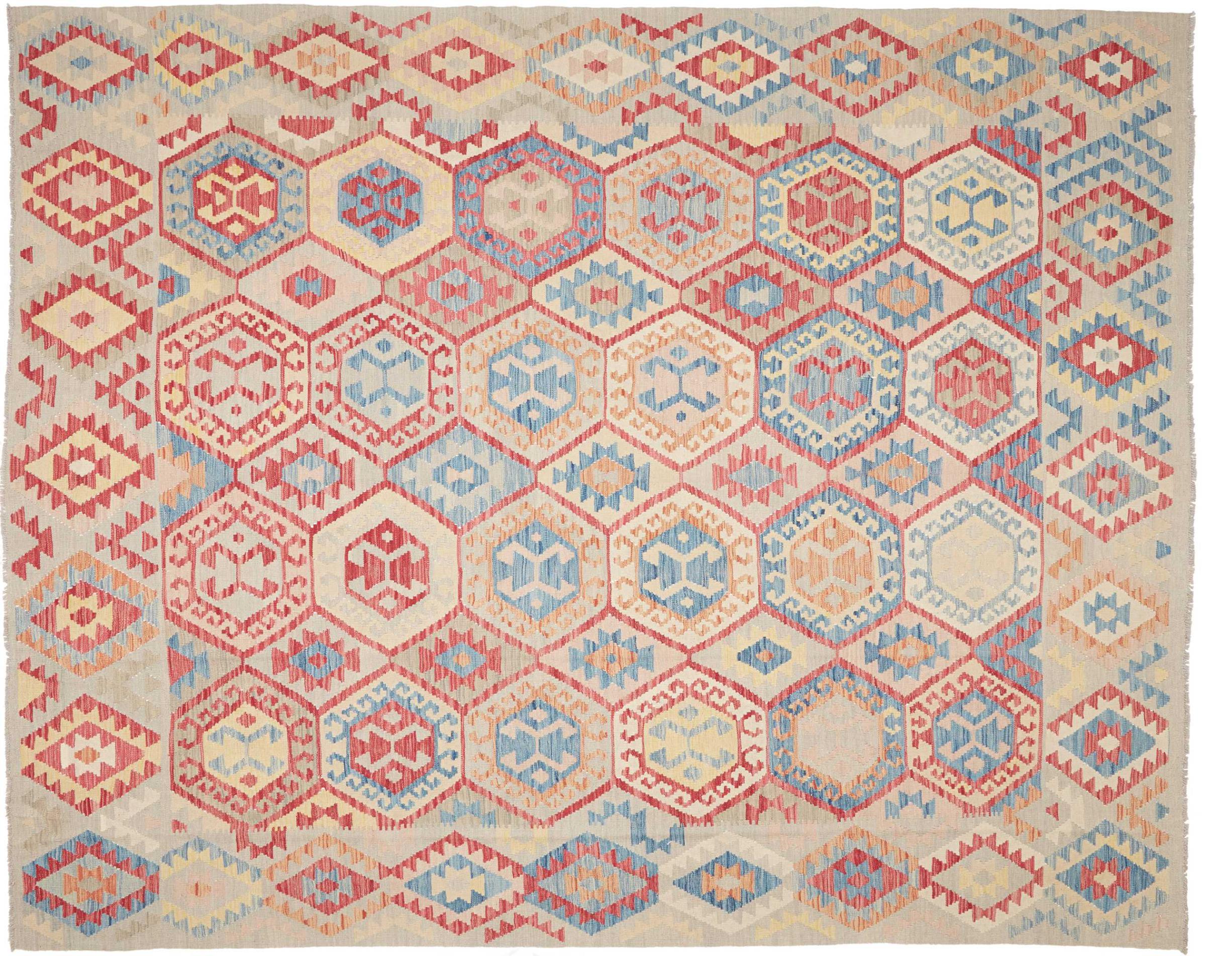 Esta alfombra fue hecha a mano en un telar como un tejido plano. Tejido plano es el término utilizado para describir las alfombras que no tienen pelo. Como el nombre promete, estas alfombras están tejidas y no anudadas. Esto resulta en una alfombra plana con una superficie estructurada. Los tejidos planos no son tan suaves y normalmente más delgados que las alfombras anudadas. Al mismo tiempo, su fabricación es mucho menos compleja y por lo general se pueden disponer por ambos lados (frontal y posterior). Sus patrones suelen ser geométricos, lo cual está determinado por el tejido.