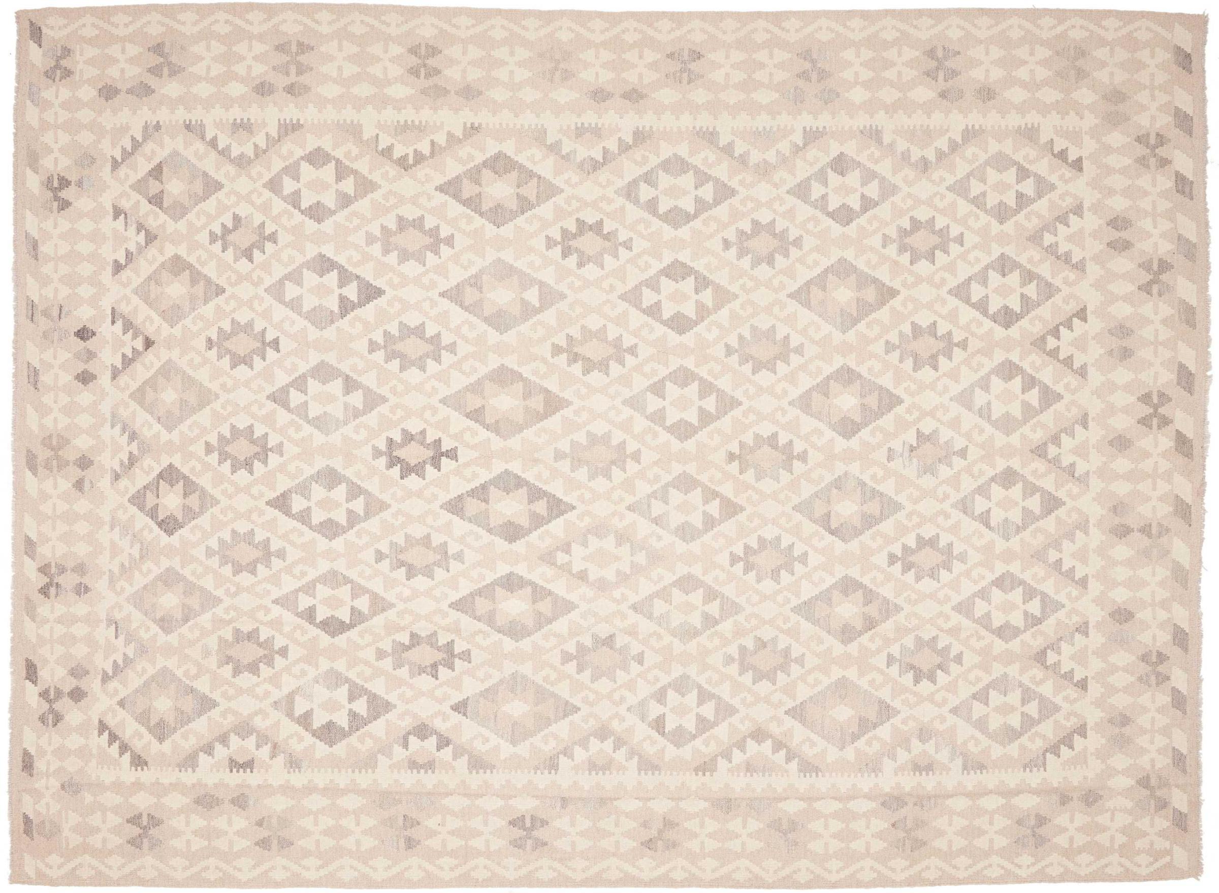 Esta alfombra fue hecha a mano en un telar como un tejido plano. Tejido plano es el término utilizado para describir las alfombras que no tienen pelo. Como el nombre promete, estas alfombras están tejidas y no anudadas. Esto resulta en una alfombra plana con una superficie estructurada. Los tejidos planos no son tan suaves y normalmente más delgados que las alfombras anudadas. Al mismo tiempo, su fabricación es mucho menos compleja y por lo general se pueden disponer por ambos lados (frontal y posterior). Sus patrones suelen ser geométricos, lo cual está determinado por el tejido.