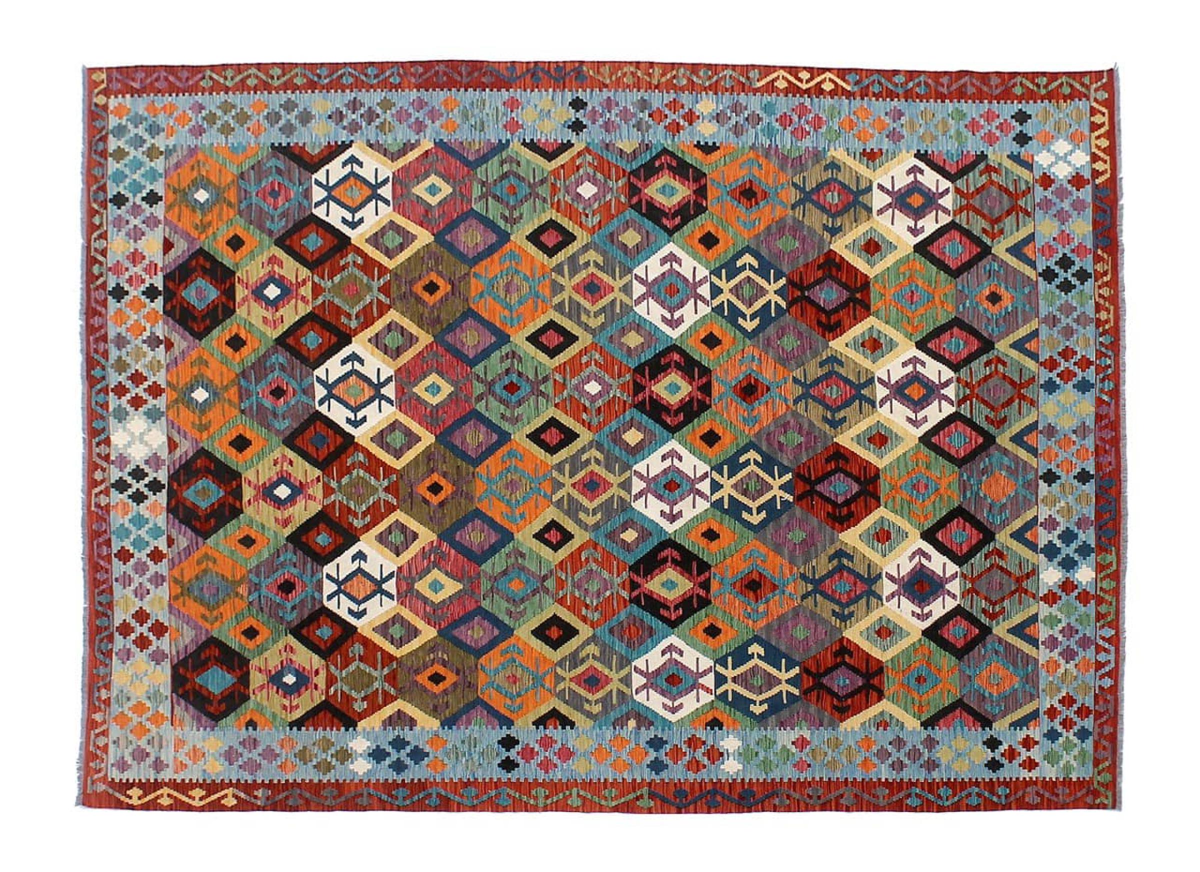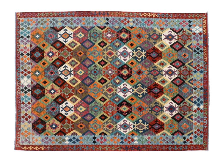 Estas alfombras kilim muestran una diferencia decisiva con las alfombras anudadas a mano - son tejidas a mano. Por lo tanto, no tienen un montón alto de lana y son a menudo más planos y más ásperos que las alfombras de lana anudada. Su fabricación es menos elaborada y por eso suelen ser mucho más baratas. Como ventaja, las alfombras de kilim son también mucho más ligeras y pueden ser colocadas por delante y por detrás. Los kilims tejidos a mano provienen originalmente de la antigua Persia y ahora también se fabrican a menudo en el Afganistán. Tienen patrones bastante simples y directos, que se deben a su técnica de tejido.