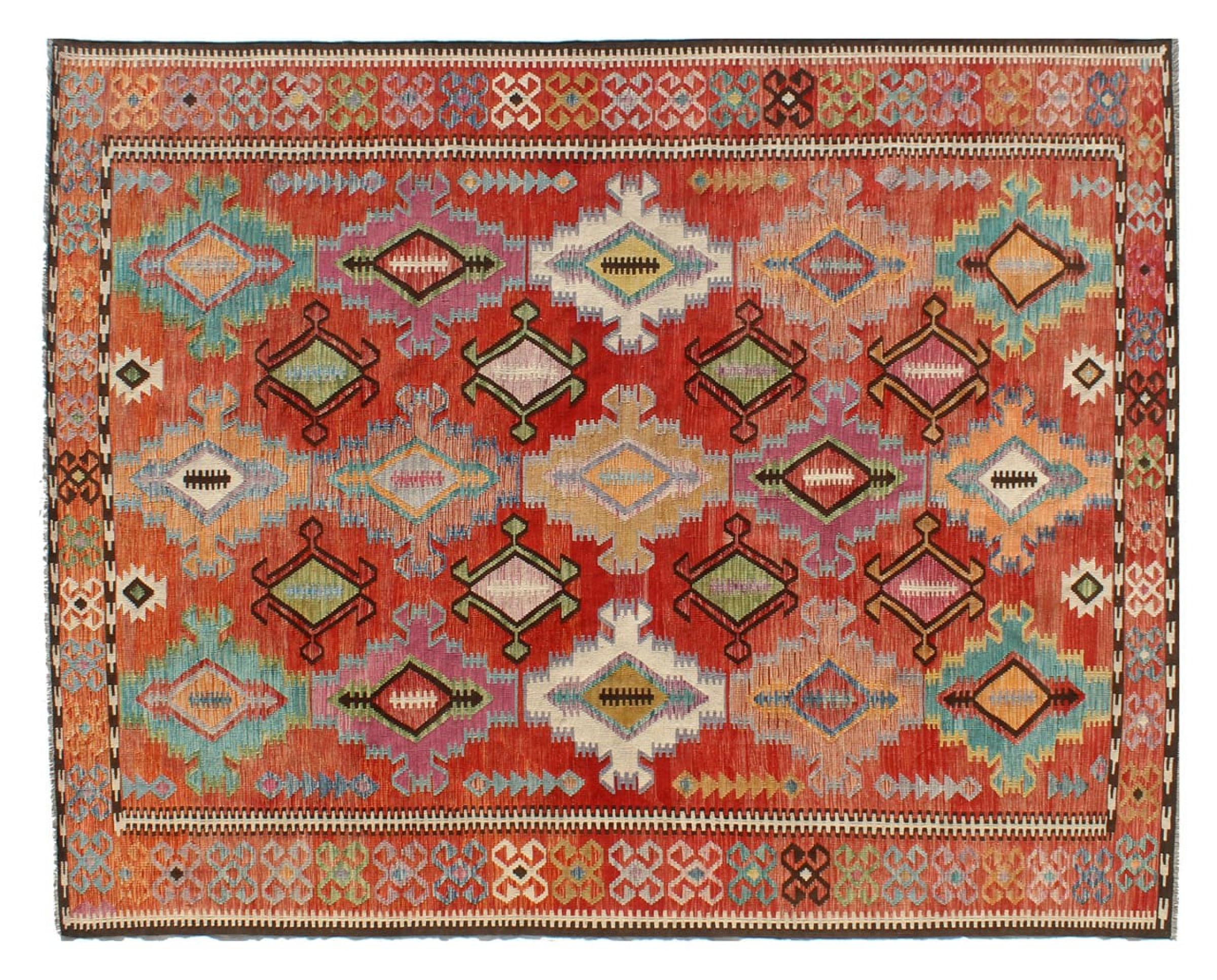 Estas alfombras kilim muestran una diferencia decisiva con las alfombras anudadas a mano - son tejidas a mano. Por lo tanto, no tienen un montón alto de lana y son a menudo más planos y más ásperos que las alfombras de lana anudada. Su fabricación es menos elaborada y por eso suelen ser mucho más baratas. Como ventaja, las alfombras de kilim son también mucho más ligeras y pueden ser colocadas por delante y por detrás. Los kilims tejidos a mano provienen originalmente de la antigua Persia y ahora también se fabrican a menudo en el Afganistán. Tienen patrones bastante simples y directos, que se deben a su técnica de tejido.